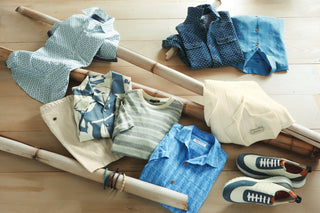 Five folded shirts in red, white, green, blue, and gray on a textured brown background