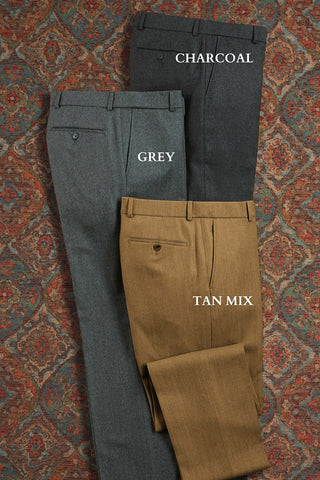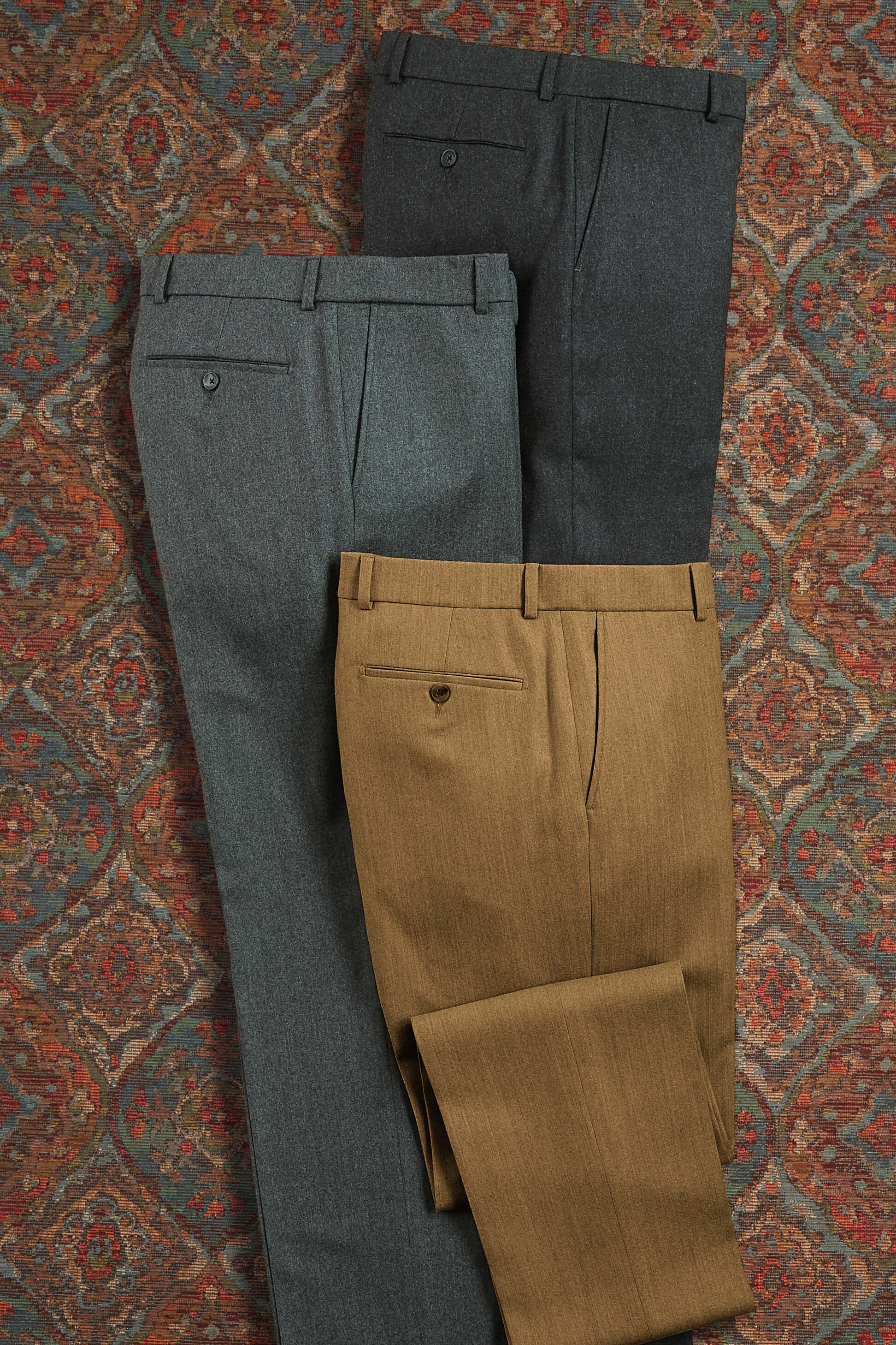 Luxe, Italian 90% wool/10% cashmere. Signature Comfort "Eze" construction, traditional fit, flat front, eighth-top pockets, button-through welt back pockets, half front lining. Unfinished hem, 16" opening at hem.