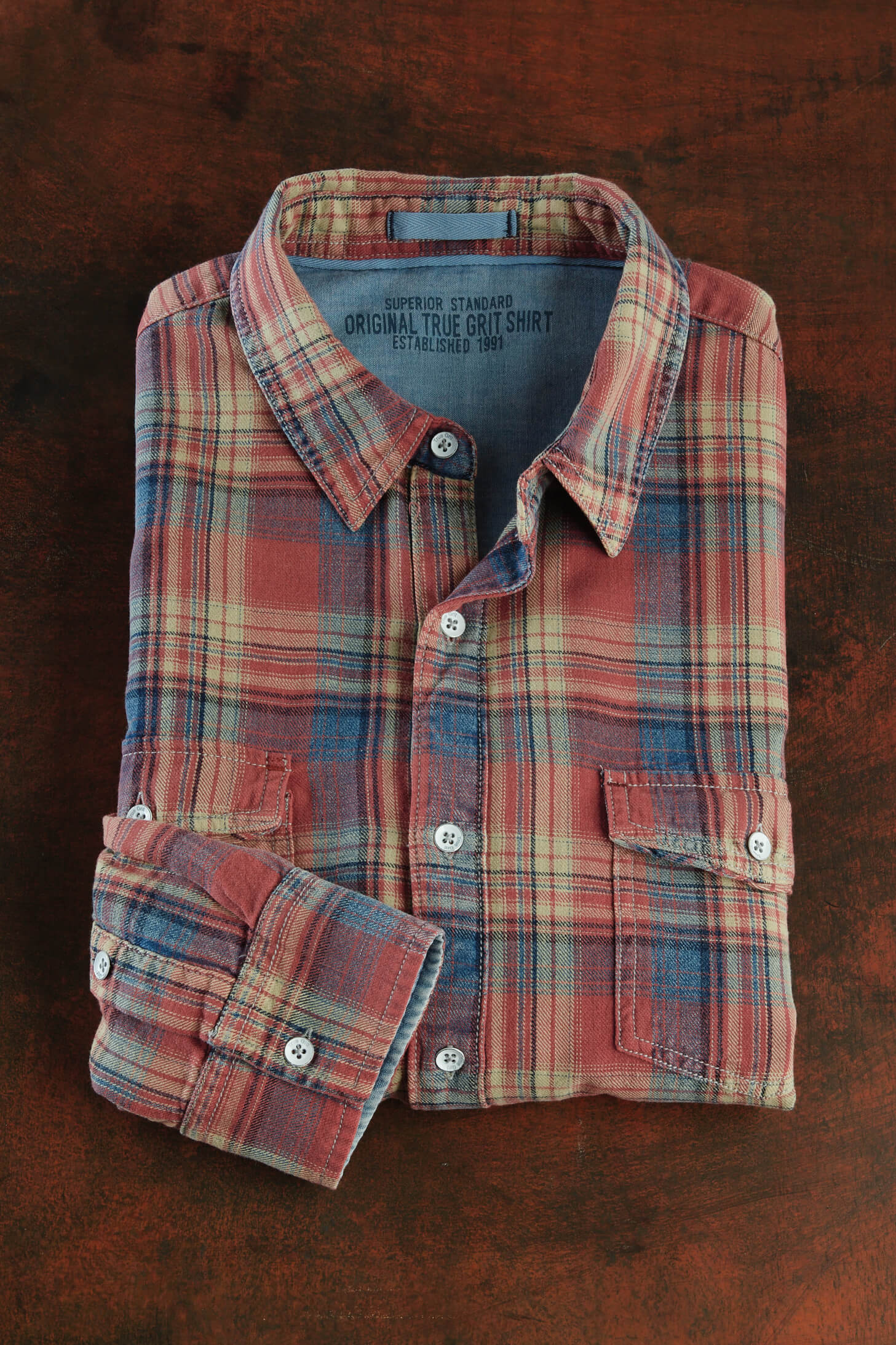 Easy-going in comfortable, 100% cotton. Long sleeves, spread collar, button-flap chest pockets, shirttail hem, contrast chambray inside collar and cuffs, shirttail hem.