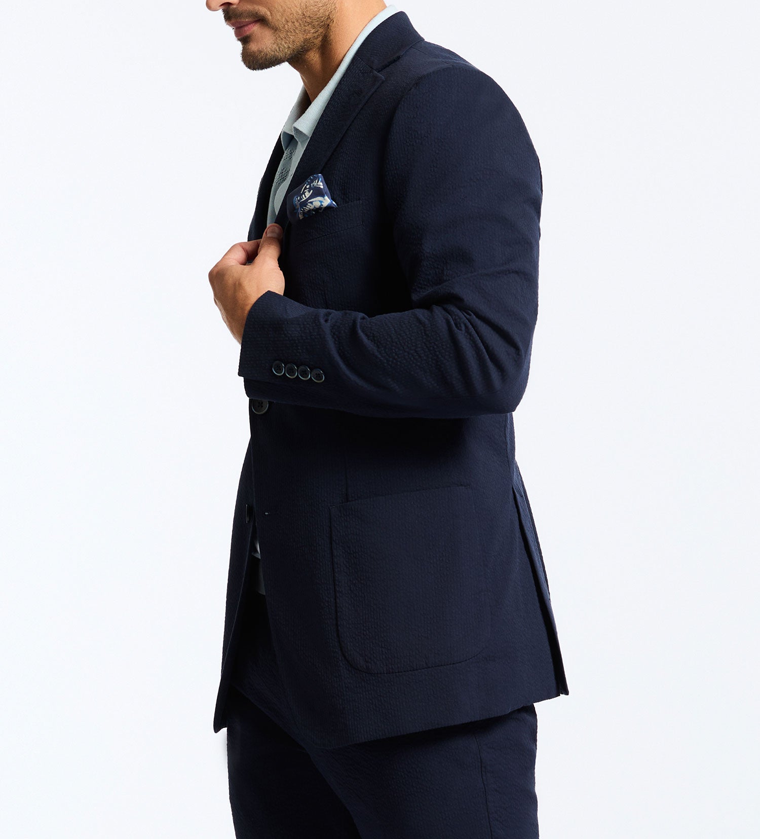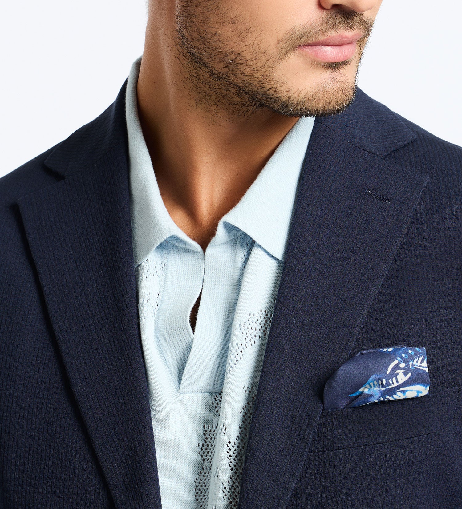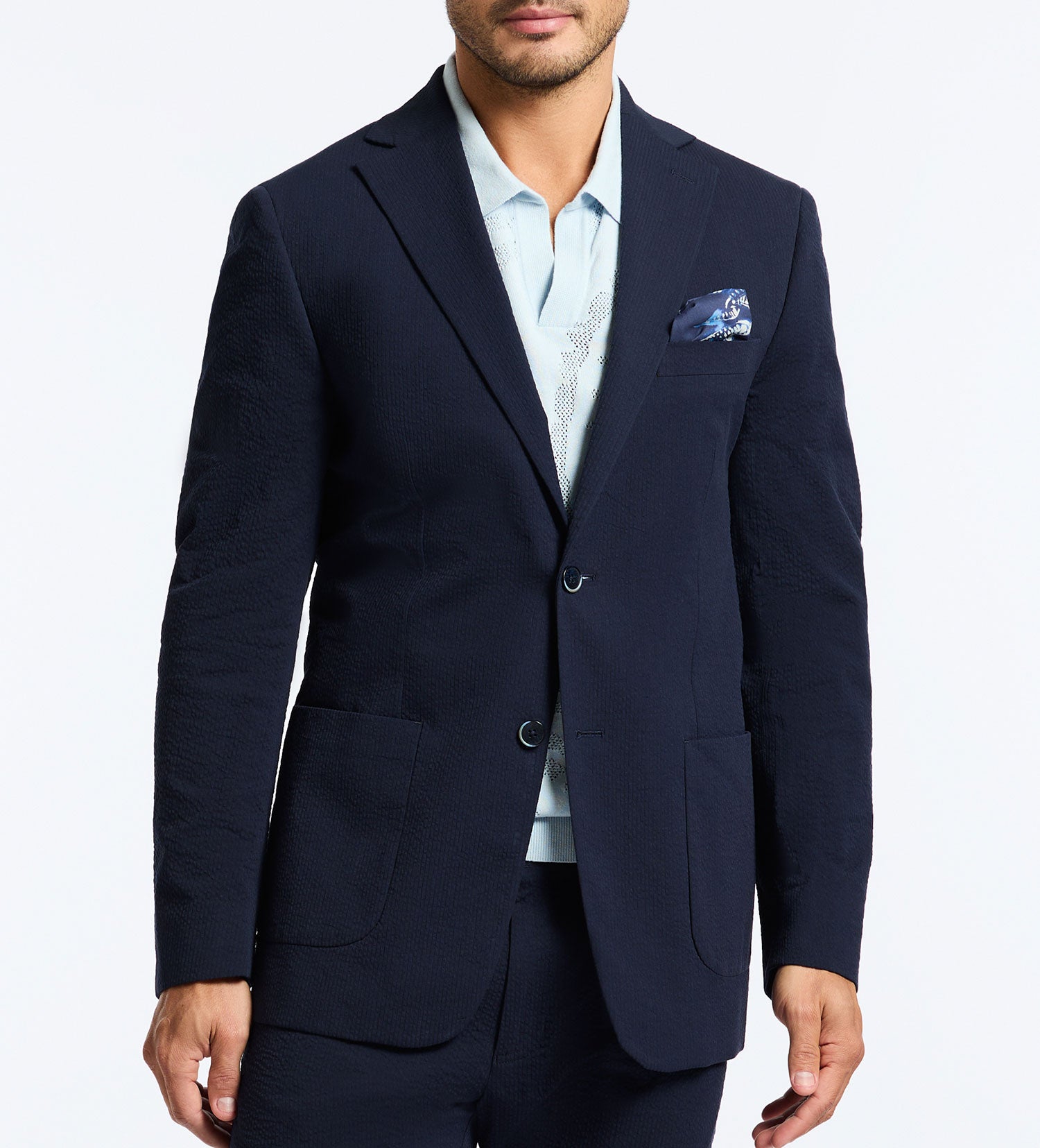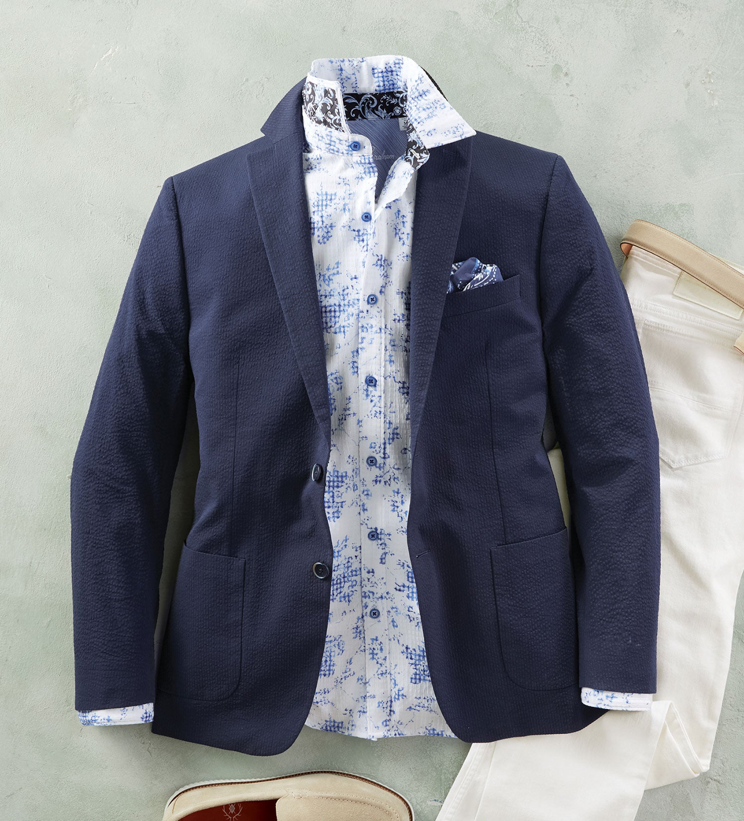 Comfortable 98% cotton/2% Lycra® spandex. Two buttons, side vents, patch pockets, floral half lining. Dry clean. Imported.