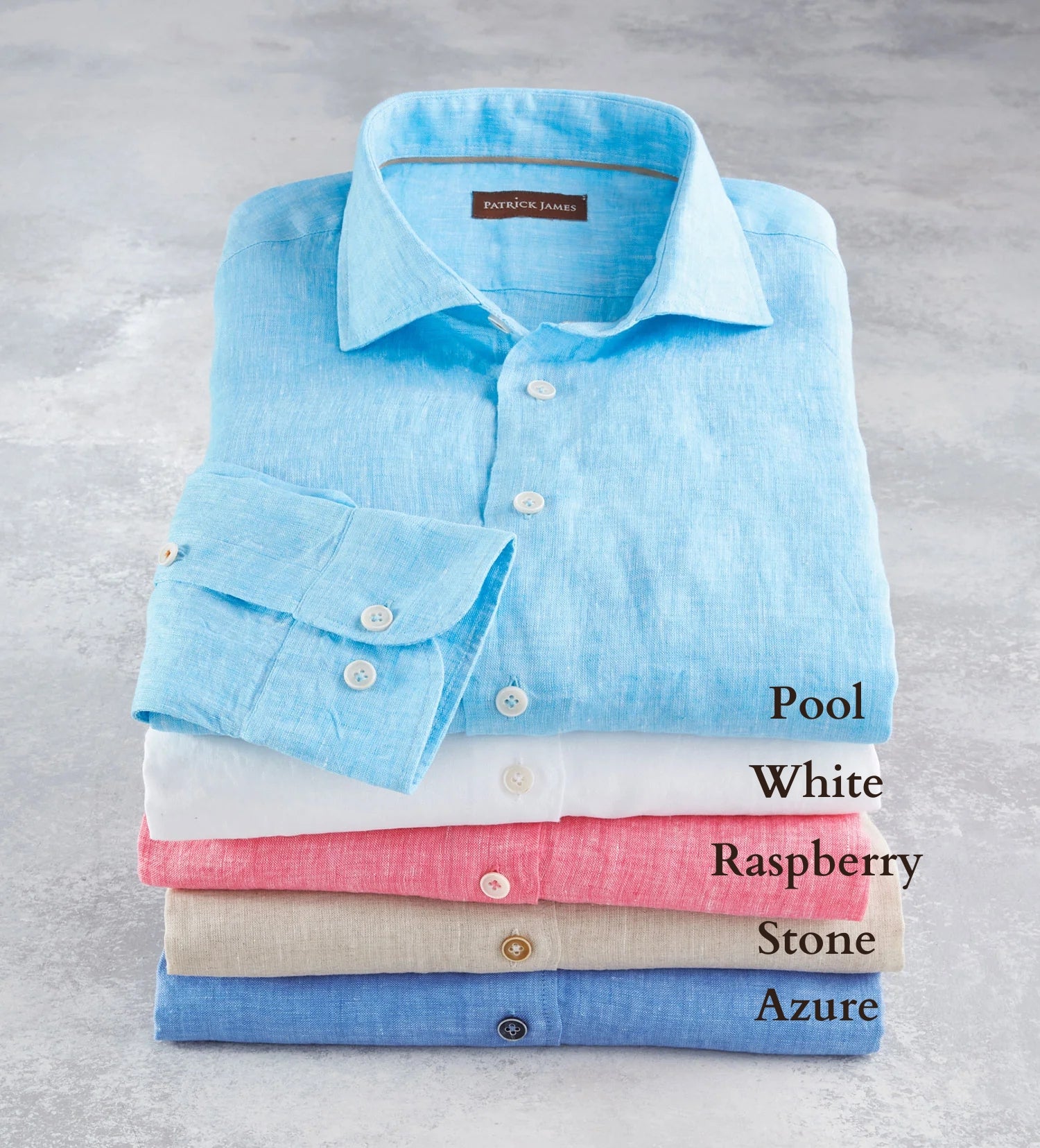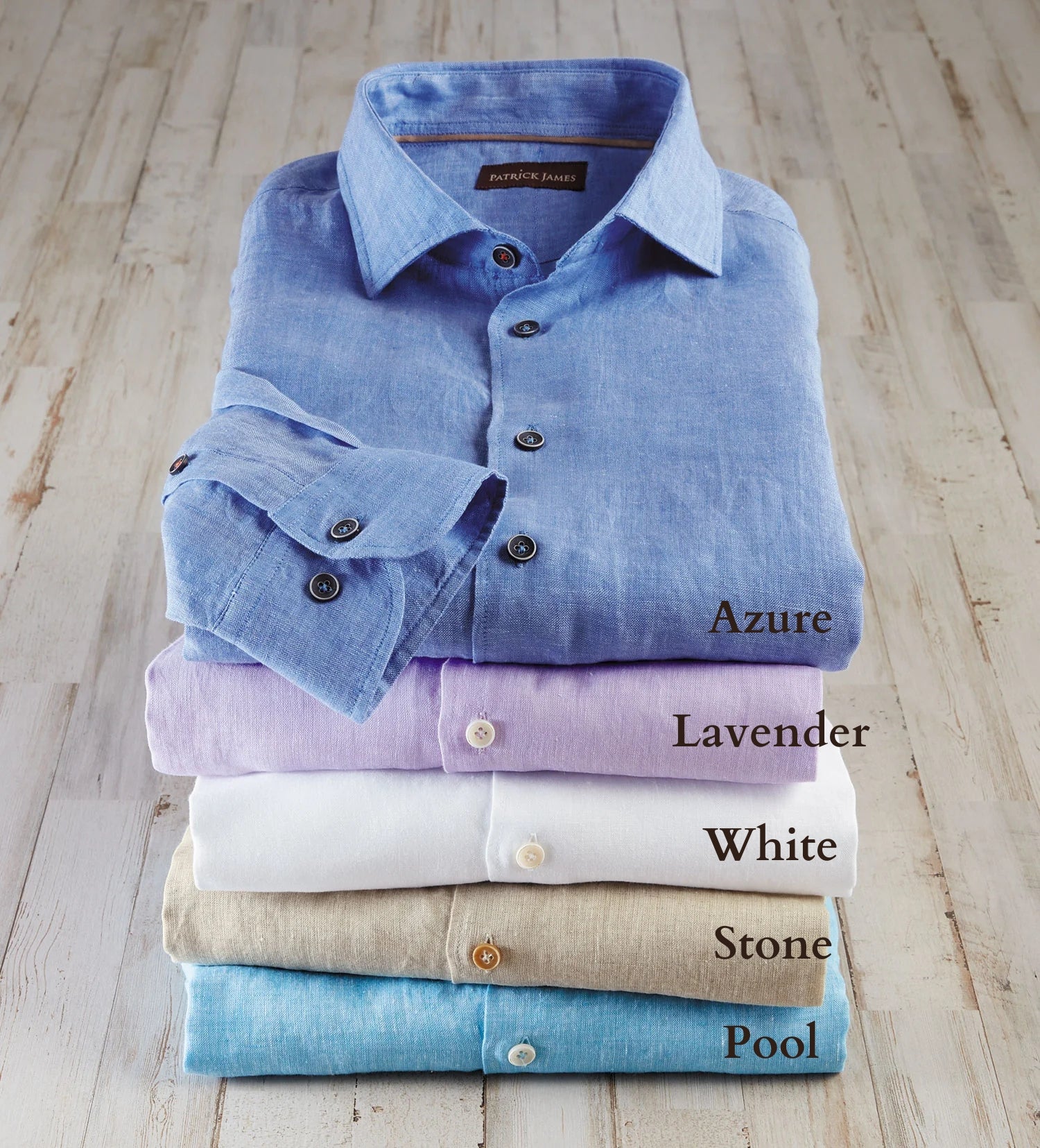 True Italian 100% linen, garment-washed for a lived-in look and feel. Long sleeves, spread collar, shirttail hem. Machine wash.