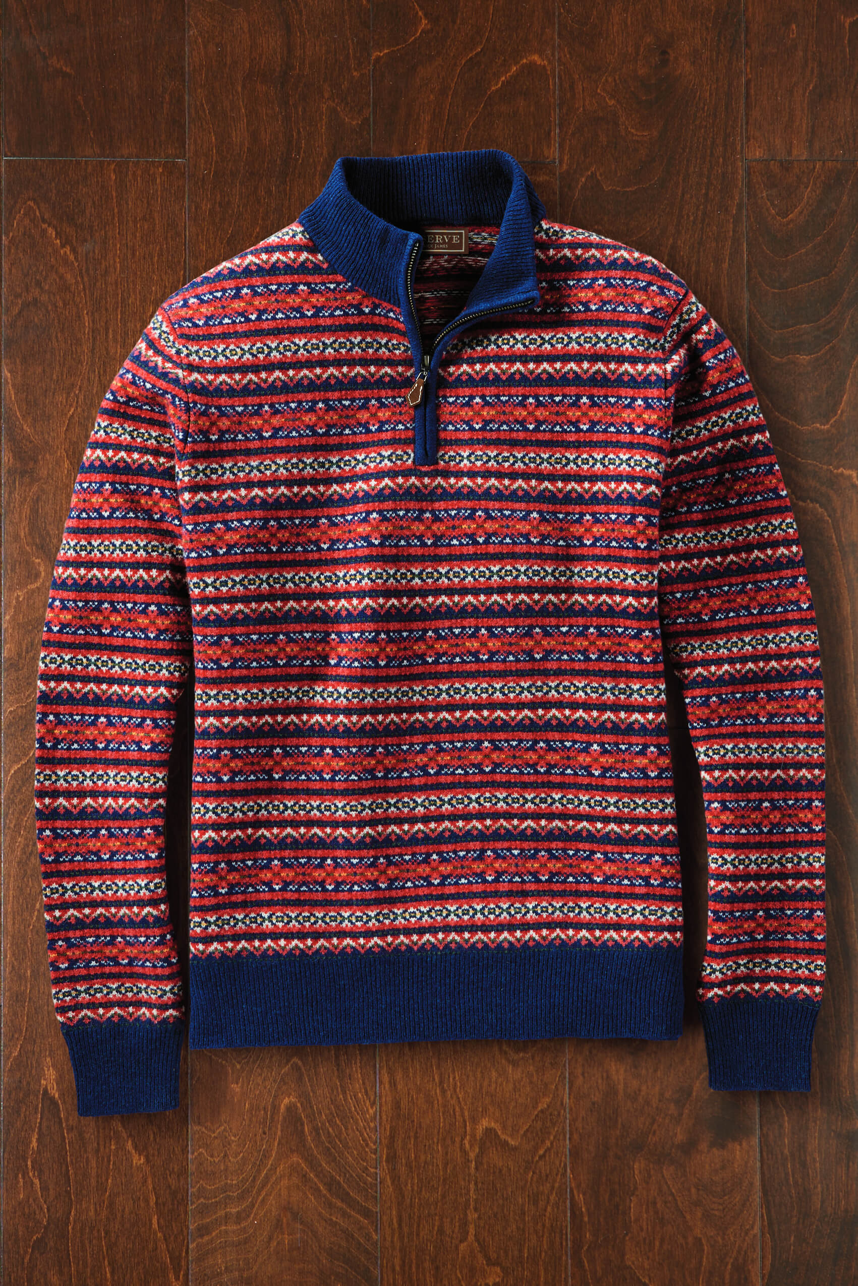 Intricate all-over pattern in cozy 100% lambswool. Quarter zip, contrast ribbed mock neck, cuffs and waist. Hand wash or dry clean. Imported.