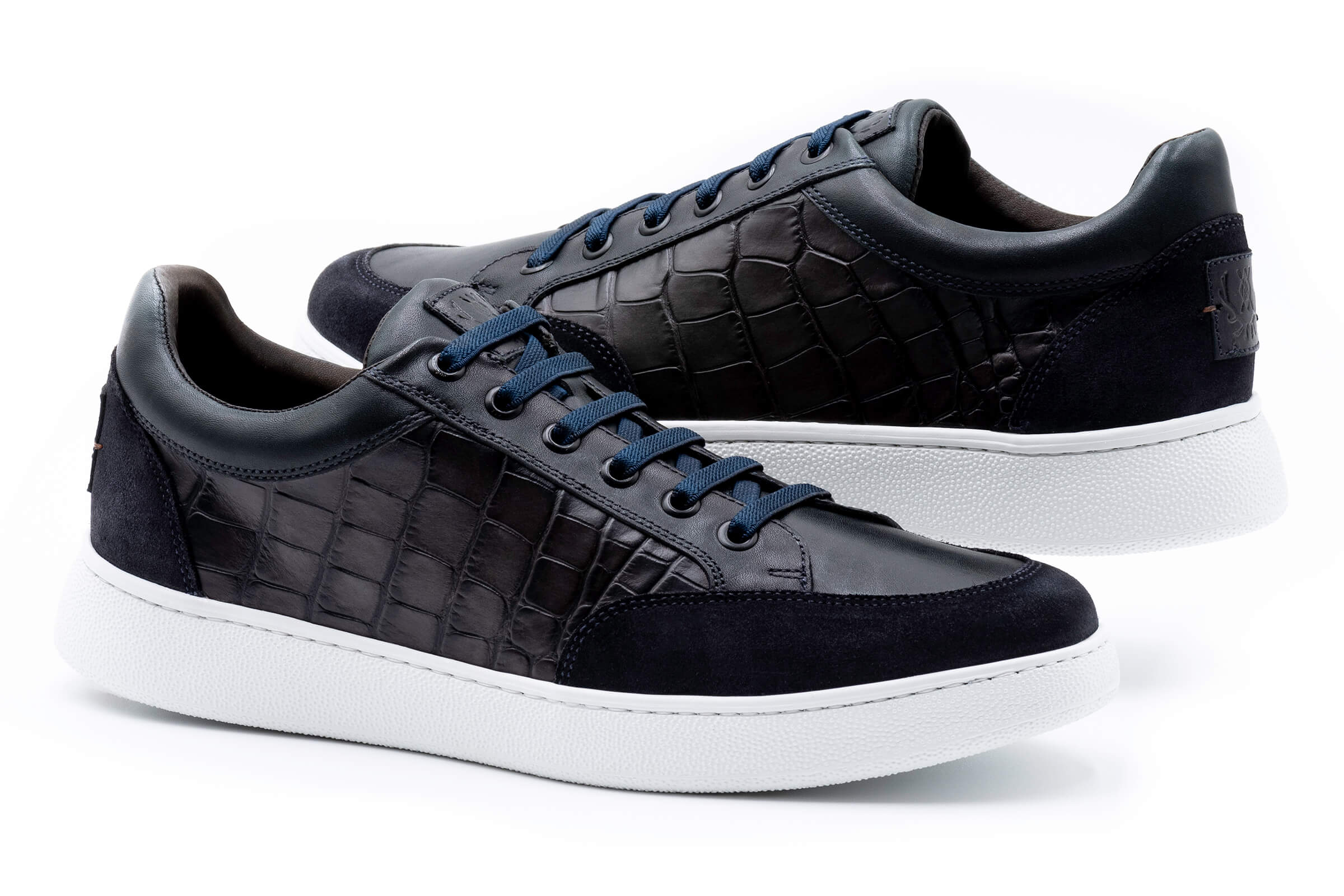 Hand-finished, alligator grain leather. Elastic no-tie laces, heel-to-toe comfort system, glove leather lining, extra light rubber sole, handcrafted on Carson last.