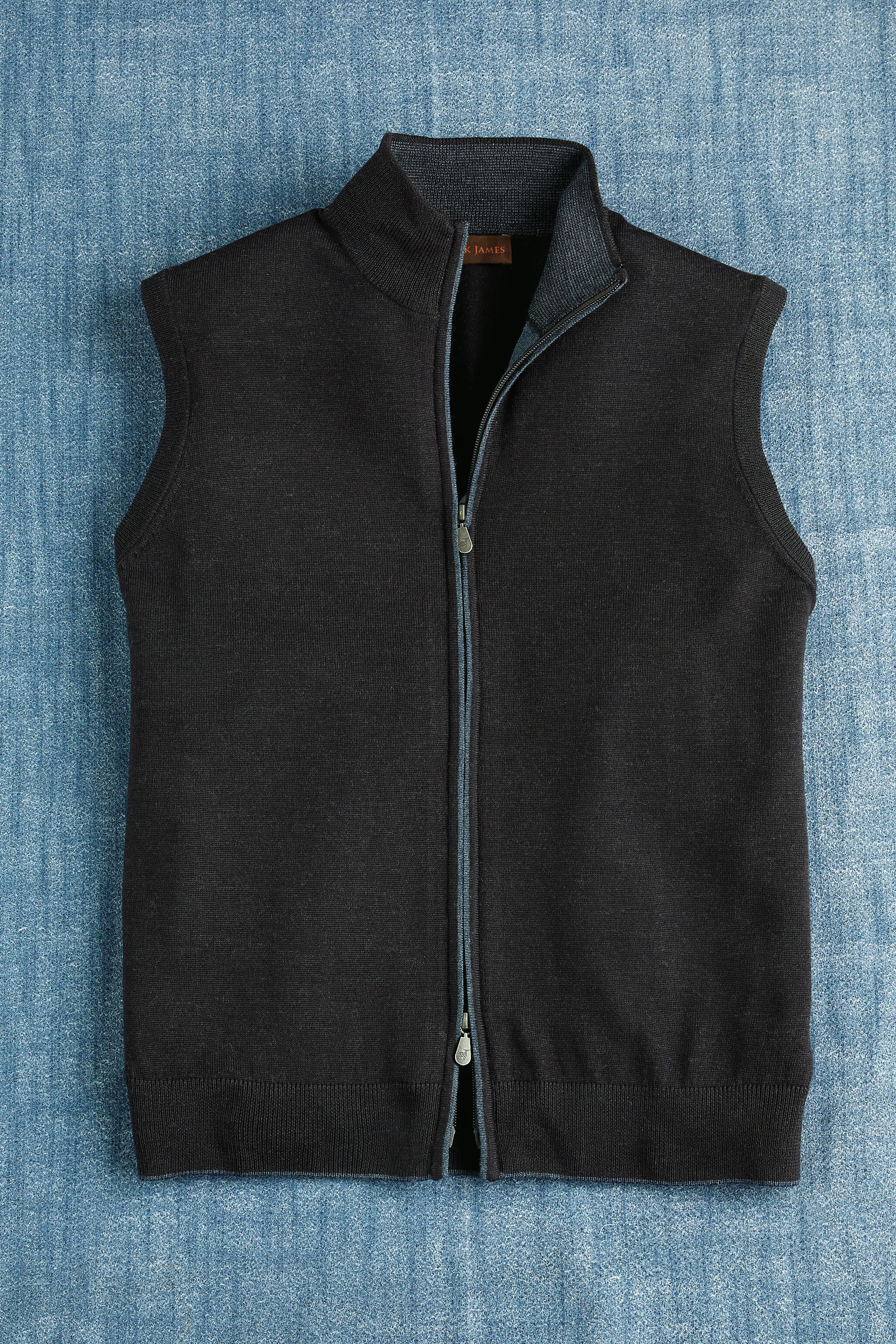 Luxe, 12-gauge knit of Italian Biella, 100% merino wool. Two-way zip, contrast tipping, ribbed mock neck and waist.
