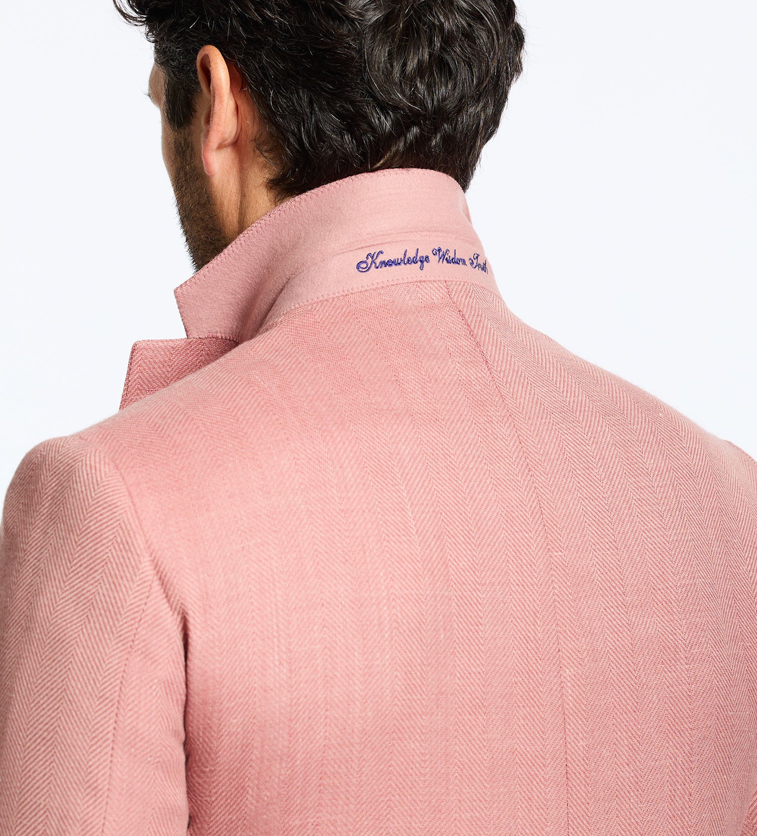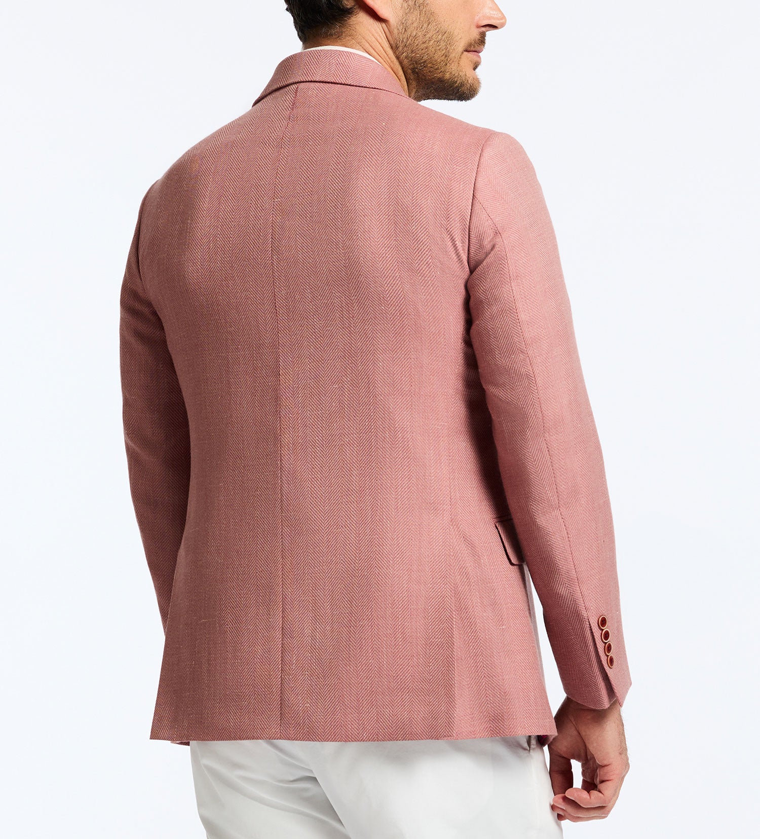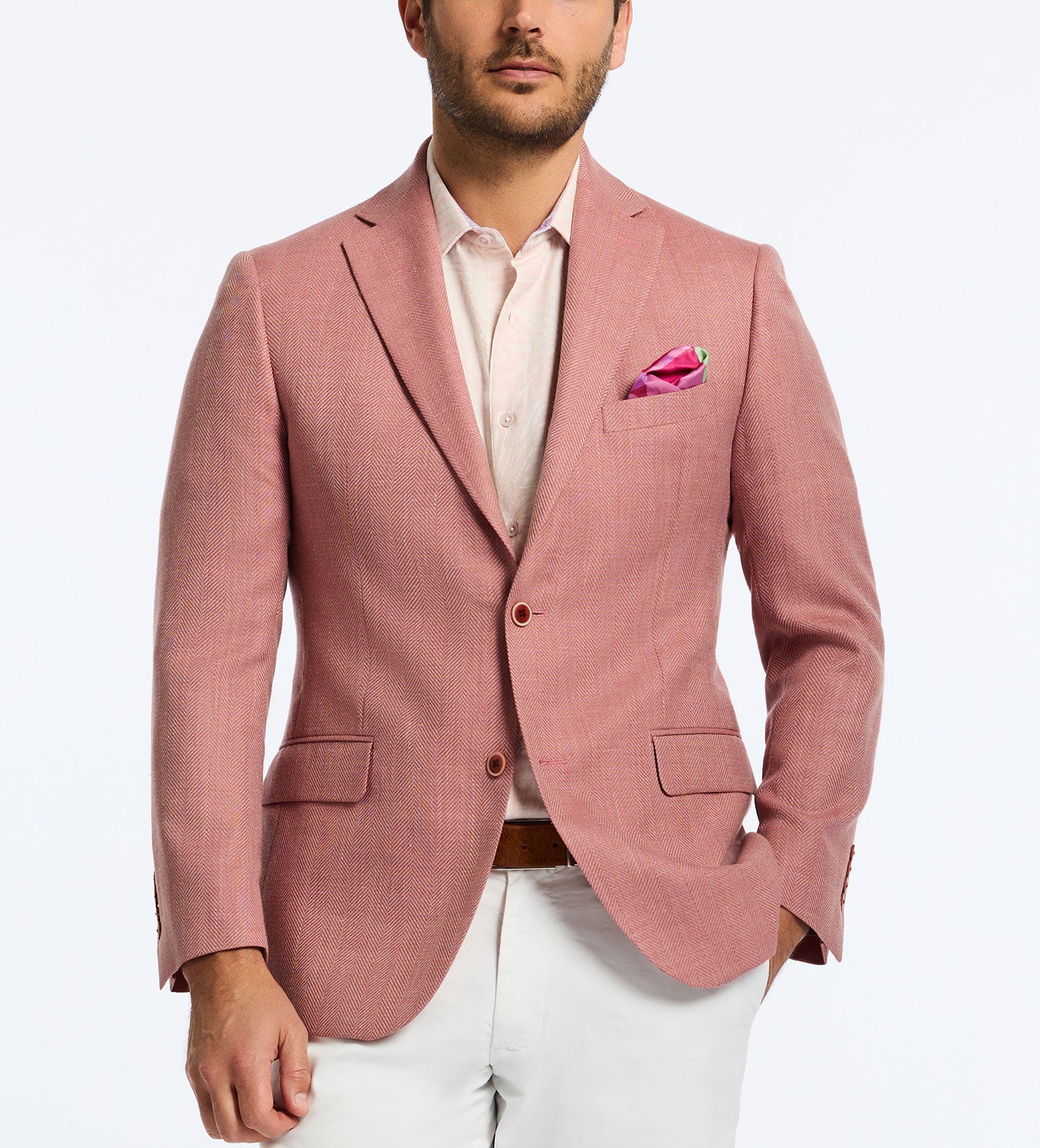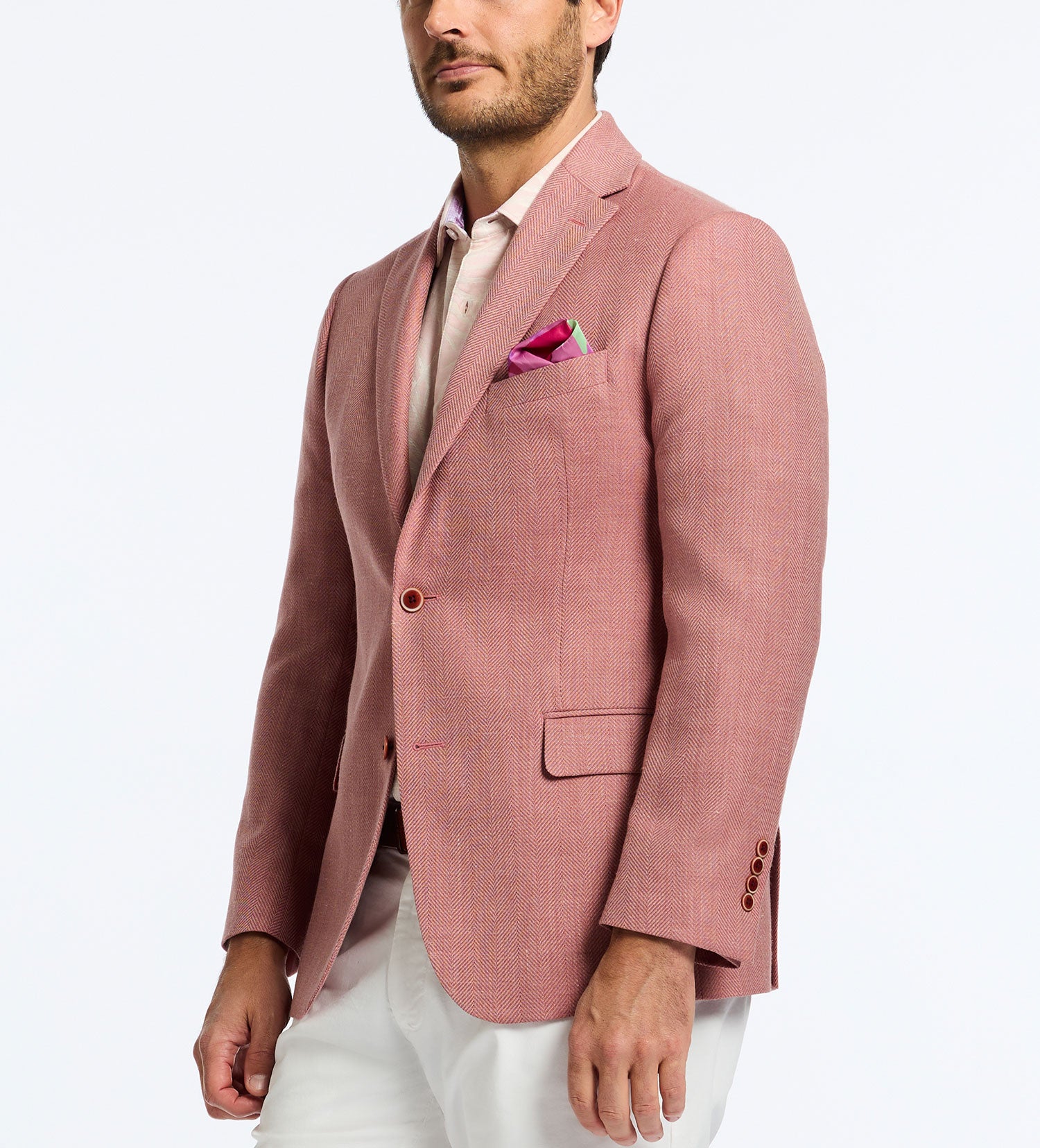 Herringbone weave of 54% wool/40% polyester/6% linen. Two buttons, side vents, notch lapel, tropical sunset print full lining and pull-out pocket square. Dry clean. Imported.