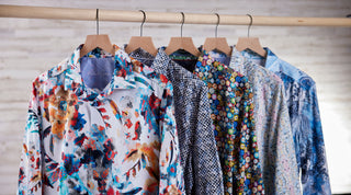 Dramatic and elegant in fine 100% cotton. Embroidery accents, long sleeves, point collar, shirttail hem, contrast print inside collar and cuffs, wine red buttons. Machine wash. Imported.