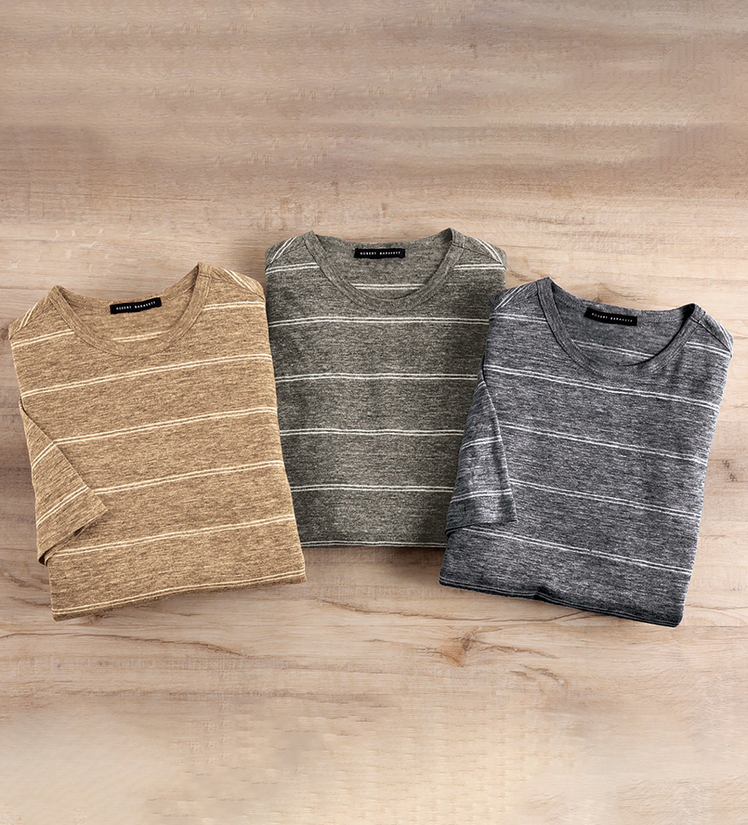 Two-tone yarns of premium 52% linen/48% polyester, garment-washed for comfort. Crew neck, short sleeves, straight hem, side vents. Hand wash. Imported.