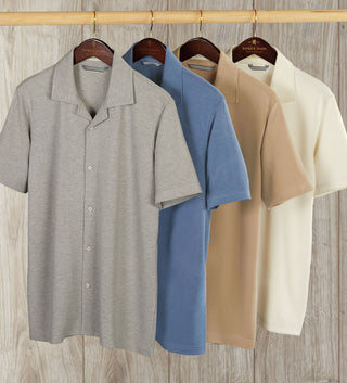 Pique double knit of 66% viscose and 34% polyester. Cool, soft, breathable, wrinkle-resistant. Short sleeves, camp collar, straight hem. Machine wash. Imported.