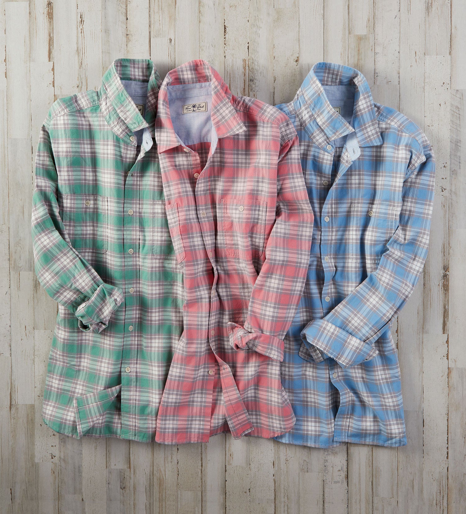 Ultra lightweight, summer flannel of softest 98% cotton/2% spandex. Long sleeves, spread collar, button-through chest pockets, shirttail hem, blue chambray inside collar and yoke. Machine wash. Imported.