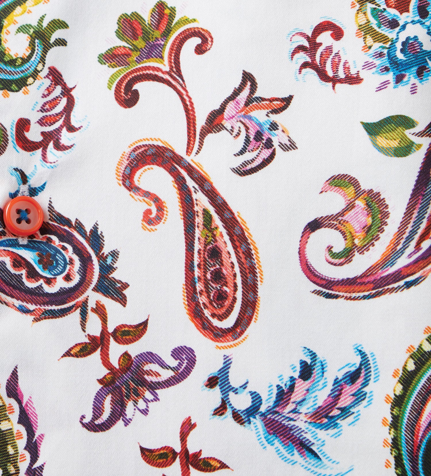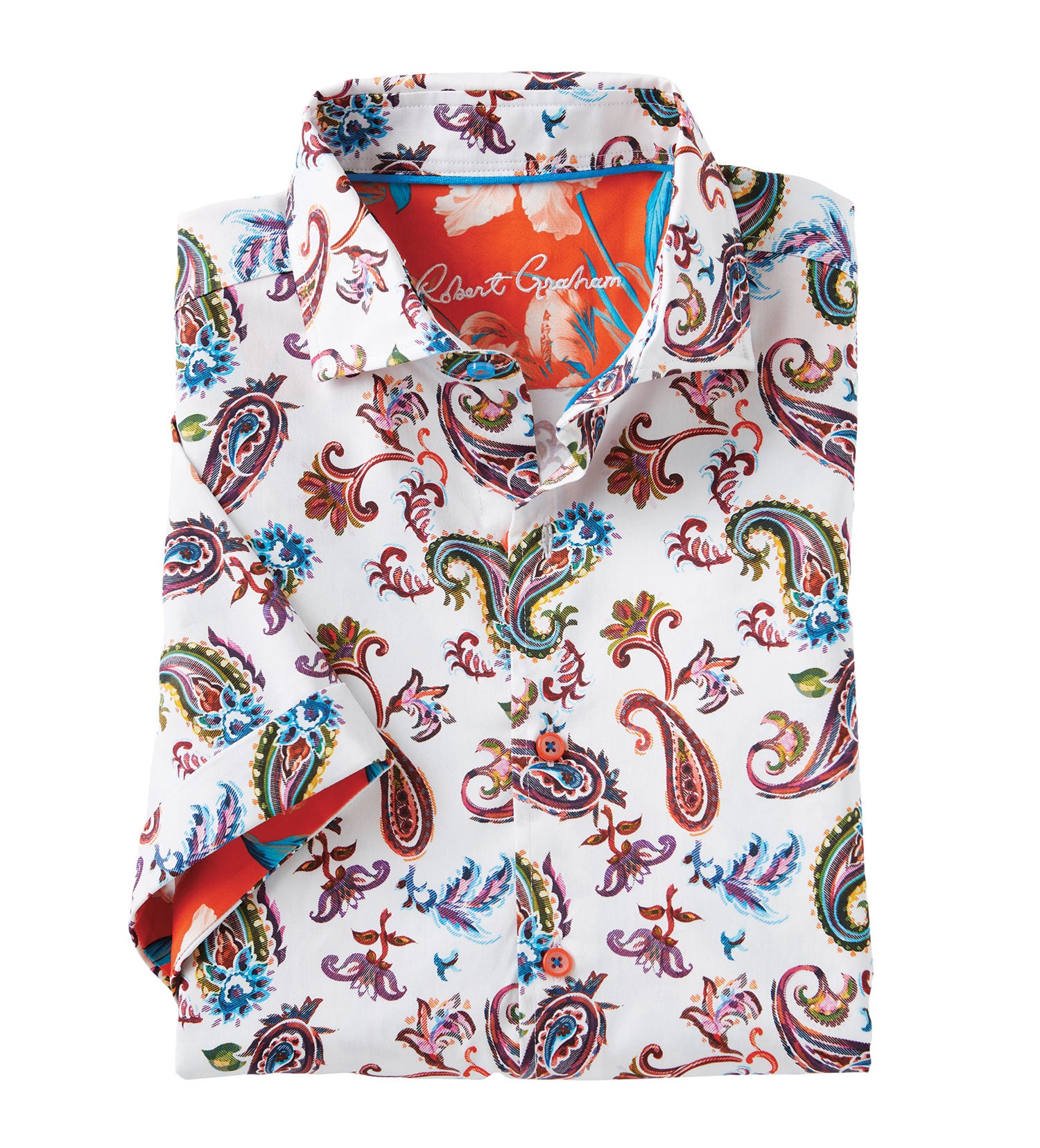 Vibrant, summertime paisley on 97% cotton/3% spandex. Short cuffed sleeves, point collar, shirttail hem, contrast print inside collar and cuffs. Machine wash. Imported.