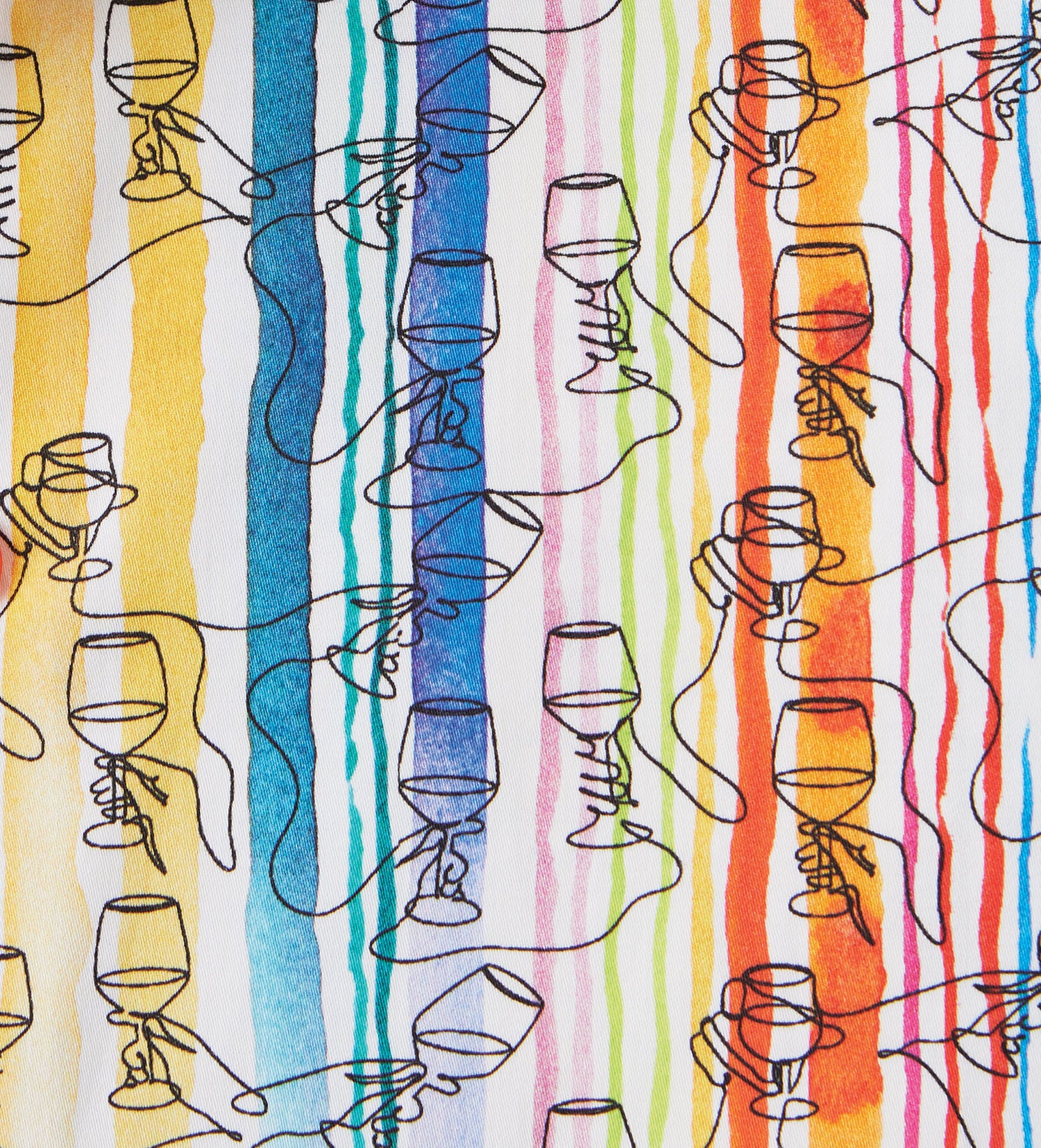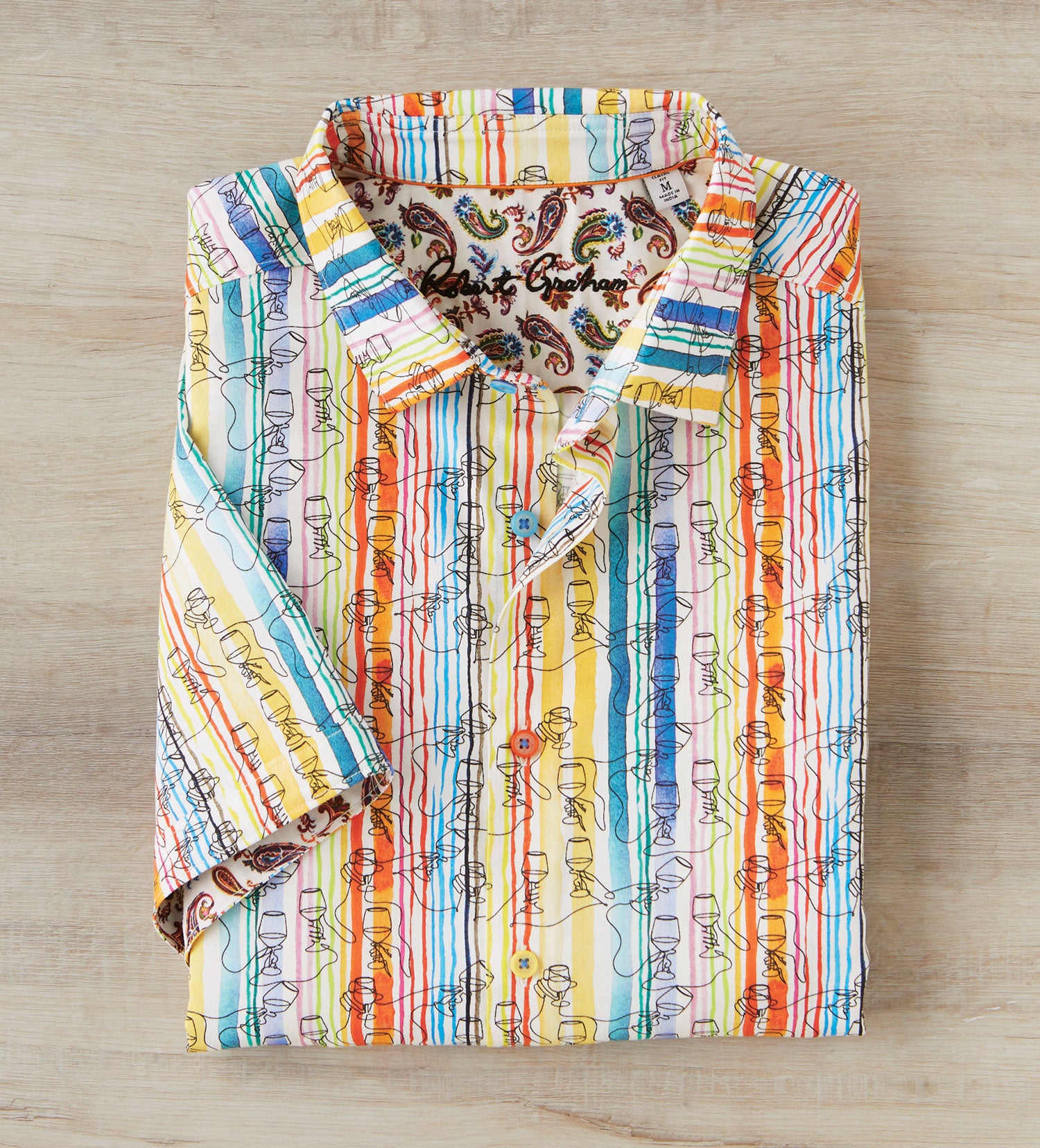 A fun party of wine glasses and retro stripes on 97% cotton/3% spandex. Short sleeves, point collar, shirttail hem, contrast print inside collar and cuffs. Machine wash. Imported.