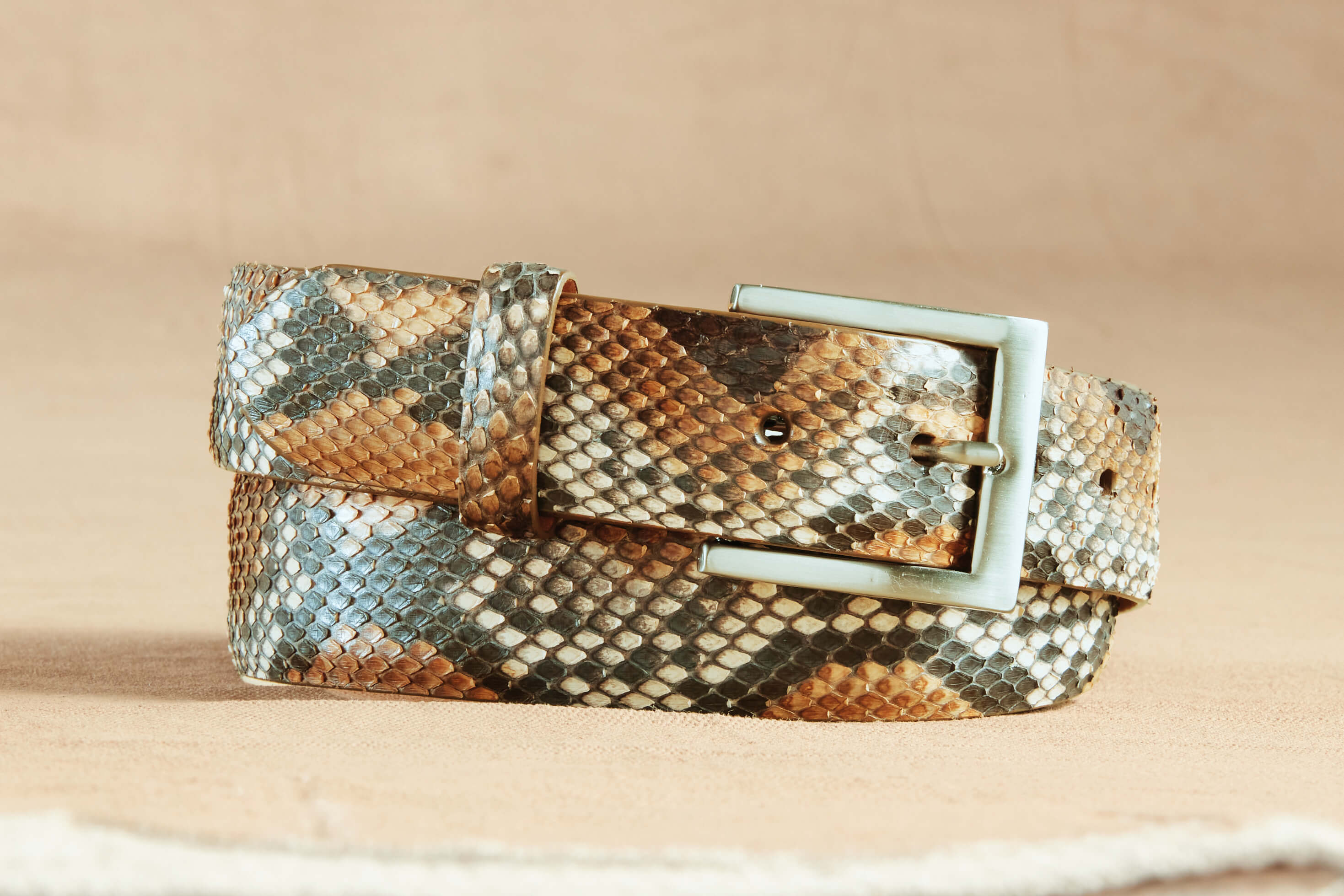 Made in USA of genuine python. Matte finish, brushed nickel buckle, supple nubuck leather backing, snaps for interchanging buckles. 1-1/2" wide.