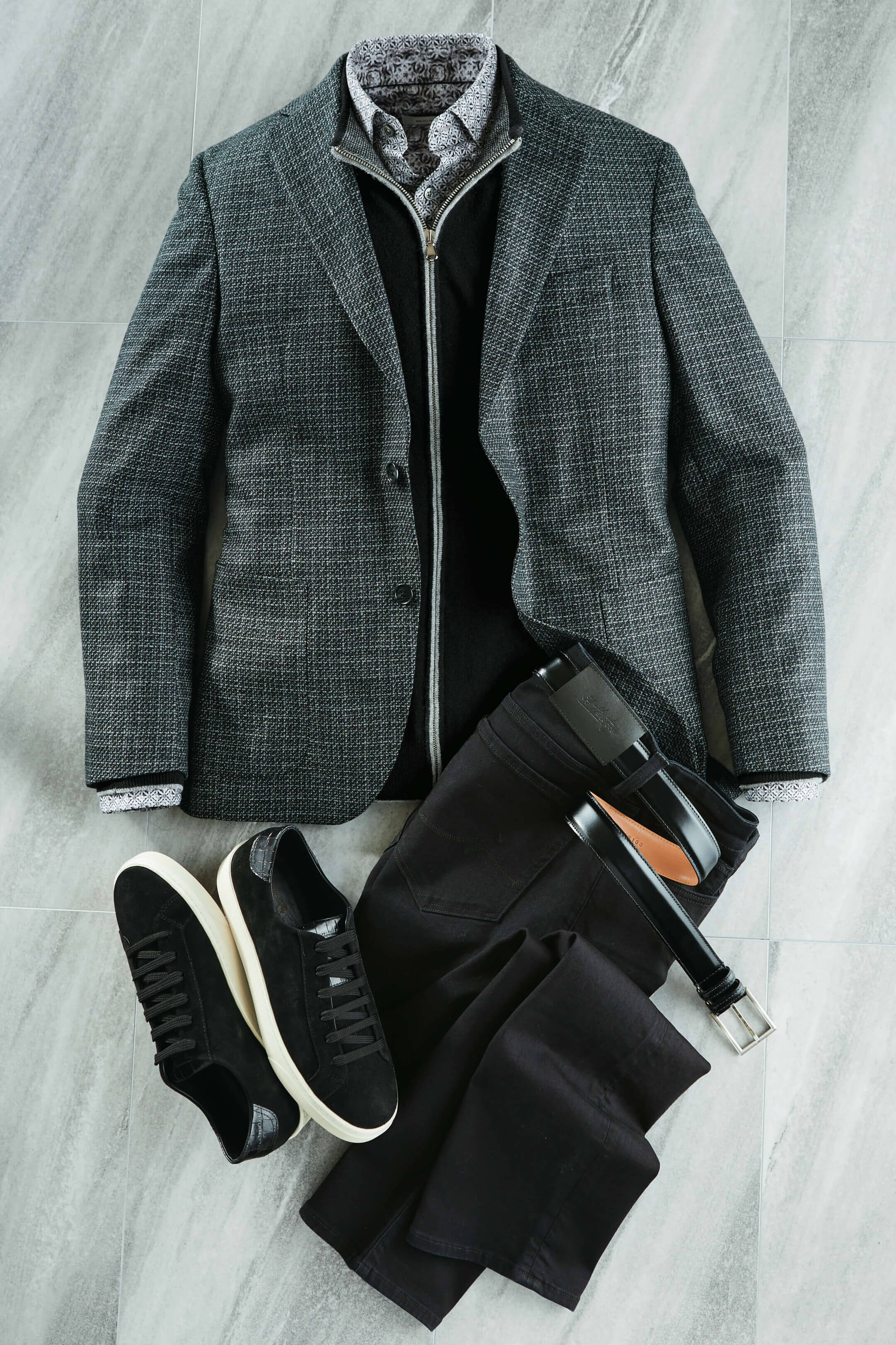 Richly textured, soft touch 100% wool, woven in Italy. Soft construction, two buttons, side vents, patch pockets. Black/White. Dry clean. Canada. 40-50 Regular, 40-44 Short, 42-50 Long.