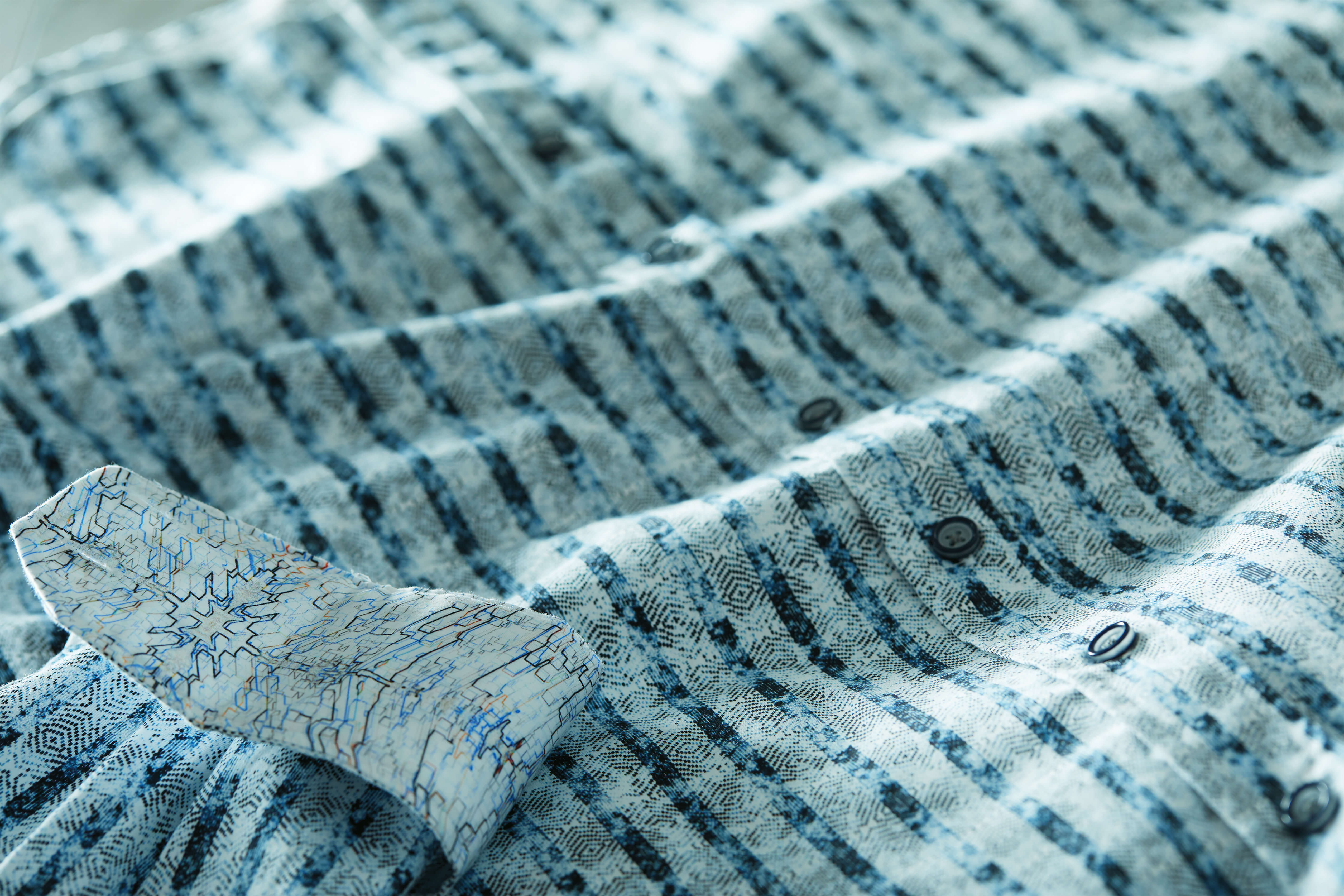 Cool stripe in 97% cotton/3% spandex. Long sleeves, point collar, shirttail hem, contrast print inside yoke and cuffs.