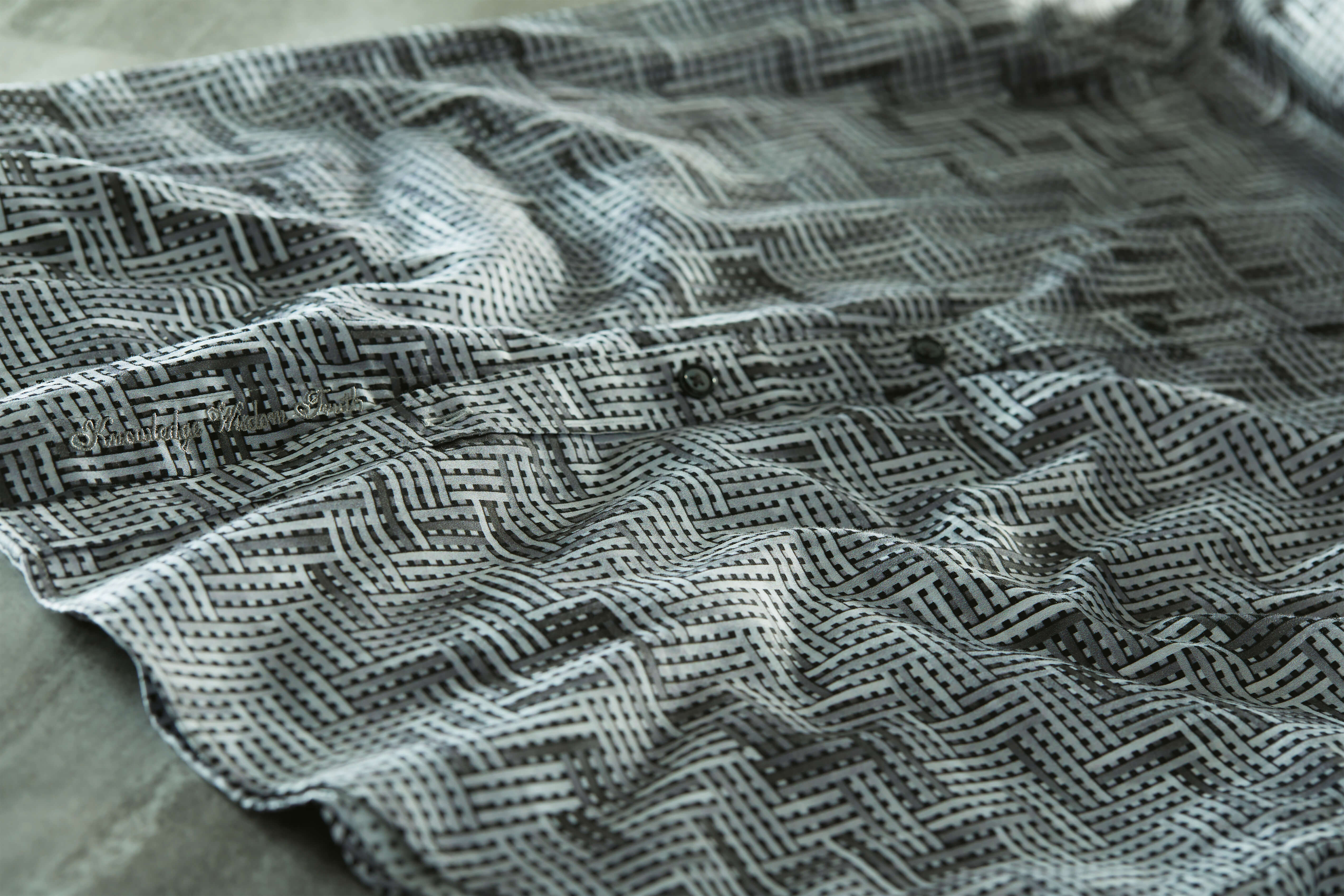 Bold effect in 97% cotton/3% spandex. Long sleeves, point collar, shirttail hem, contrast print inside collar and cuffs.