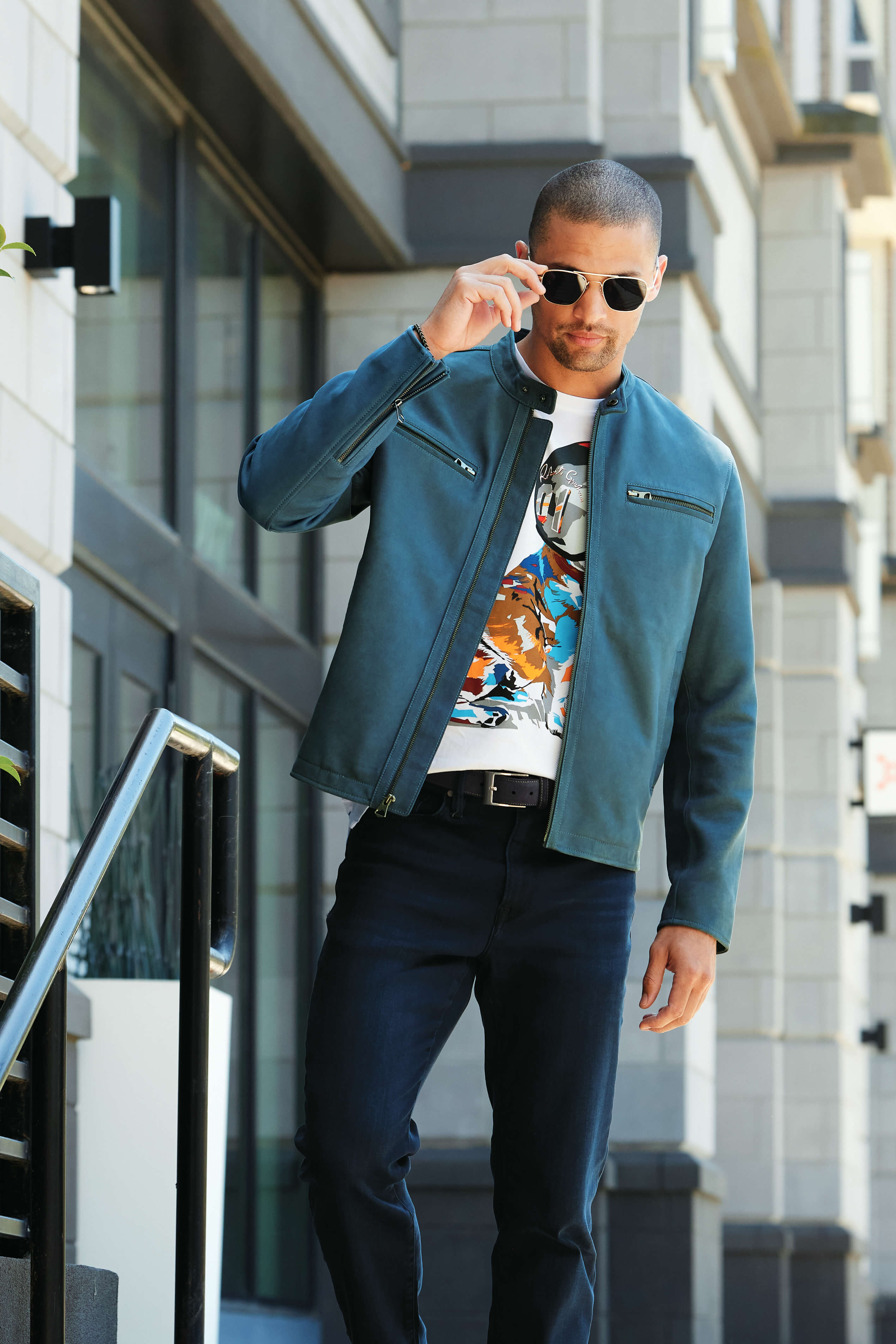 Effortlessly cool in ultra soft nubuck suede. Full zipper, mock neck with snaps, zipper chest pockets, welt pockets with snaps, zipper cuffs, jacquard lining.