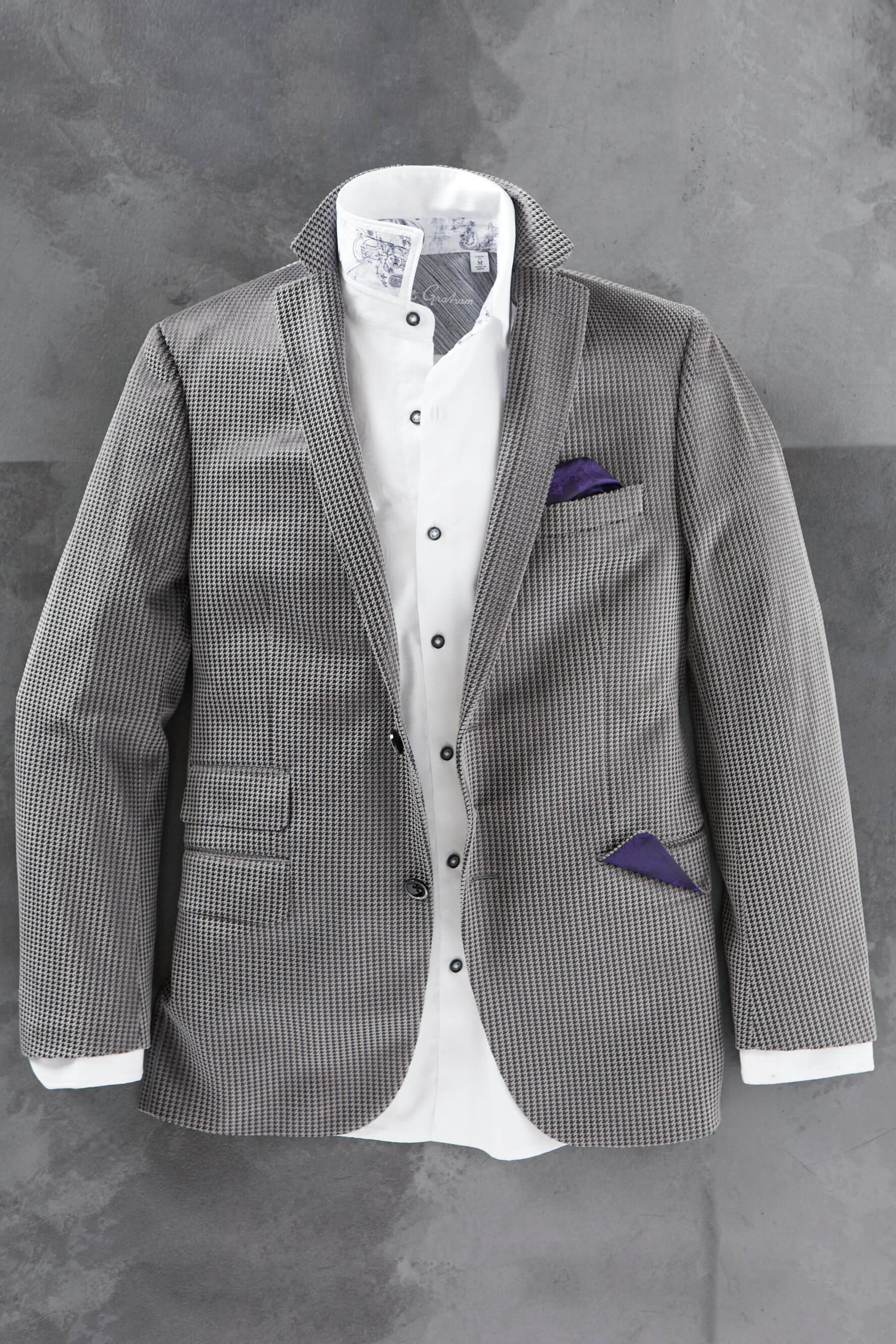 Houndstooth pattern in velvety 100% polyester. Two buttons, side vents, notch lapel, flap pockets, full jacquard lining with pull-out pocket square. Dry clean. Imported. 40-50 Regular, 42-50 Long.