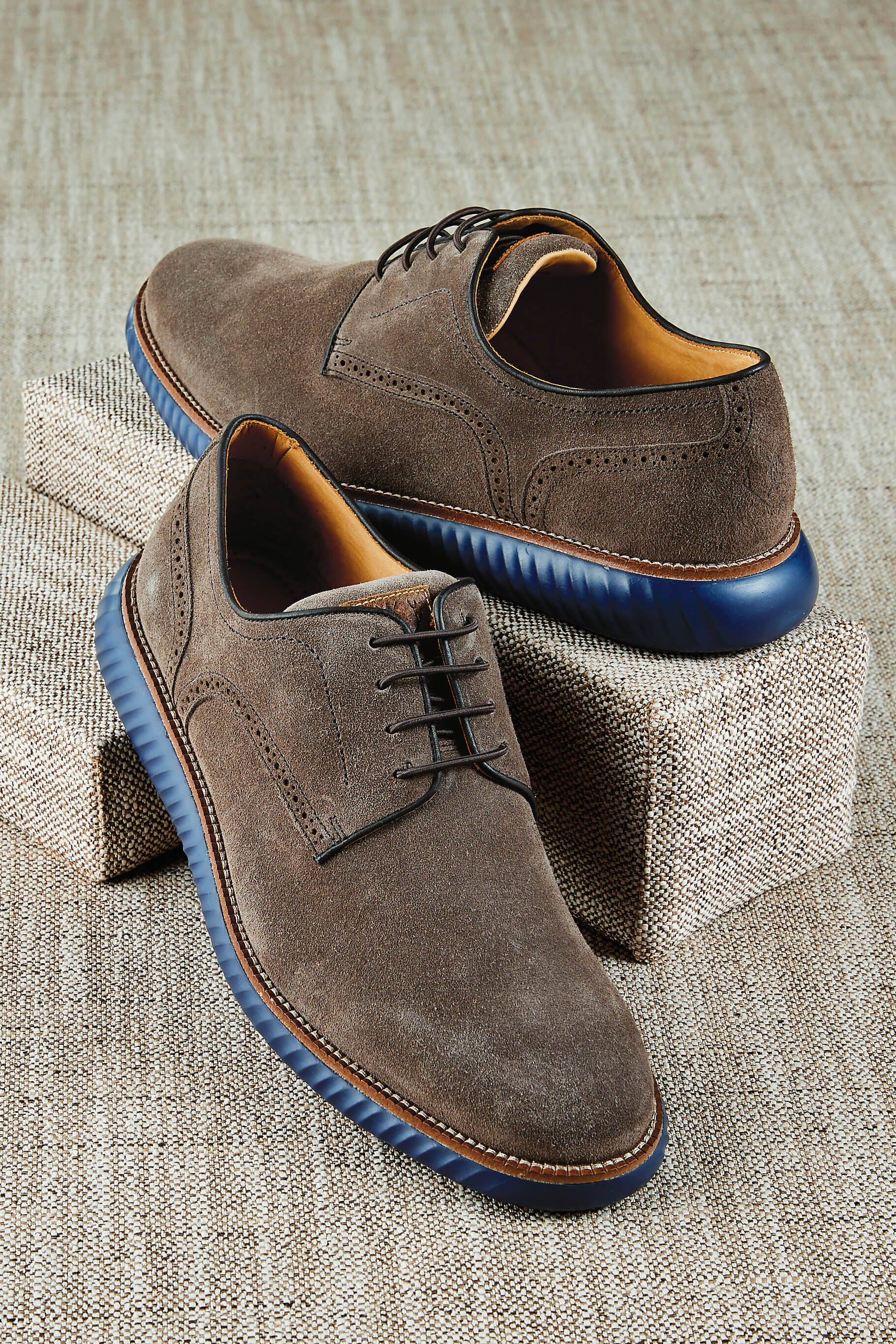 Water-repellent suede. Elastic no-tie laces, heel-to-toe comfort system, lightweight rubber sole, handcrafted on the last.