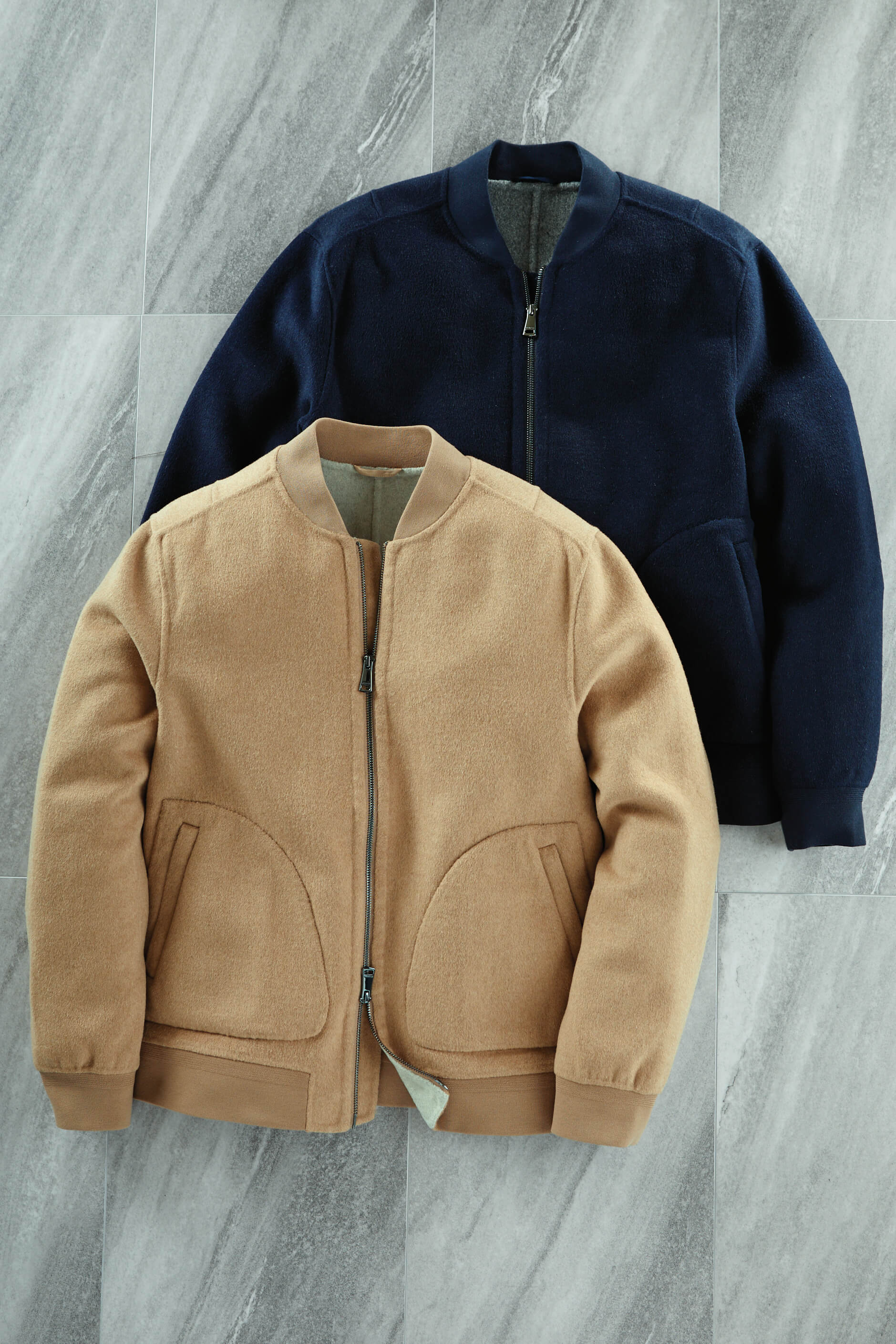 Classic style in double-faced, bonded 55% wool/40% polyester/10% other fiber. Two-way zip front, patch pockets, ribbed collar, cuffs and waist, unlined.