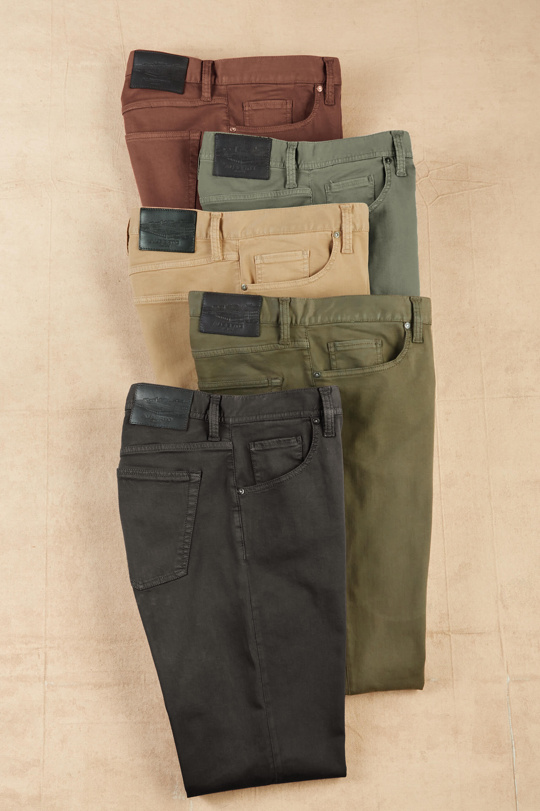 Maximum comfort, freedom of movement in soft, smooth, 9.5 oz. 89% cotton/8% T400 /3% elasthan. Modern fit, five pockets. 32" inseam