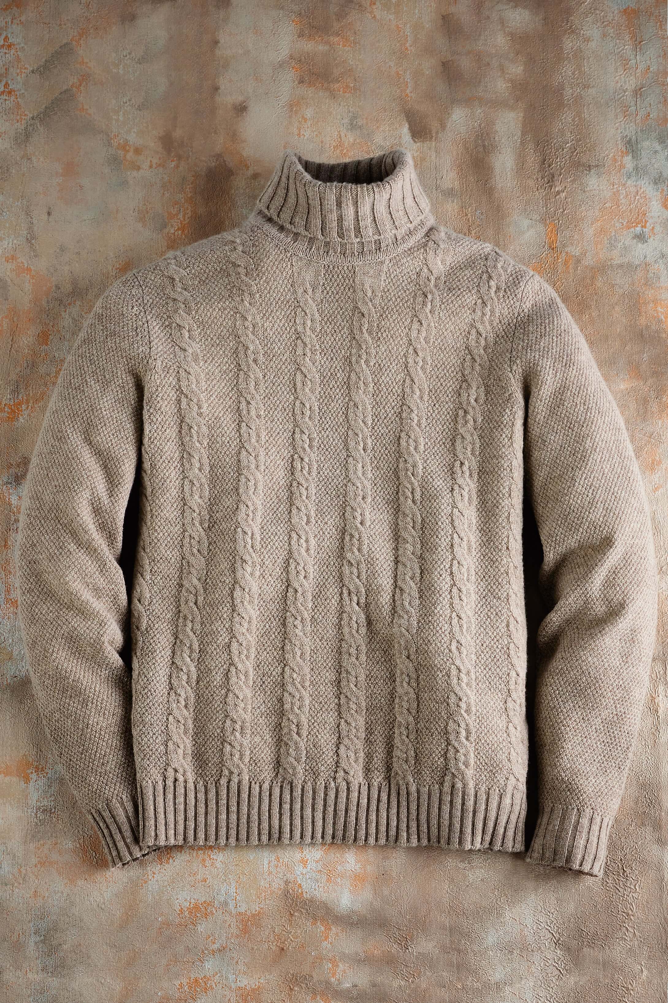 All-over moss stitch in luxurious 100% lambswool. Cable knit front, ribbed roll neck, cuffs and waist.