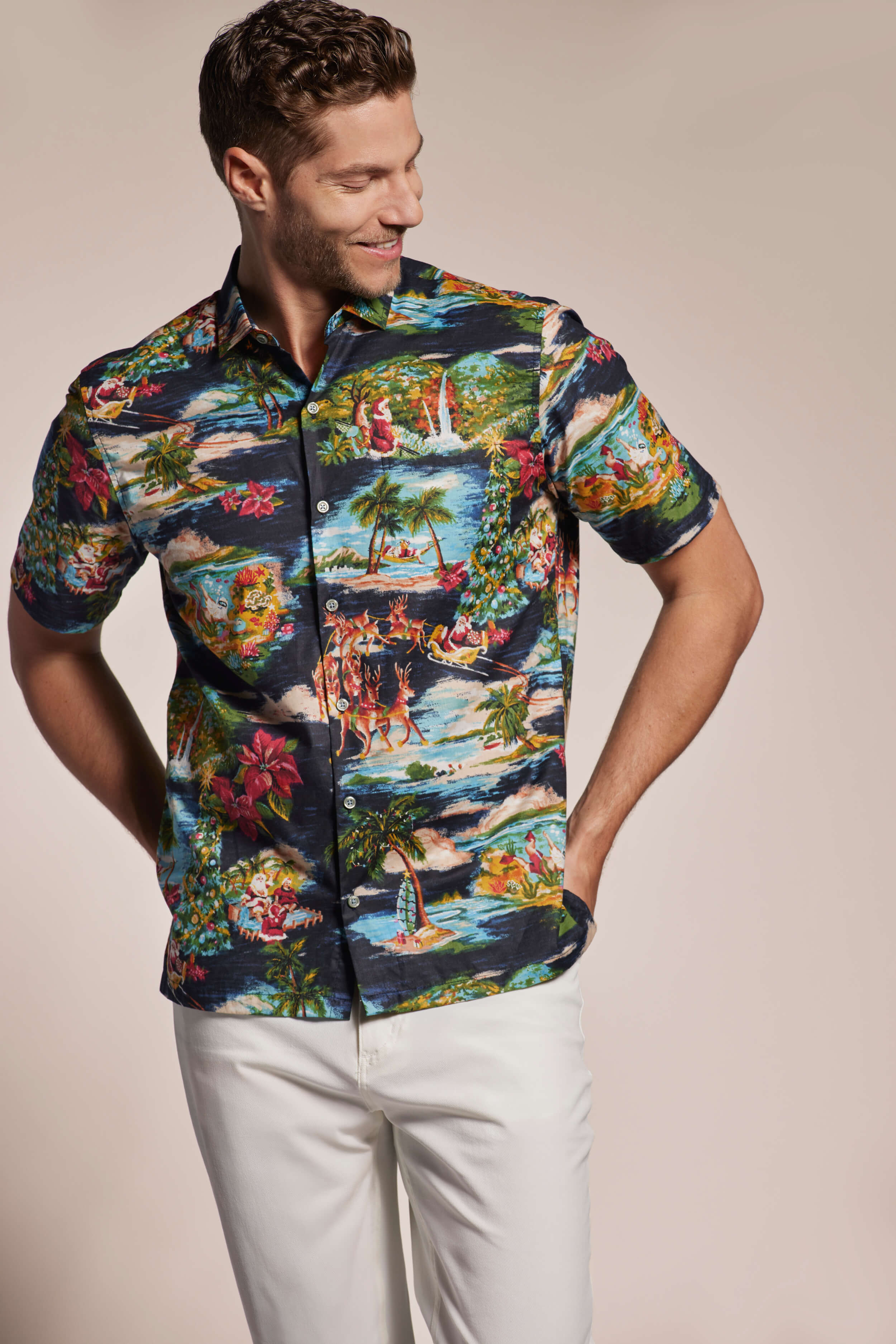 Tropical Christmas in soft 100% cotton lawn. Short sleeves, camp collar, chest pocket, straight hem.