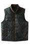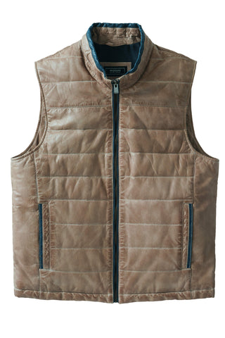Lightweight, quilted Italian lambskin with weathered finish. Full zip, stand-up collar, welt pockets, contrast leather trim, full lining.