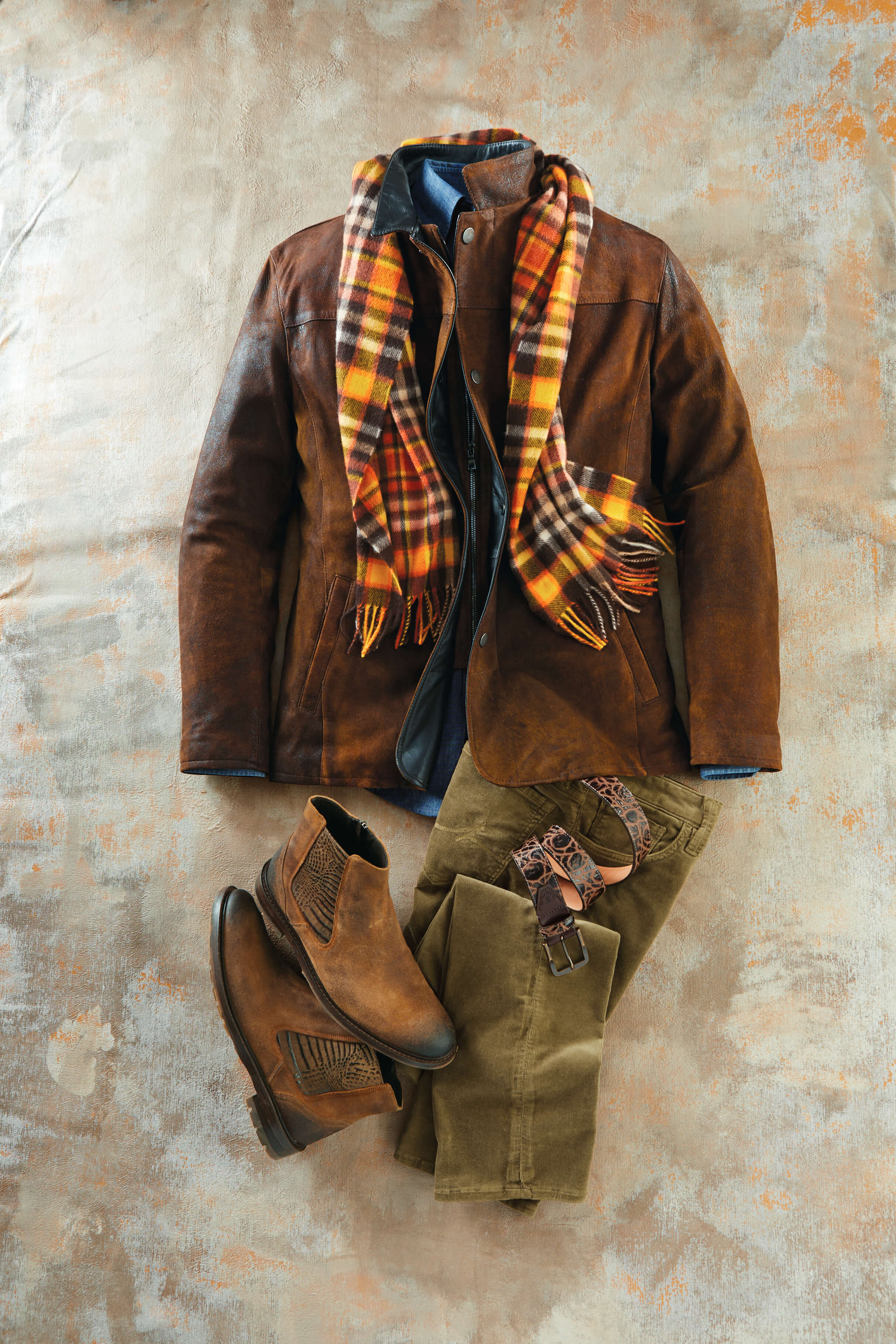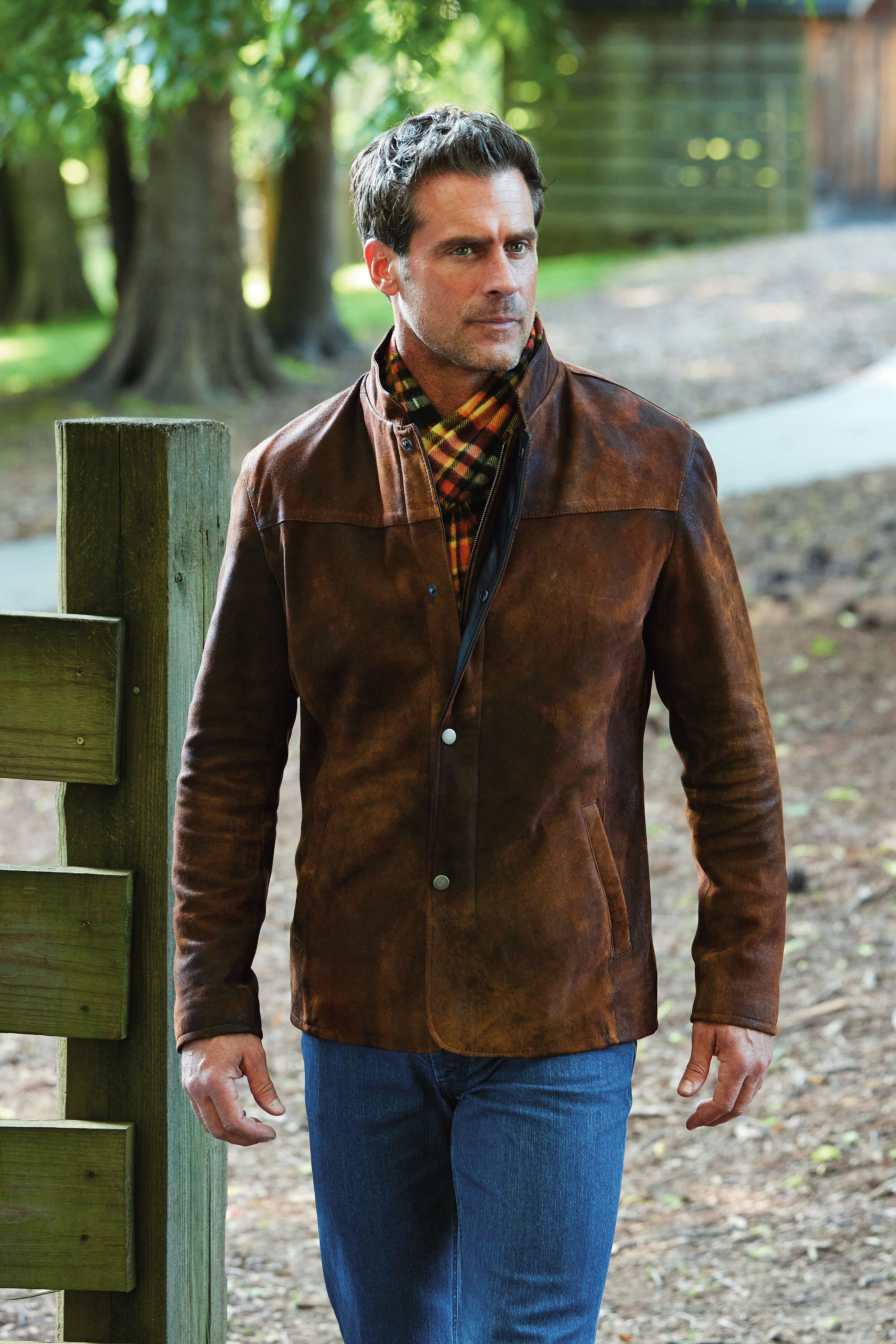 Contemporary, hybrid style handcrafted in USA of distressed leather. Zip front with snap storm placket, stand-up collar, welt pockets, soft glove leather details, full lining.