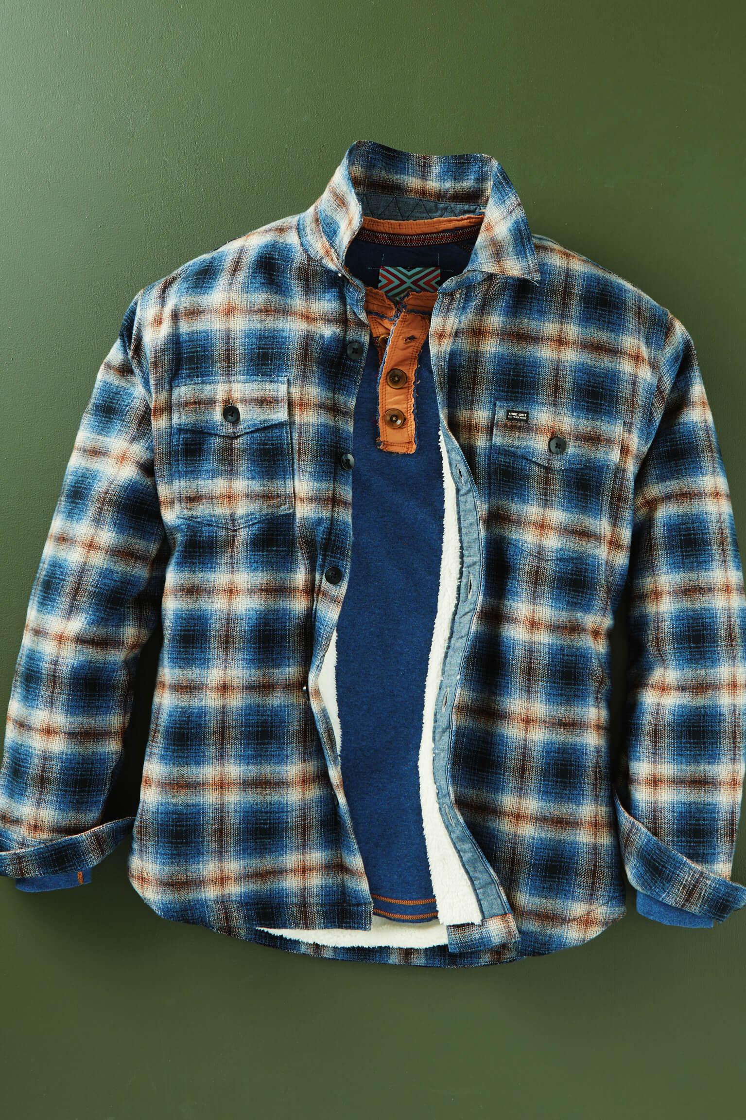 Casual and comfortable in ultra soft 100% cotton. Cozy sherpa lining, long sleeves, spread collar, button-flap chest pockets, on-seam welt pockets, curved hem.
