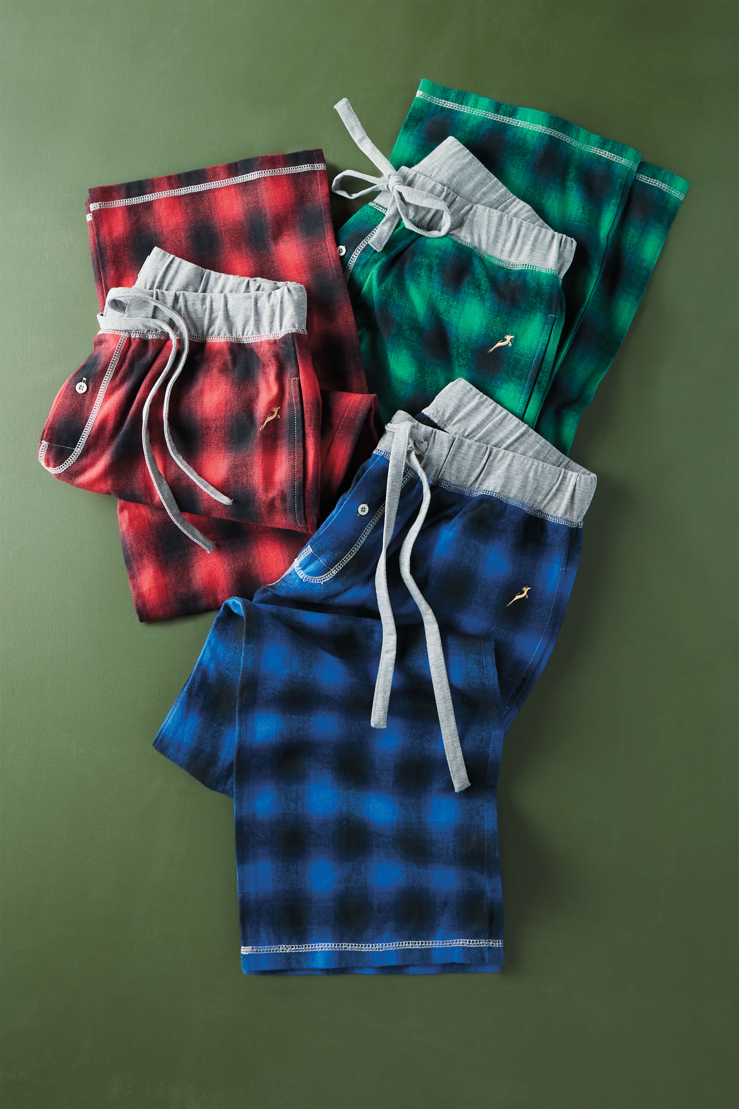 Comfy 100% cotton. Heather knit trim, elastic waistband with drawstring tie, button fly. On-seam pockets. 32" inseam
