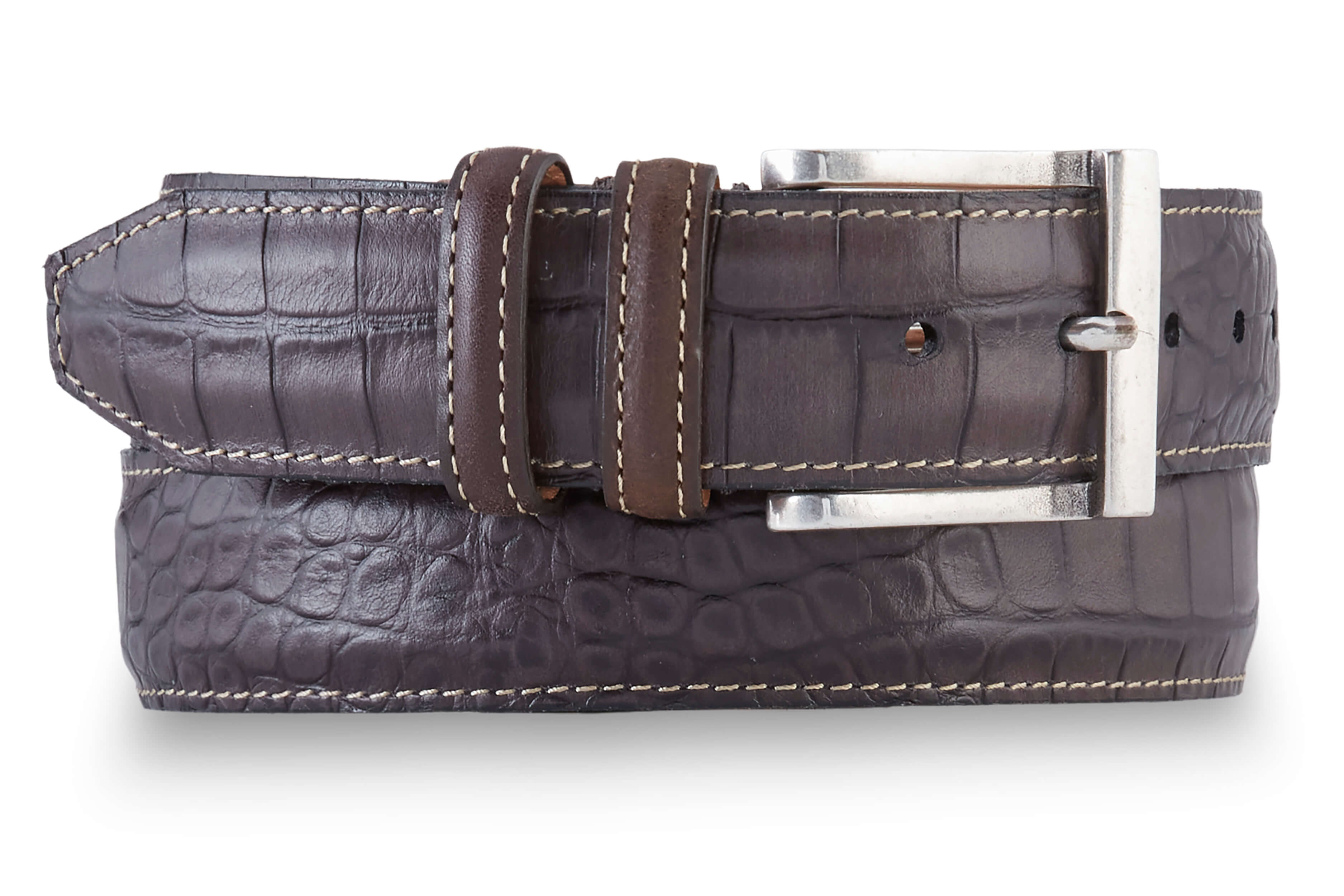 Handcrafted in USA of hand-finished, alligator-grain leather. Antiqued silver finish Italian hardware, saddle leather lining. 1 3/8" wide.