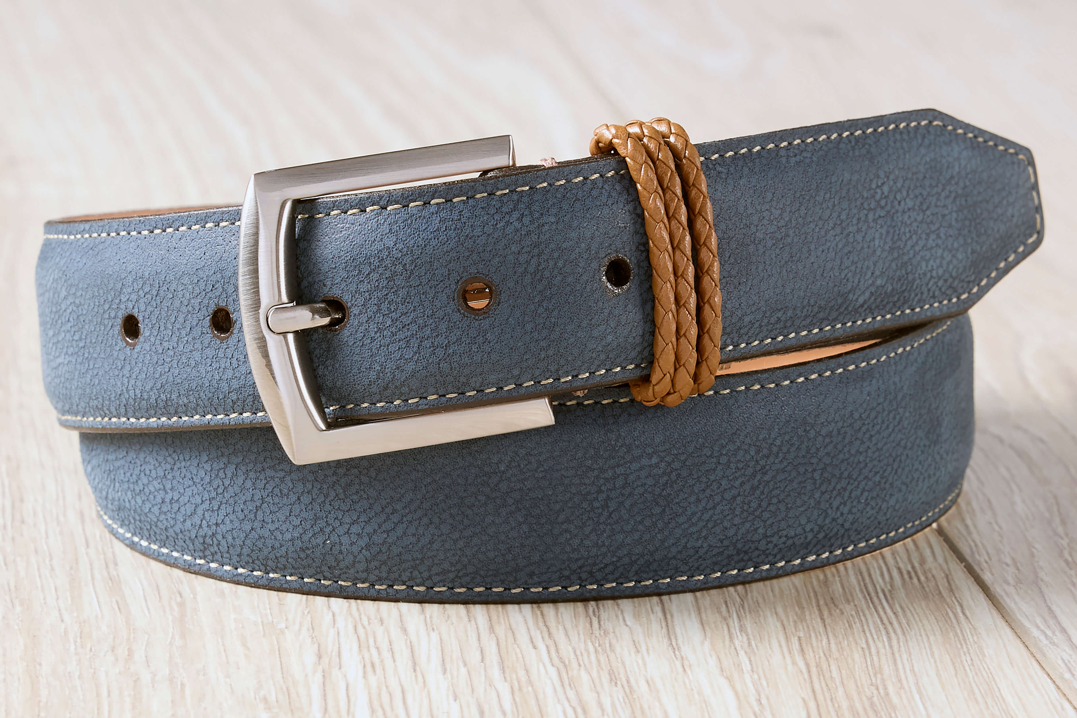 Handcrafted in USA of water-repellent nubuck leather. Brushed nickel finish buckle, braided leather keeper, saddle leather lining. 1 3/8"wide.