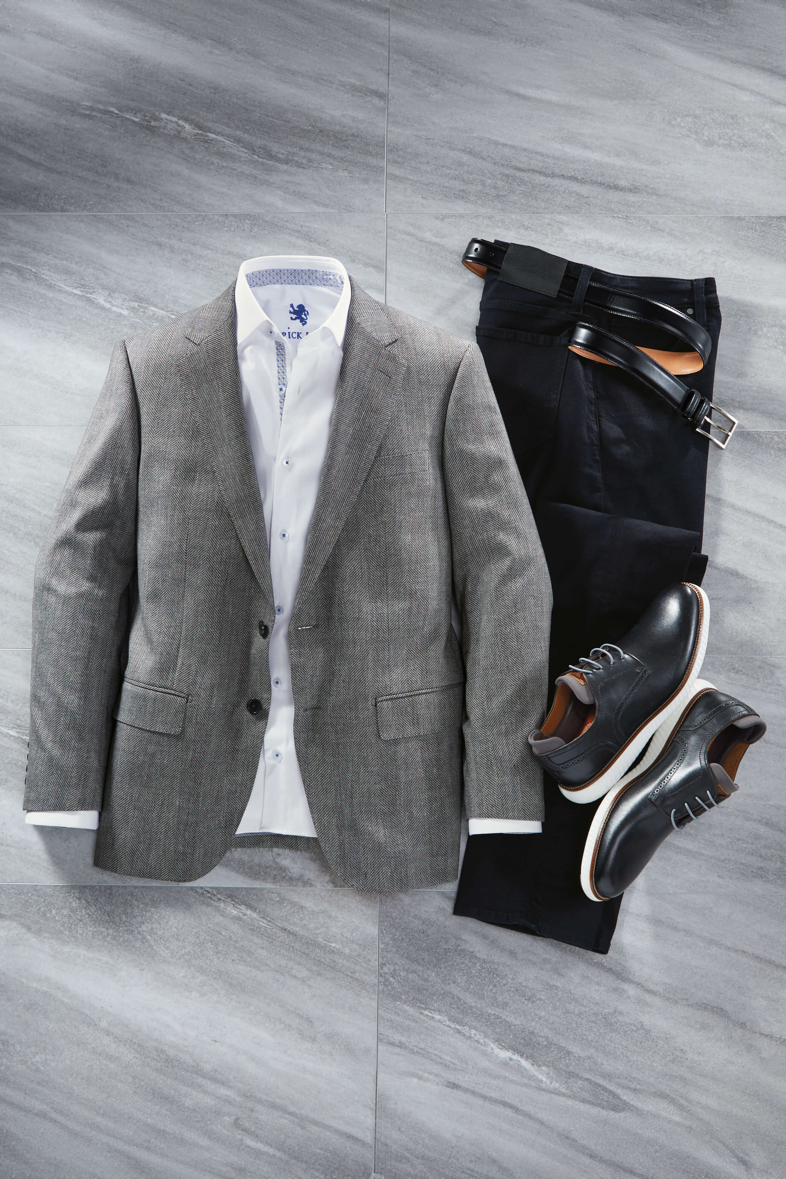 Black-and-white classic. Two buttons, side vents, flap pockets, half lining.