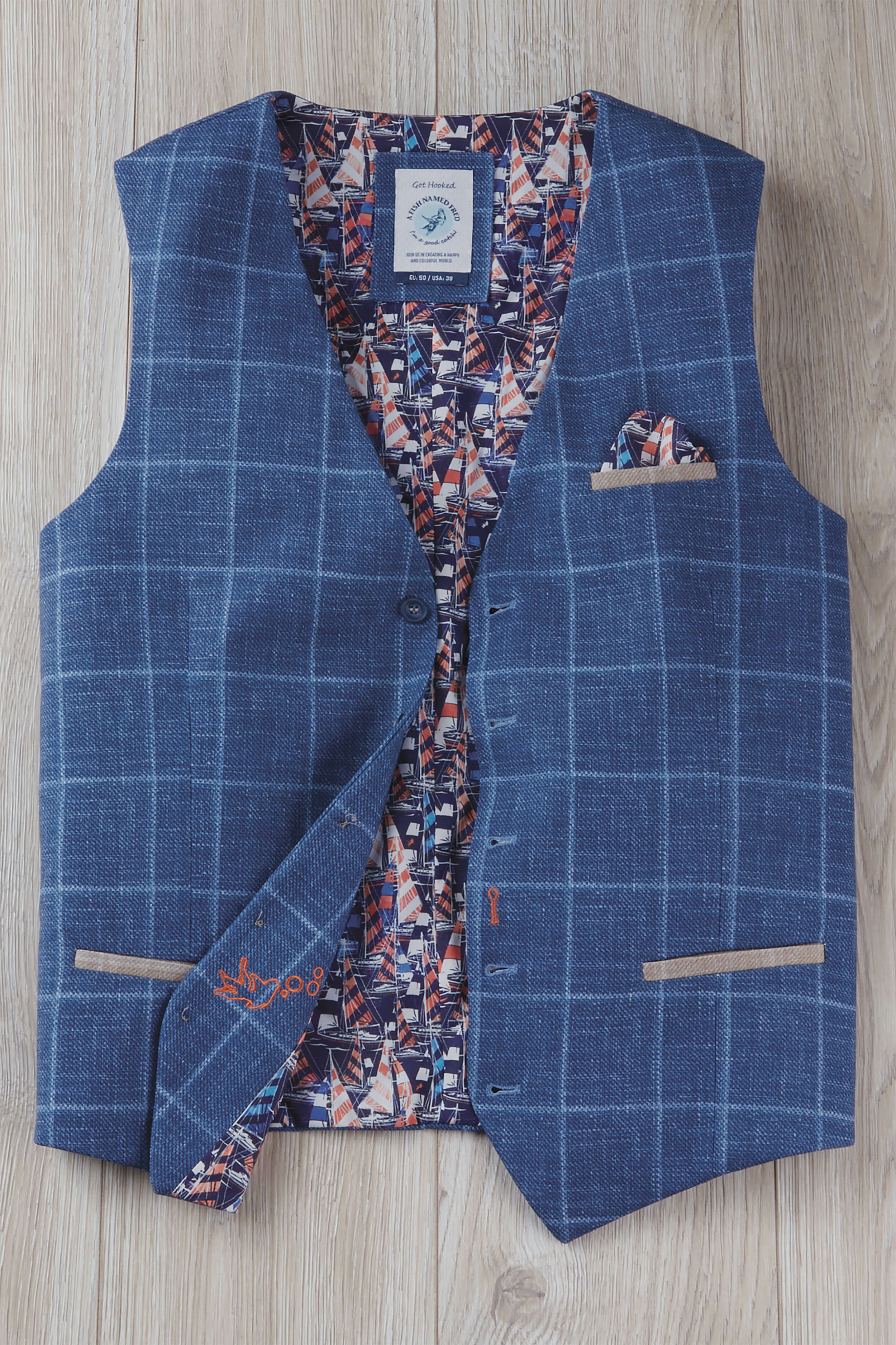 Smart, stylish, in breathable, stretch. Vibrant print lining and pocket square, five buttons, contrast welt pockets, adjustable back belt.
