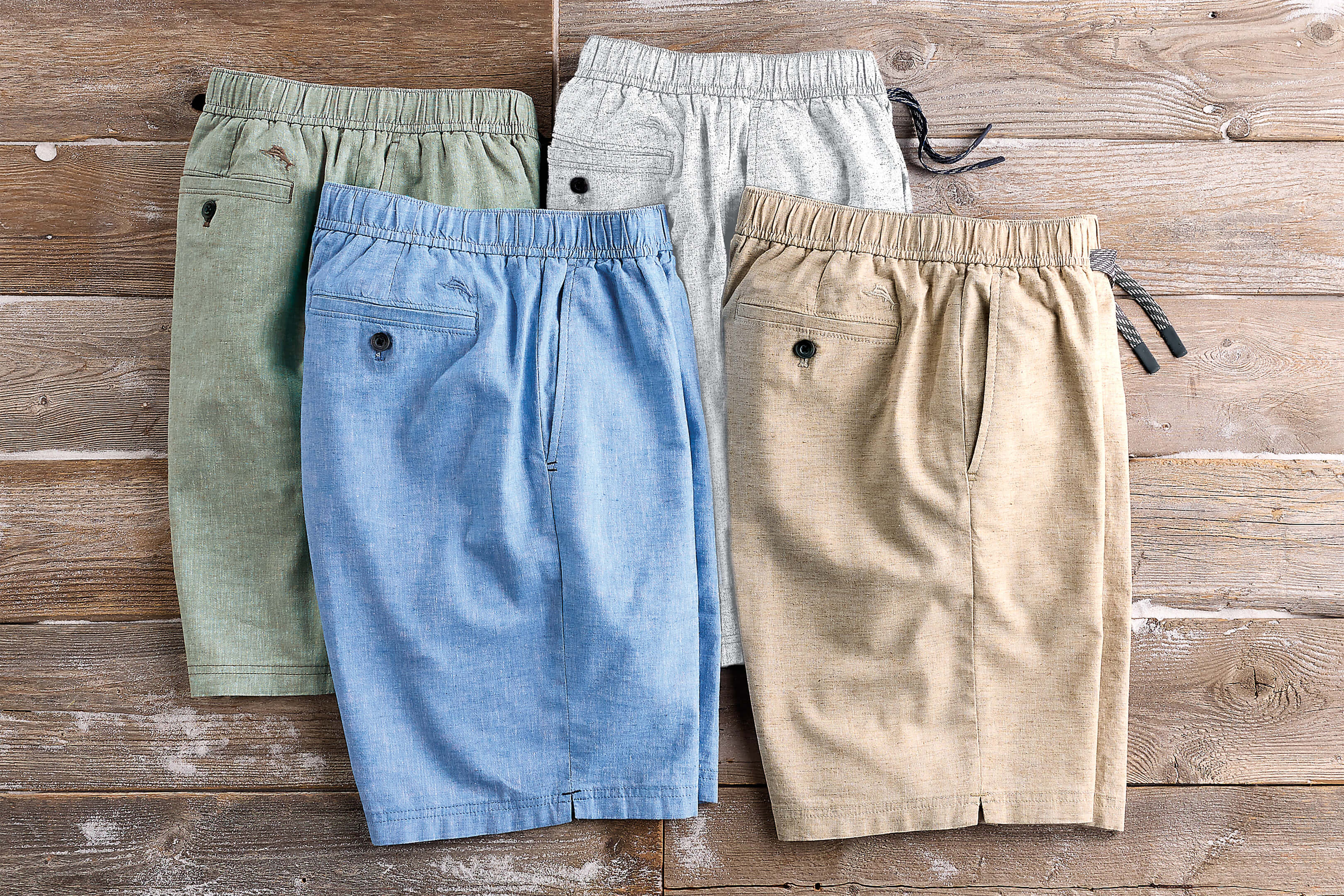 Comfortable, Elastic waist, quarter-top pockets, button-through welt back pockets.