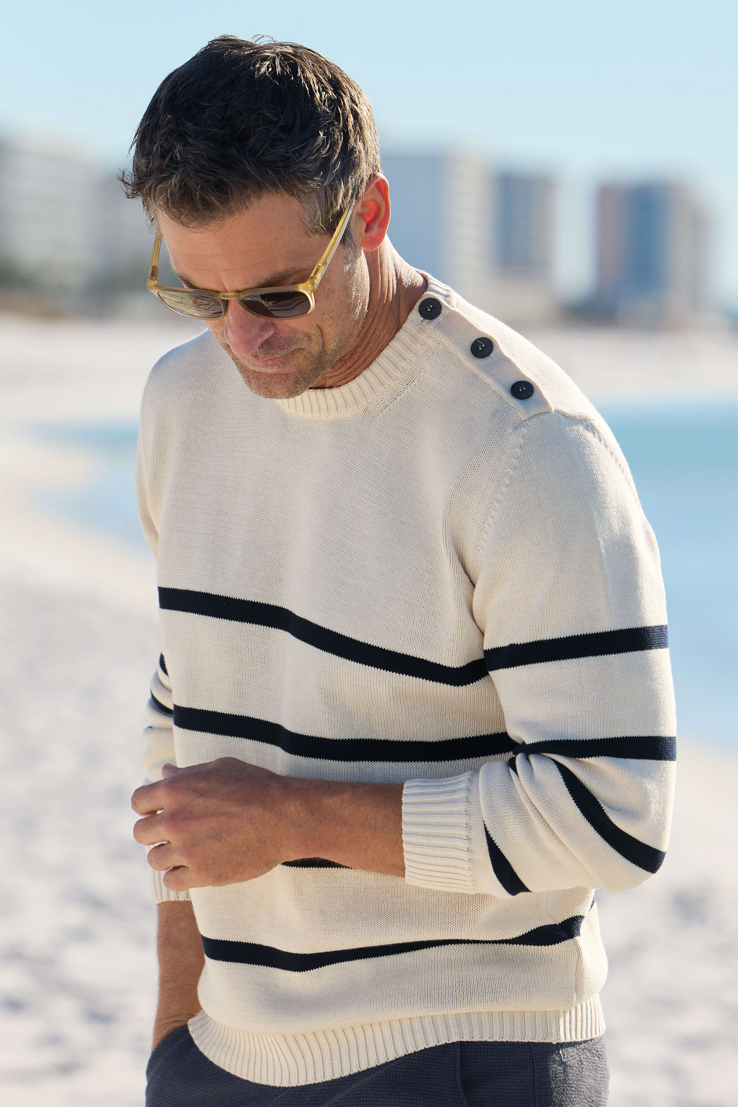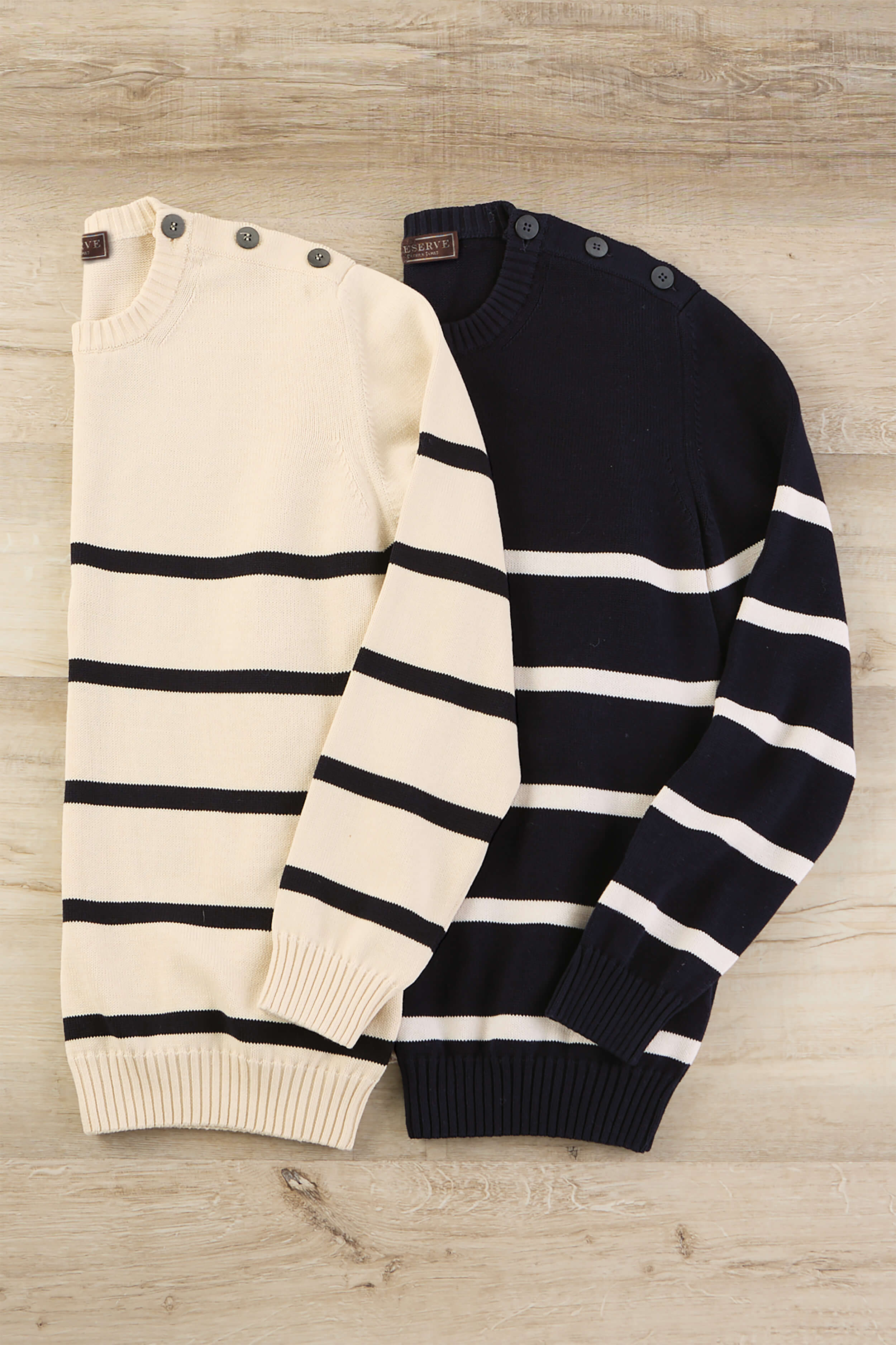 Nautical inspired in 100% cotton. Long sleeves, three-button shoulder, ribbed crew neck, cuffs and waist.