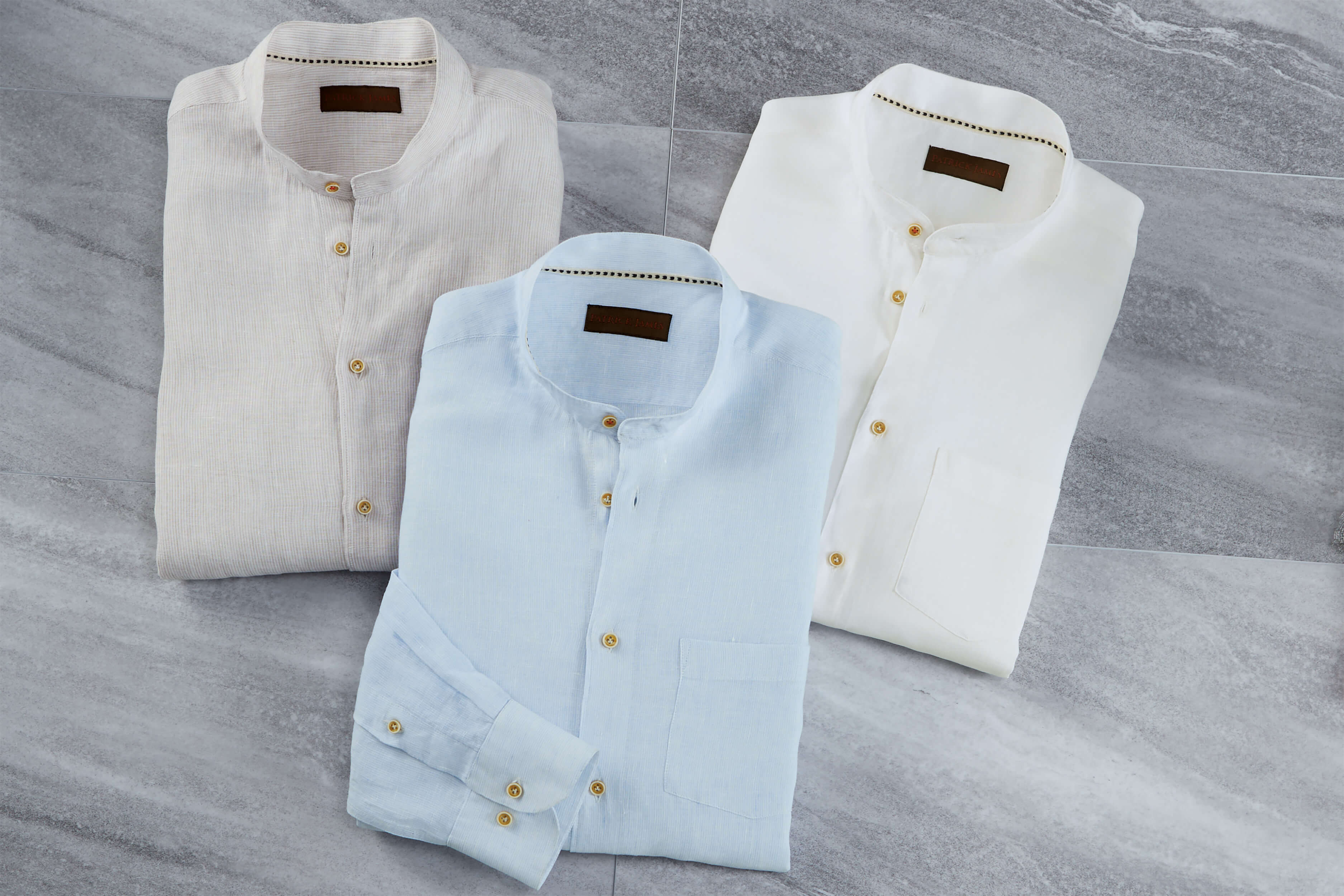 Fine, lightweight, Italian 100% linen, washed to a perfect softness. Long sleeves, band collar, chest pocket, shirttail hem.