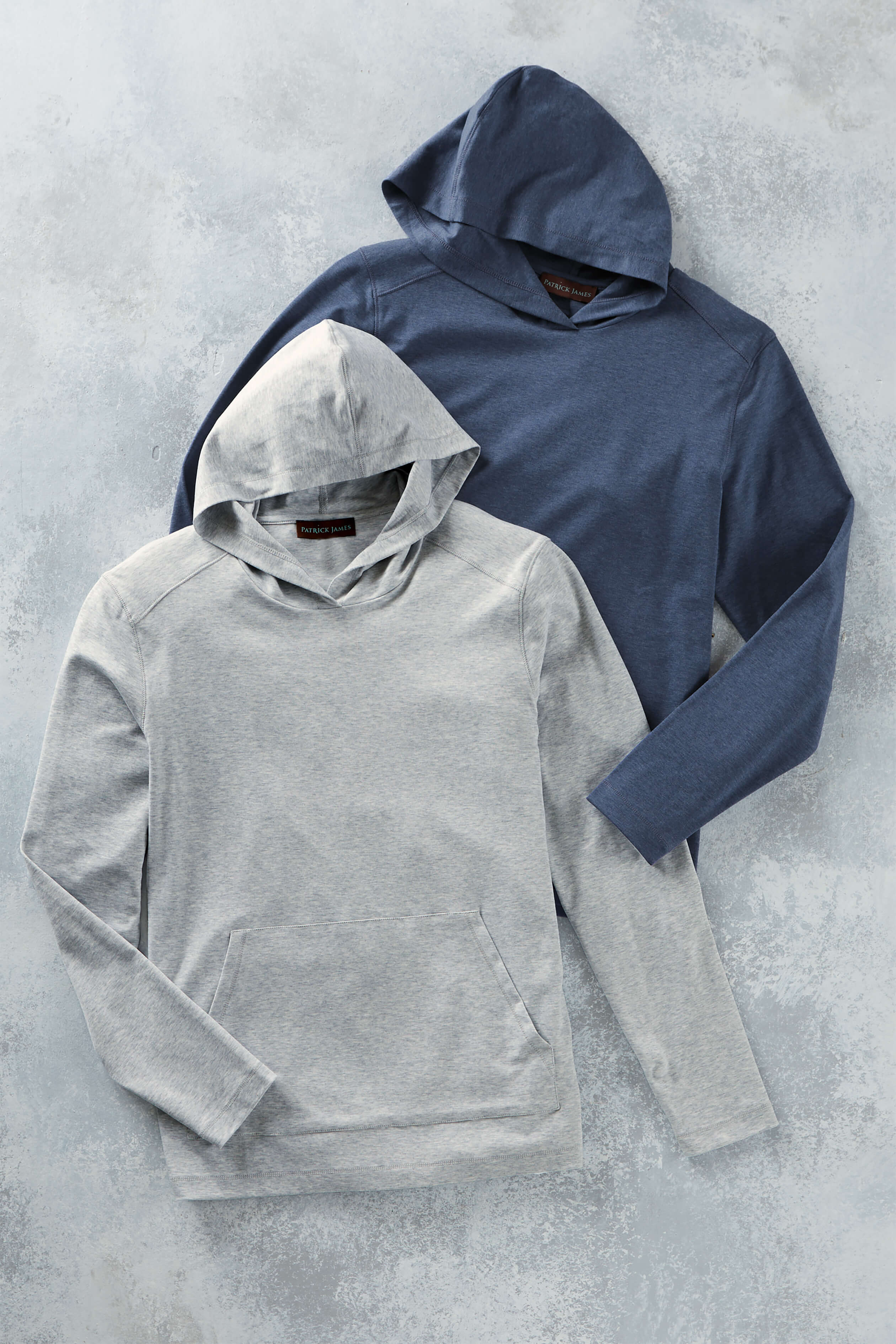 Heathered liquid 100% cotton with a cool, weightless feel. Long sleeves, kangaroo pocket, hemmed cuffs, straight hem.
