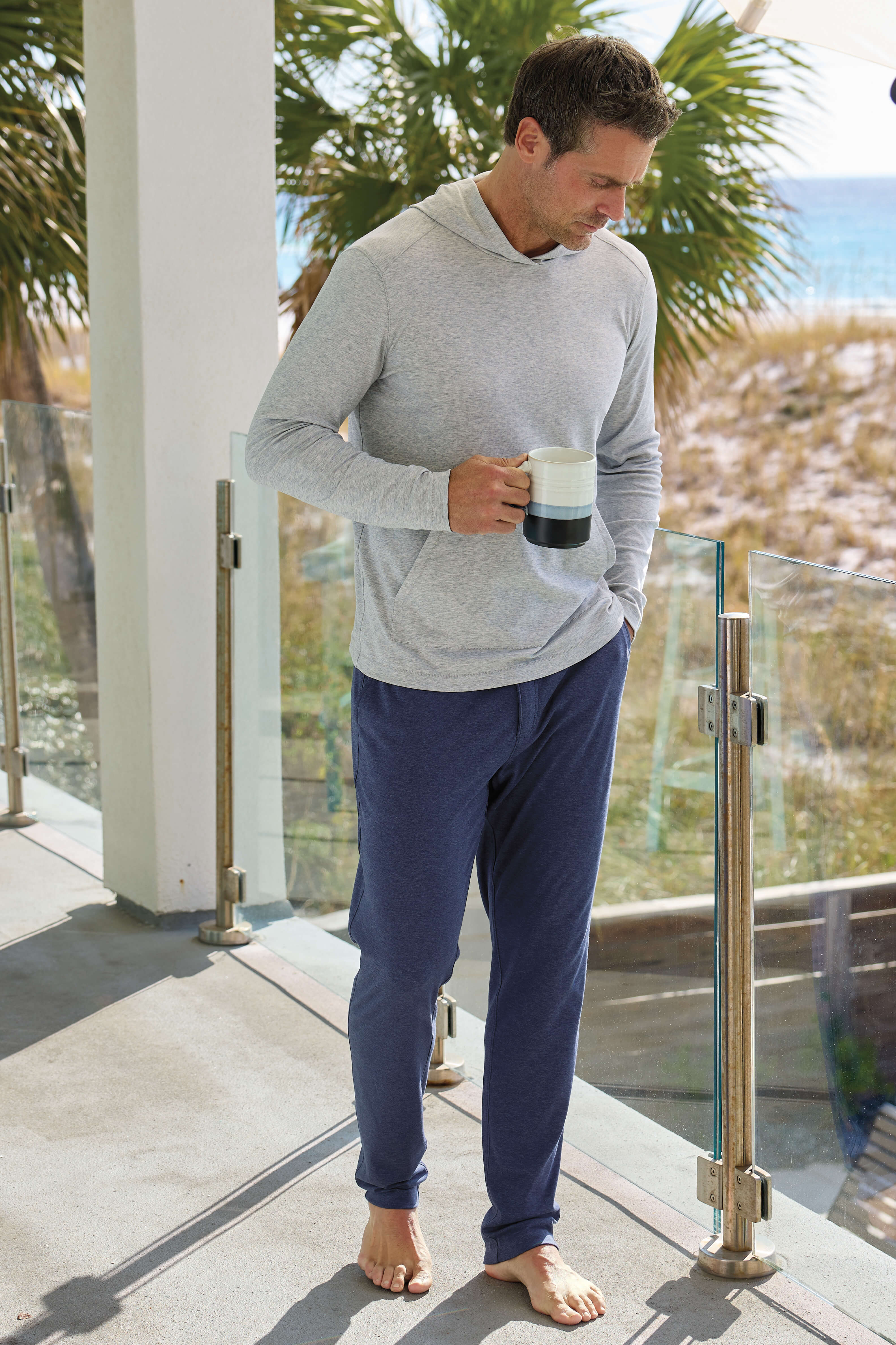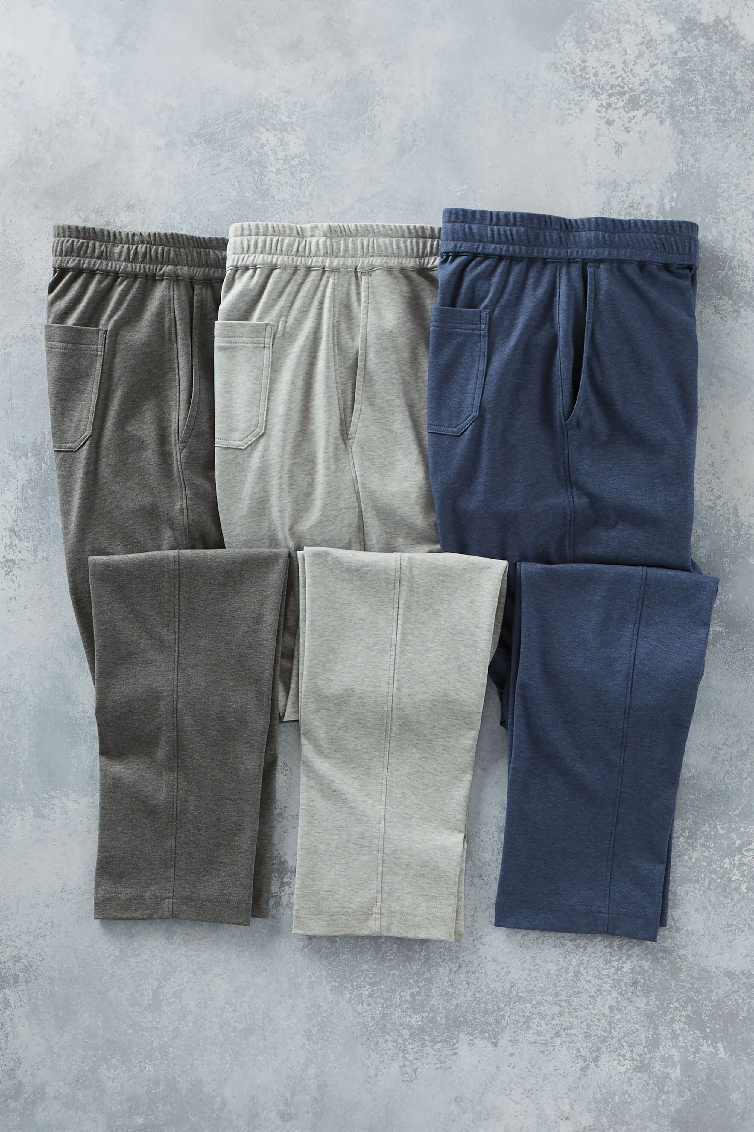 Cool, weightless feel in heathered liquid 100% cotton. Drawstring waist, zip fly, on-seam pockets, single rear patch pocket, open cuffs. 32" inseam