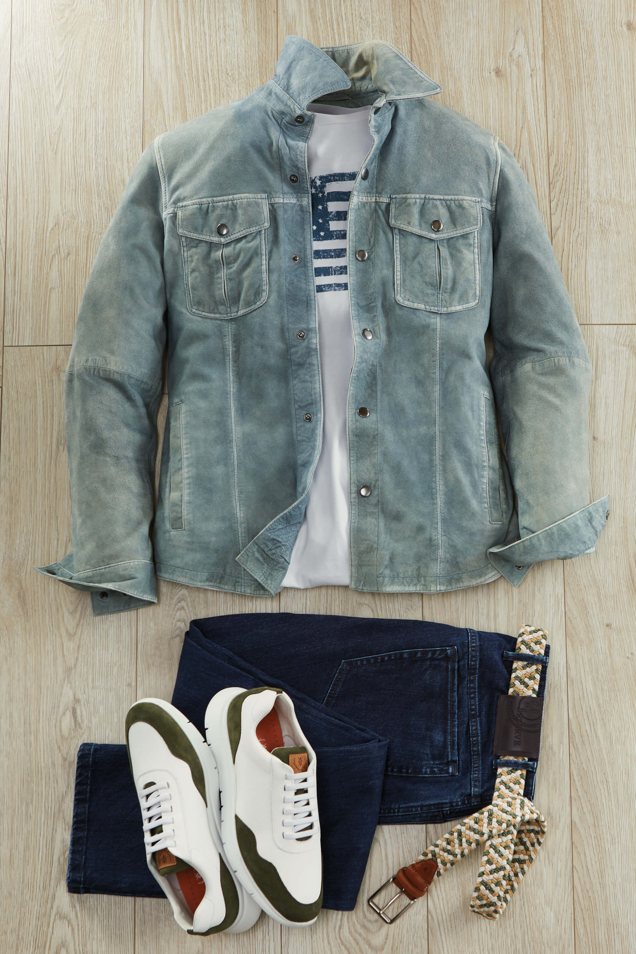 Rugged, Italian lambskin with vintage antiquing effect. Snap front, snap-flap chest pockets, angled welt pockets, snap cuffs, slightly curved hem, full lining.