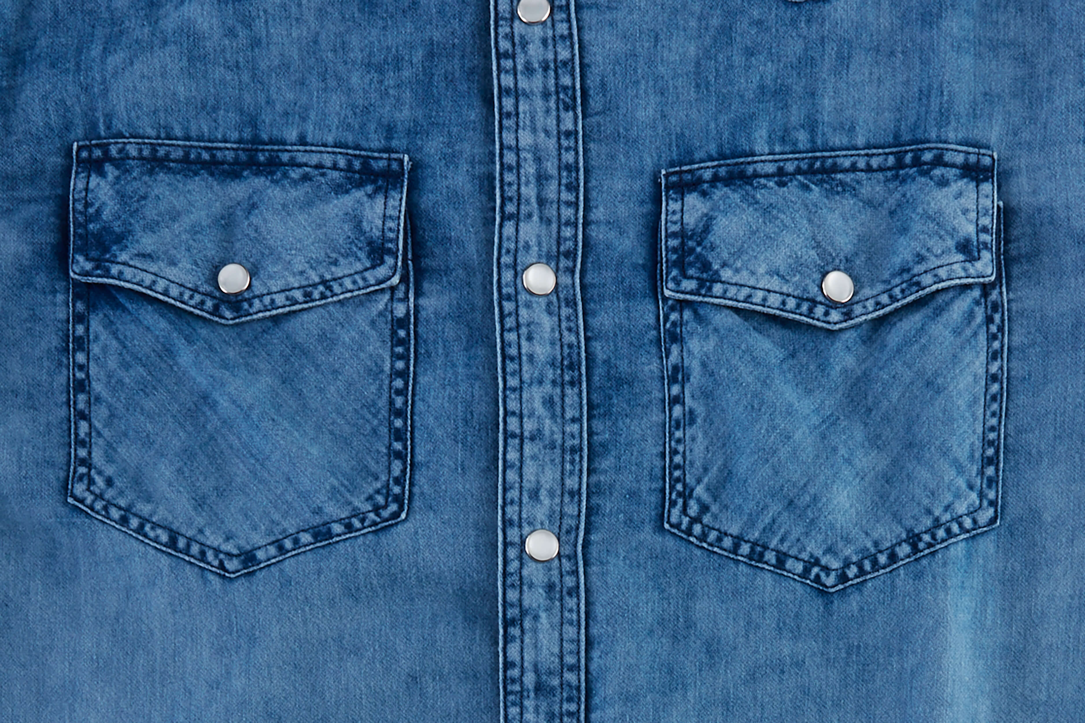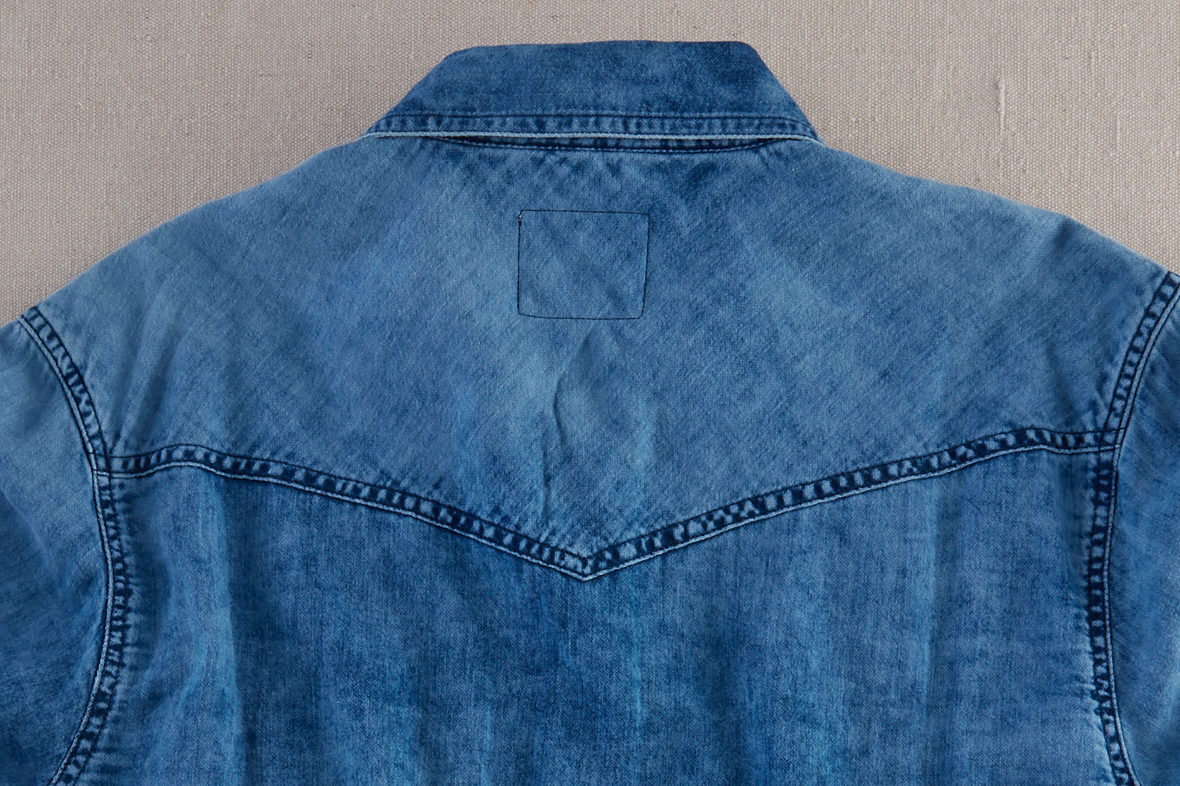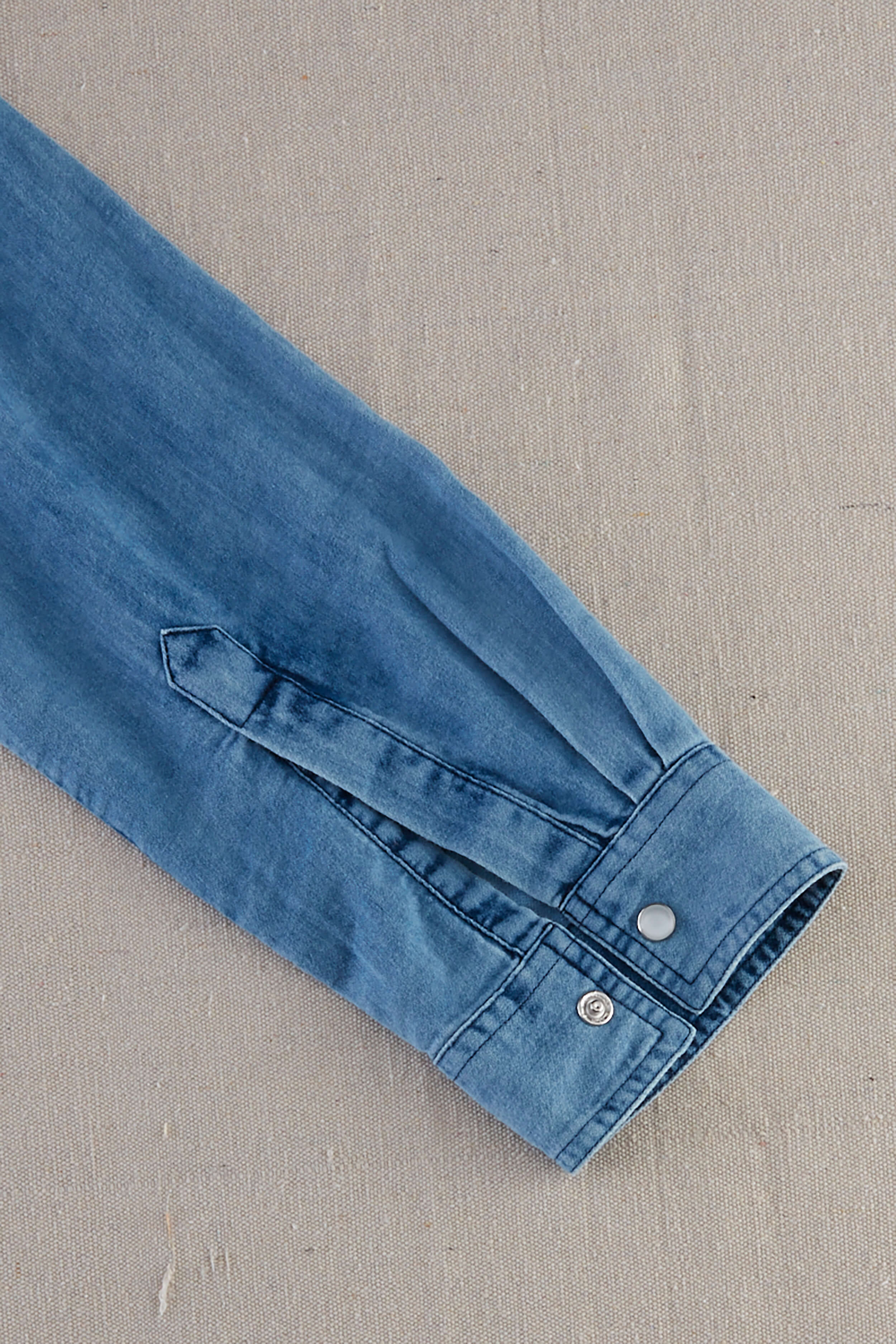 Indigo highlights on vintage-washed 100% cotton. Long sleeves, spread collar, pearly snap front, snap-flap chest pockets, snap cuffs, Western yoke, shirttail hem.