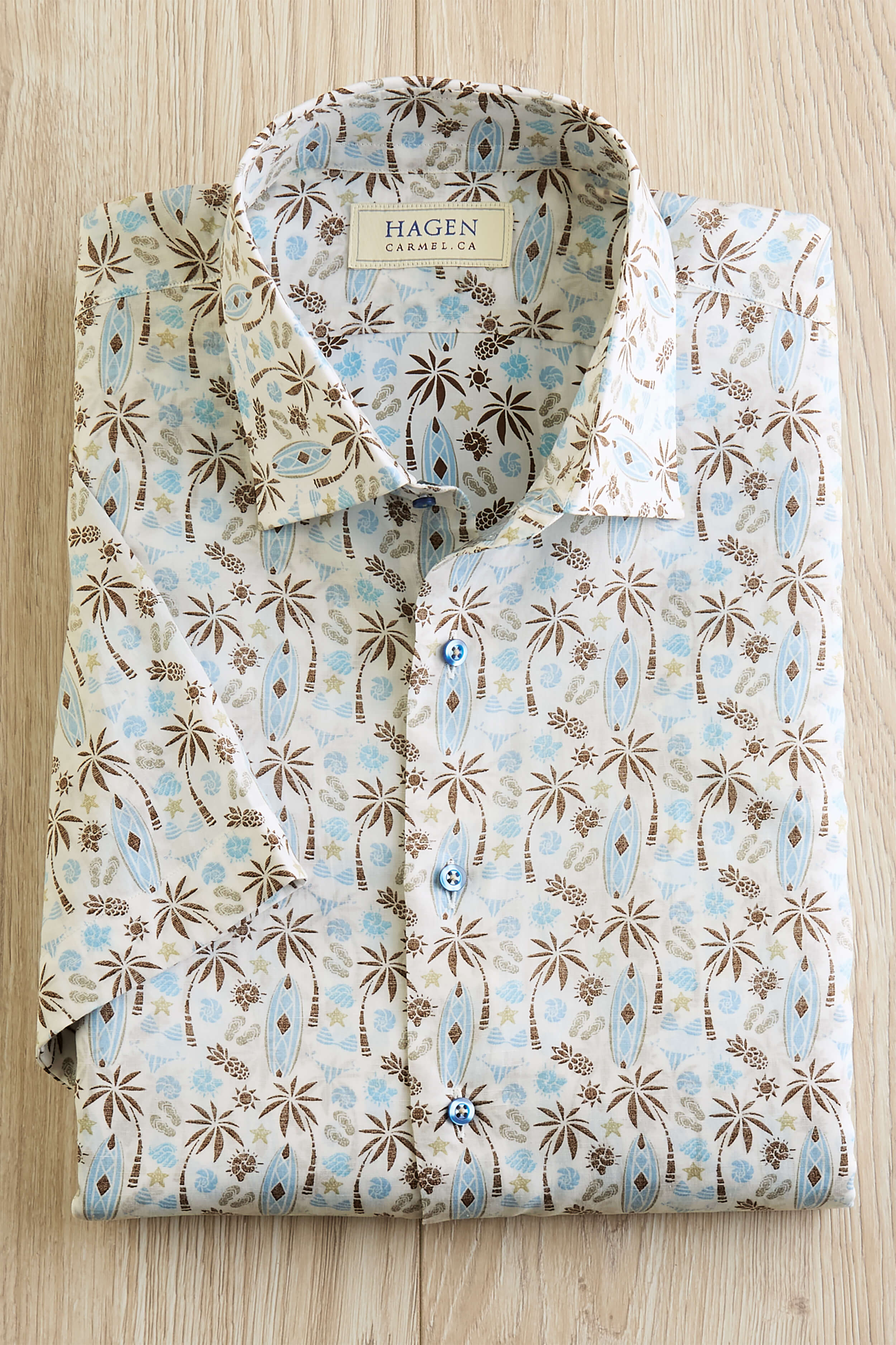 Beachy print on cool, soft-washed linen. Short sleeves, spread collar, straight hem.