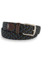 Braided Italian saddle leather and elastic strap with waxy bridle leather trim. Polished nickel finish hardware. 100% rayon strap with Scotch grain leather trim. Handcrafted in America. 1-3/8" wide.