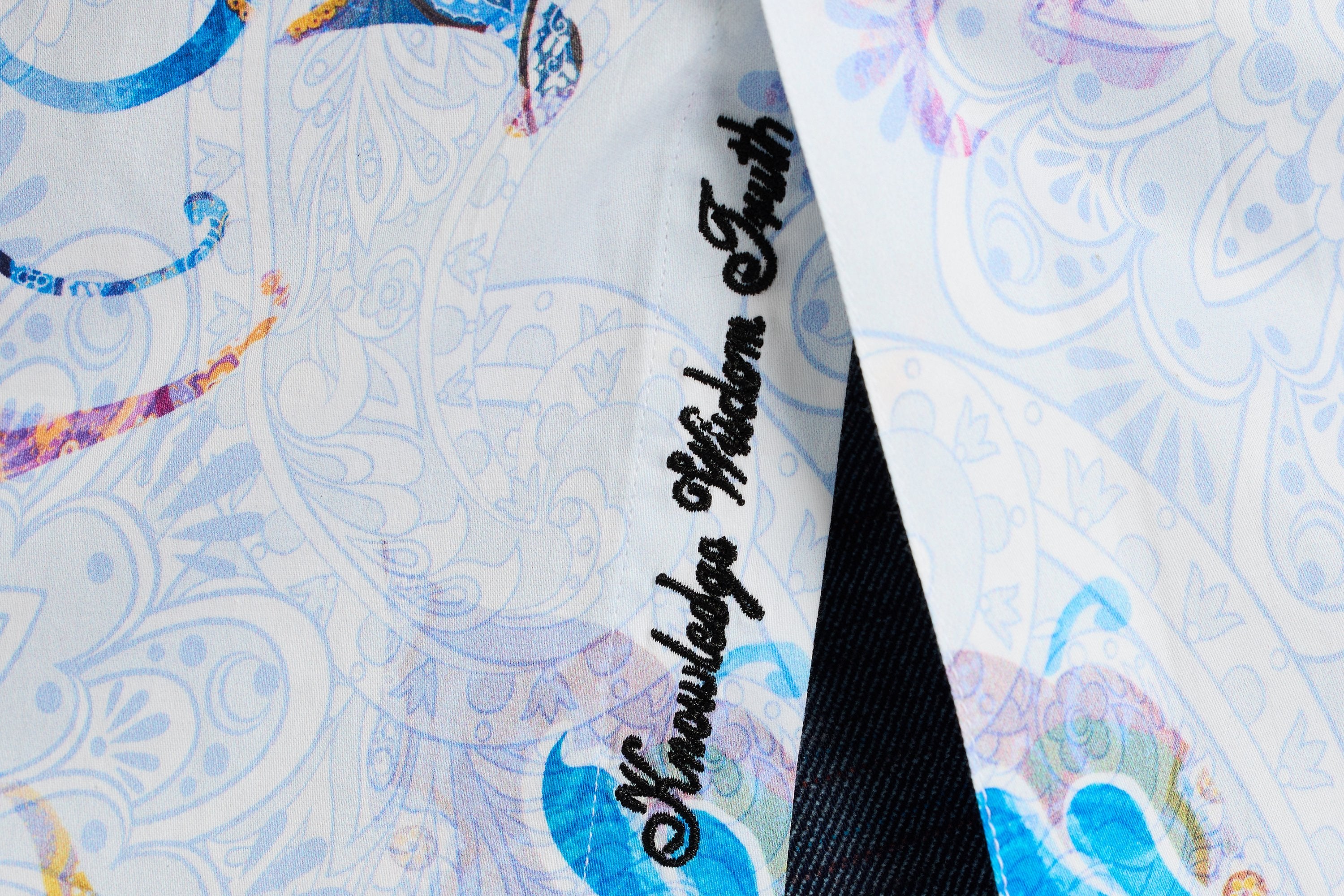 - Contrast print at collar and cuff