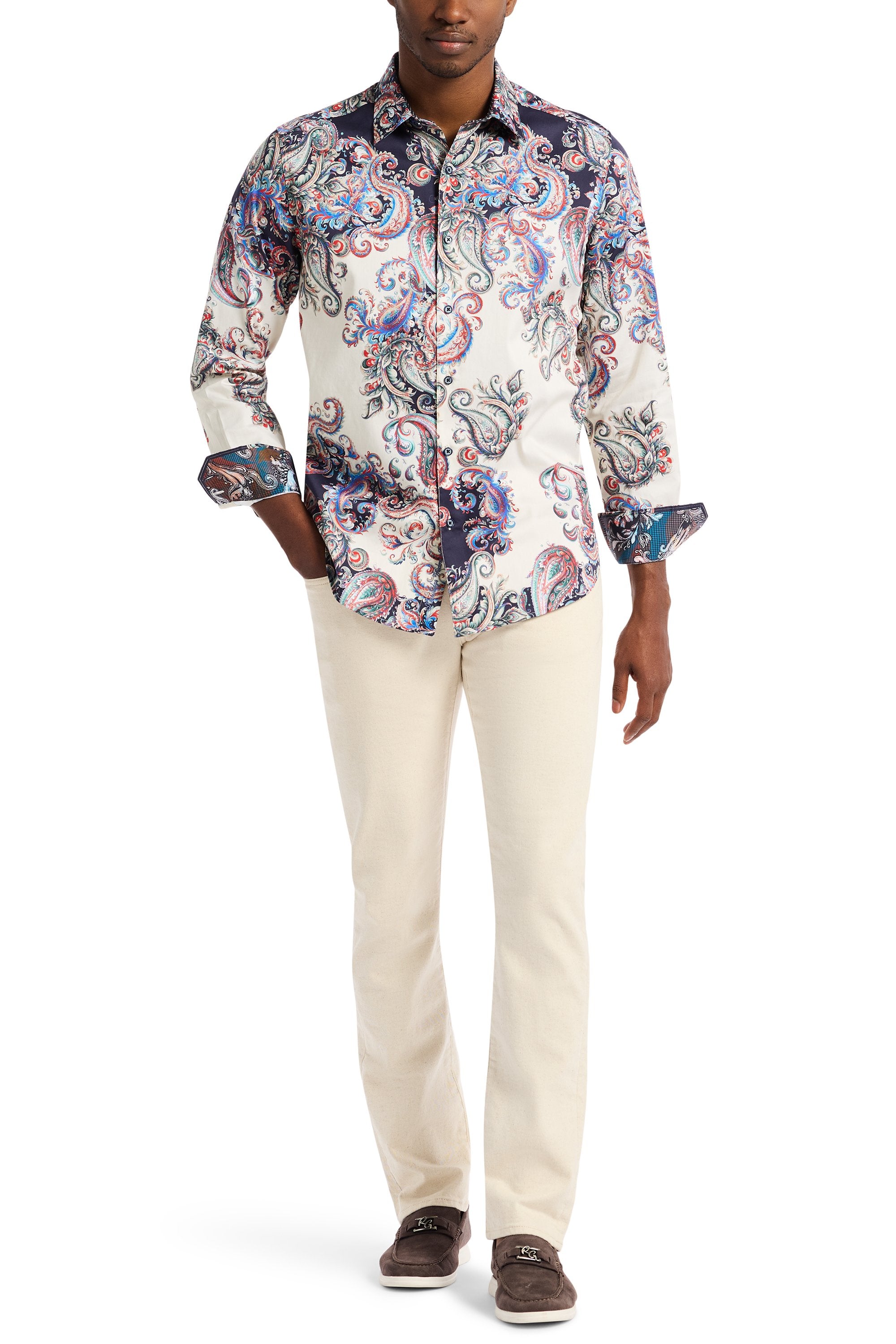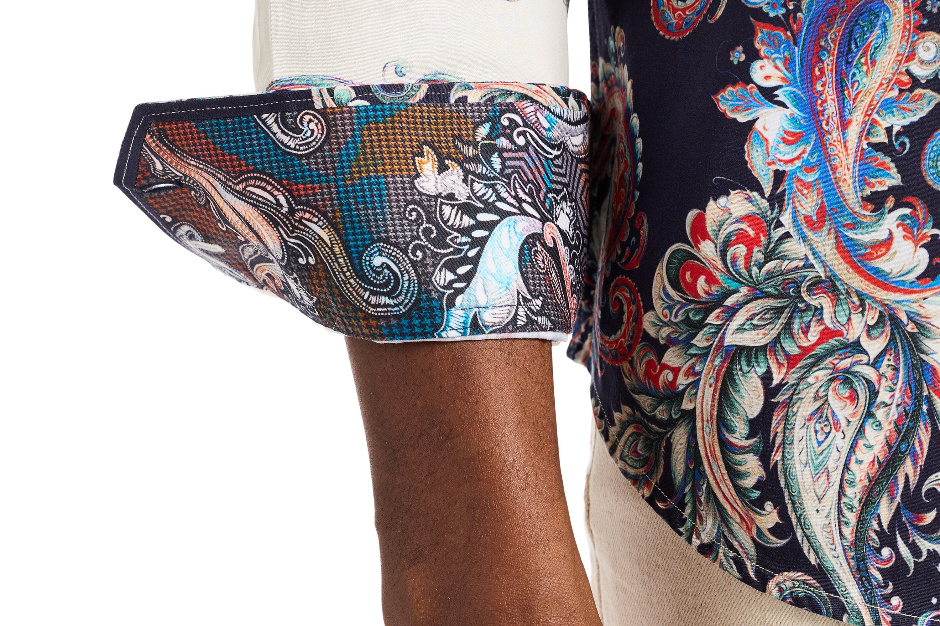 Surprise and delight with this eye-catching button-down. Whimsical paisleys dance across a rich ivory and navy backdrop, adding a playful twist to a classic pattern. The vibrant design effortlessly blends sophistication with fun, making it the perfect standout piece for any event. Whether dressing up or down, this shirt guarantees you'll turn heads wherever you go.