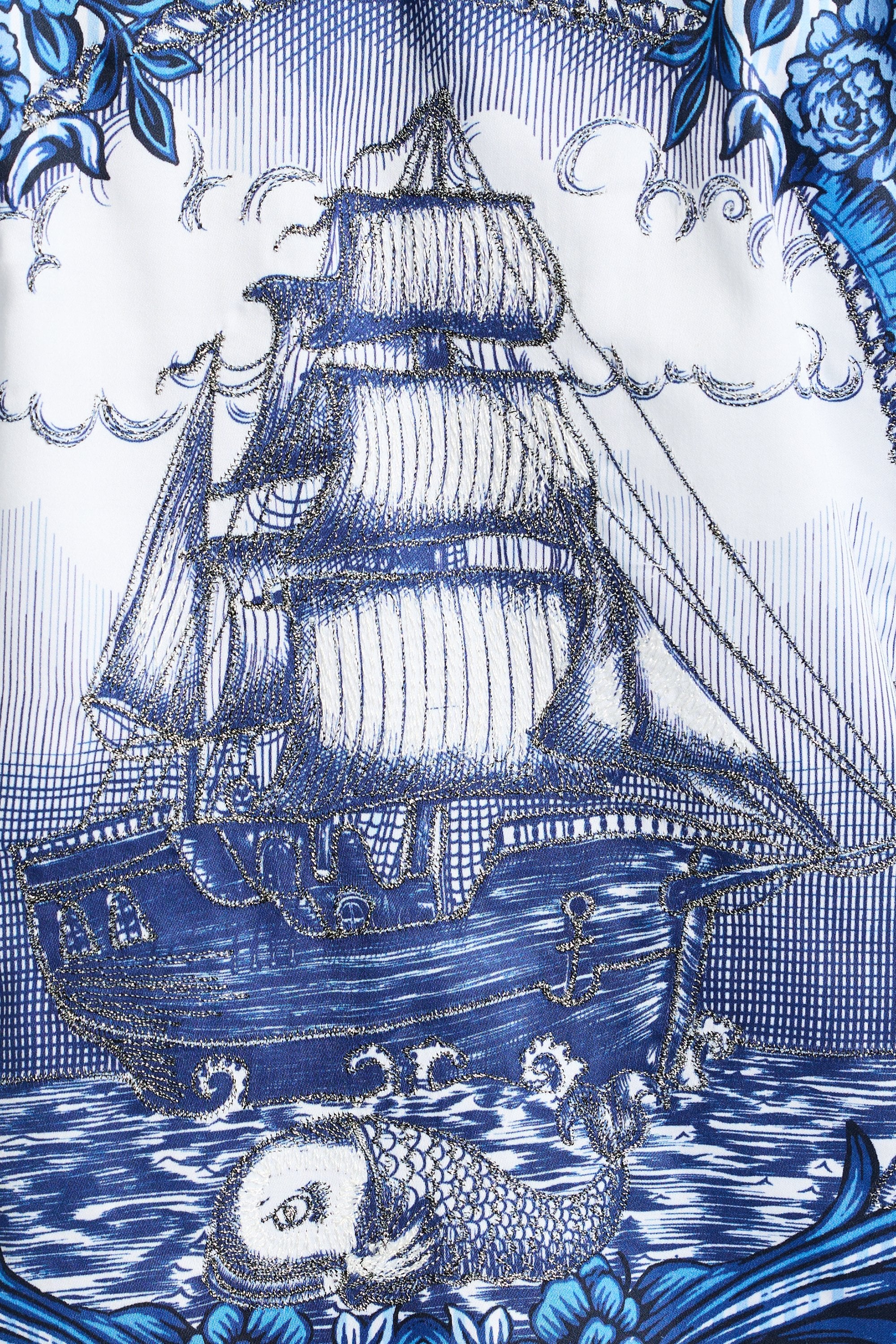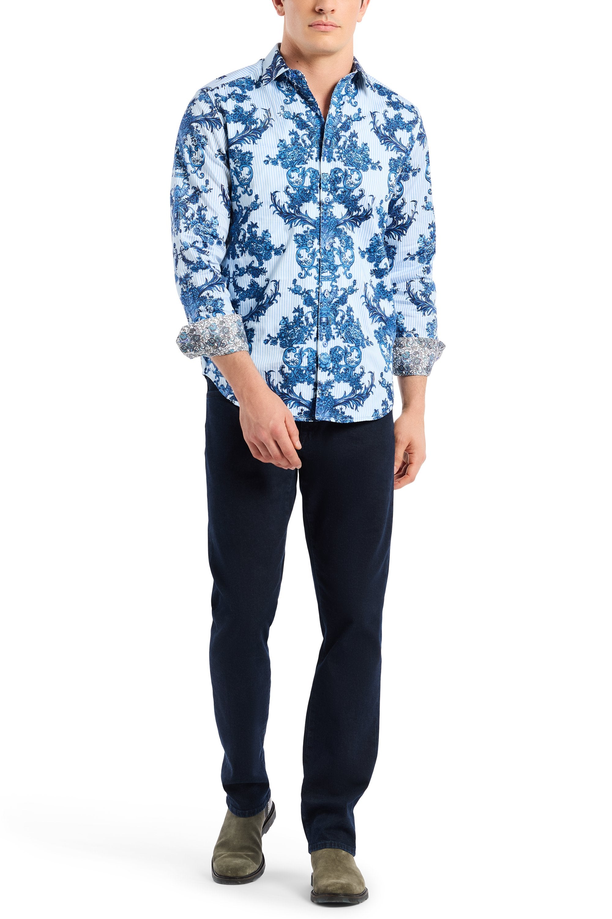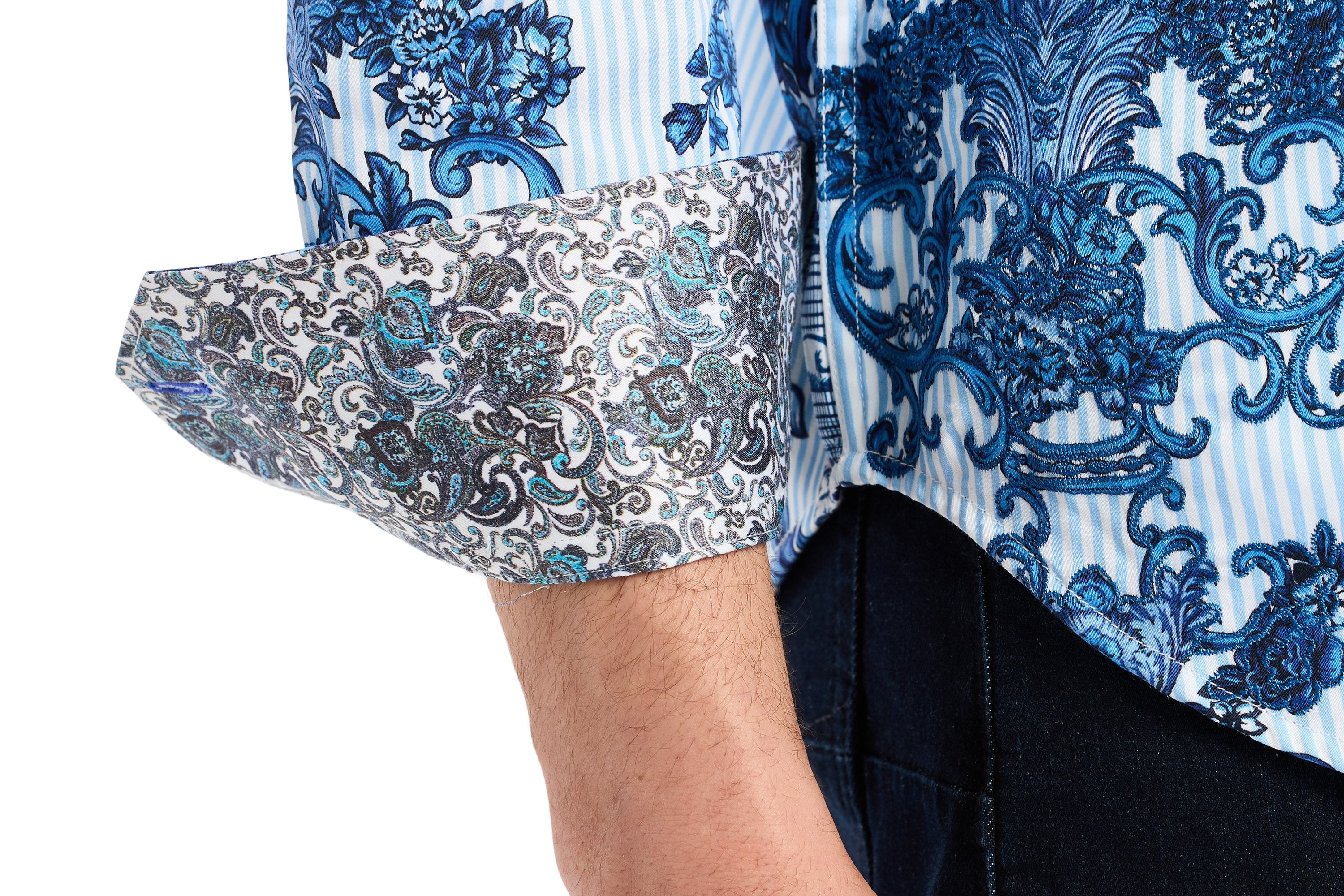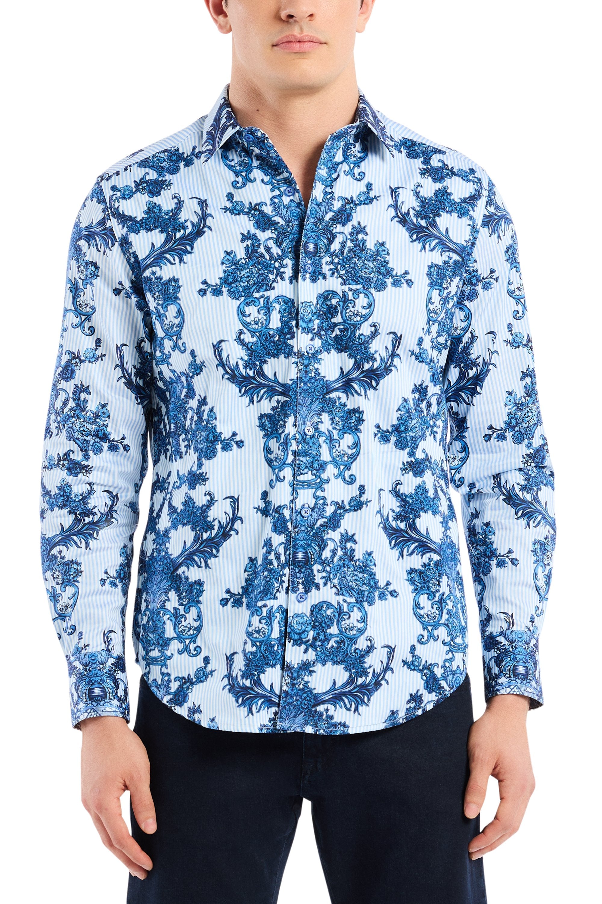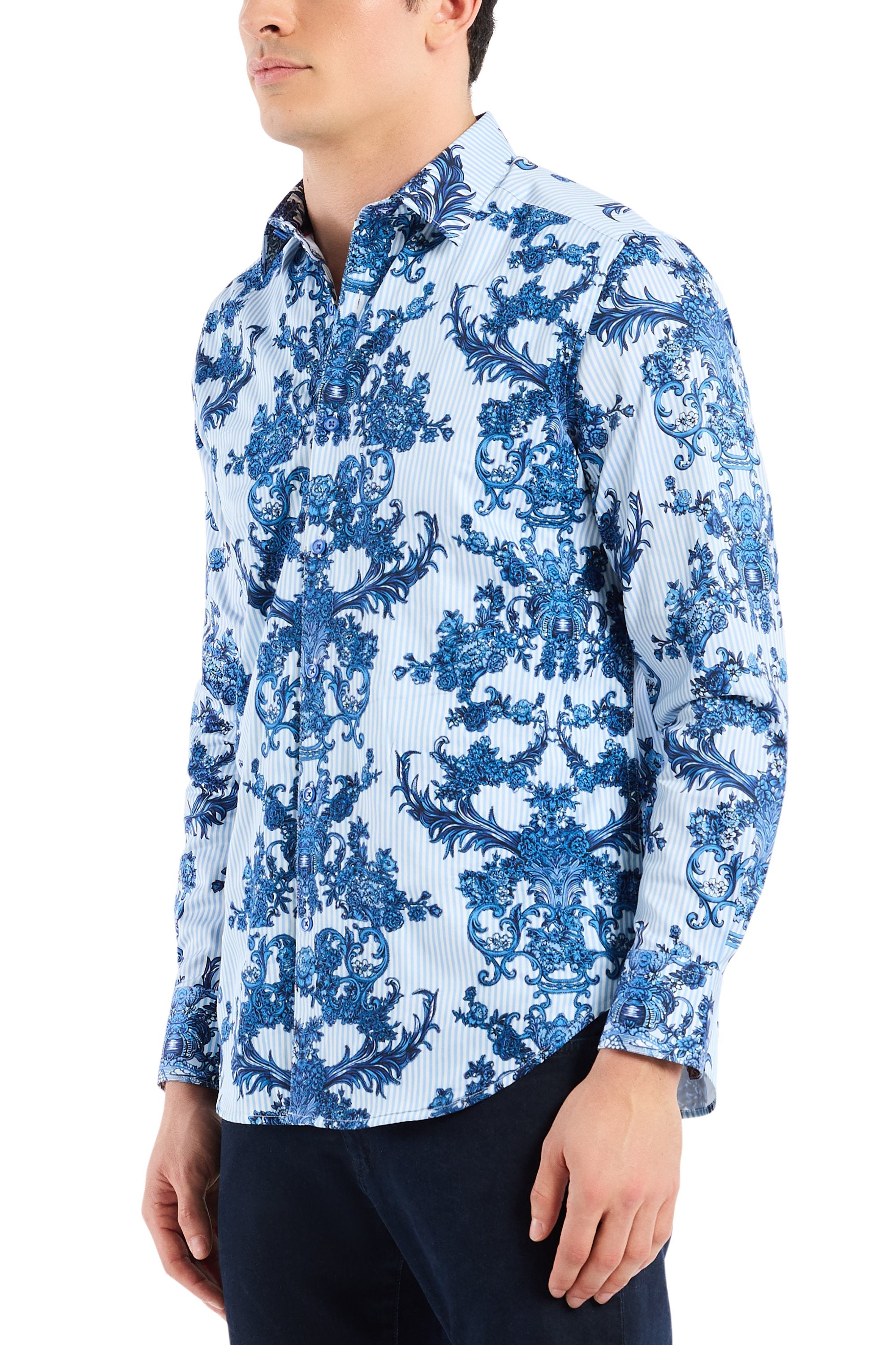 This unique take on a classic striped shirt is designed to steal the spotlight at your next event. An allover scroll and floral print takes over the entire style, adding depth and texture to the design. Turn around, and you’ll find a nautical tale of high-seas adventure, while tropical flower accents hint at a dreamy escape to paradise. This shirt brings a fresh, dynamic edge to any occasion.