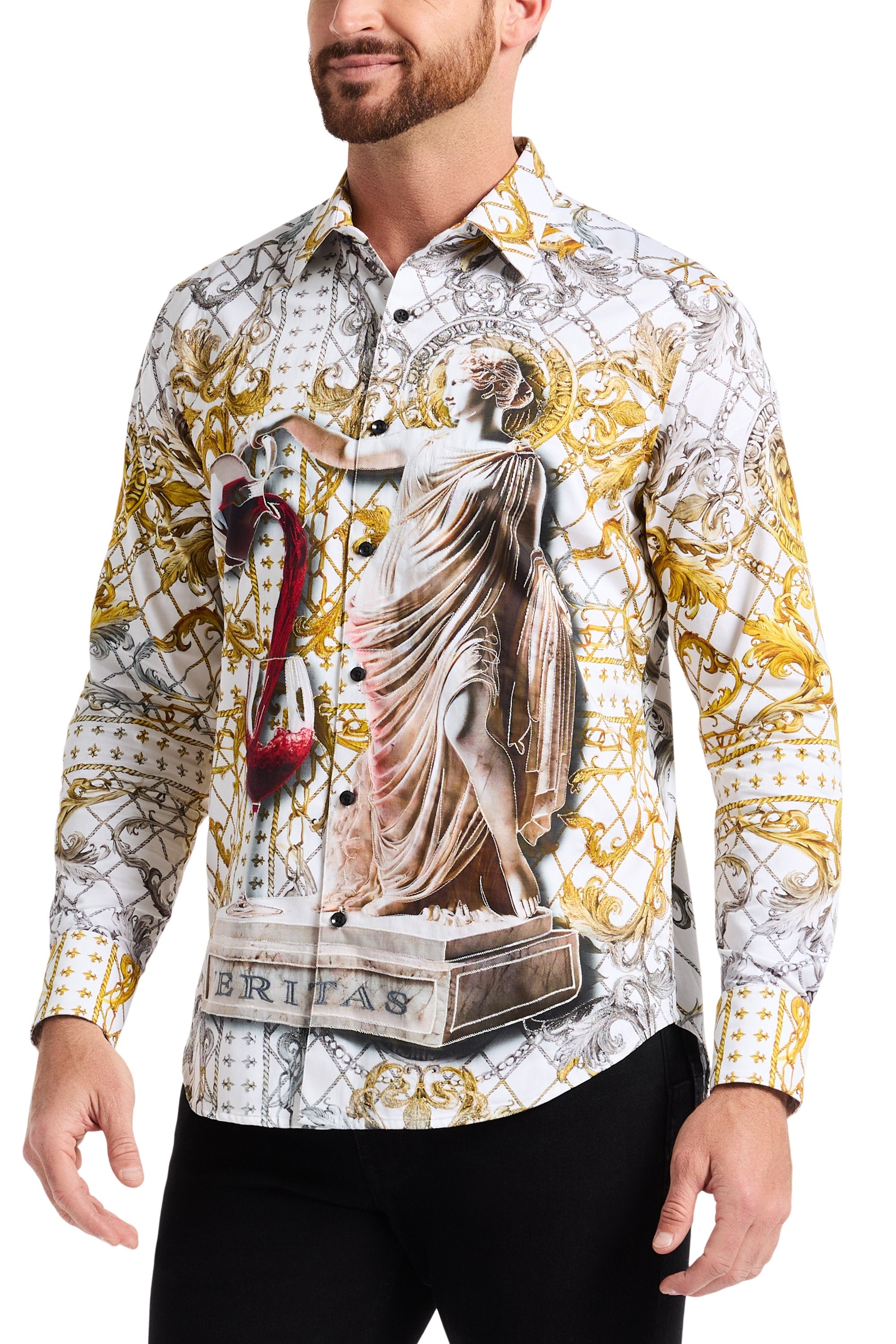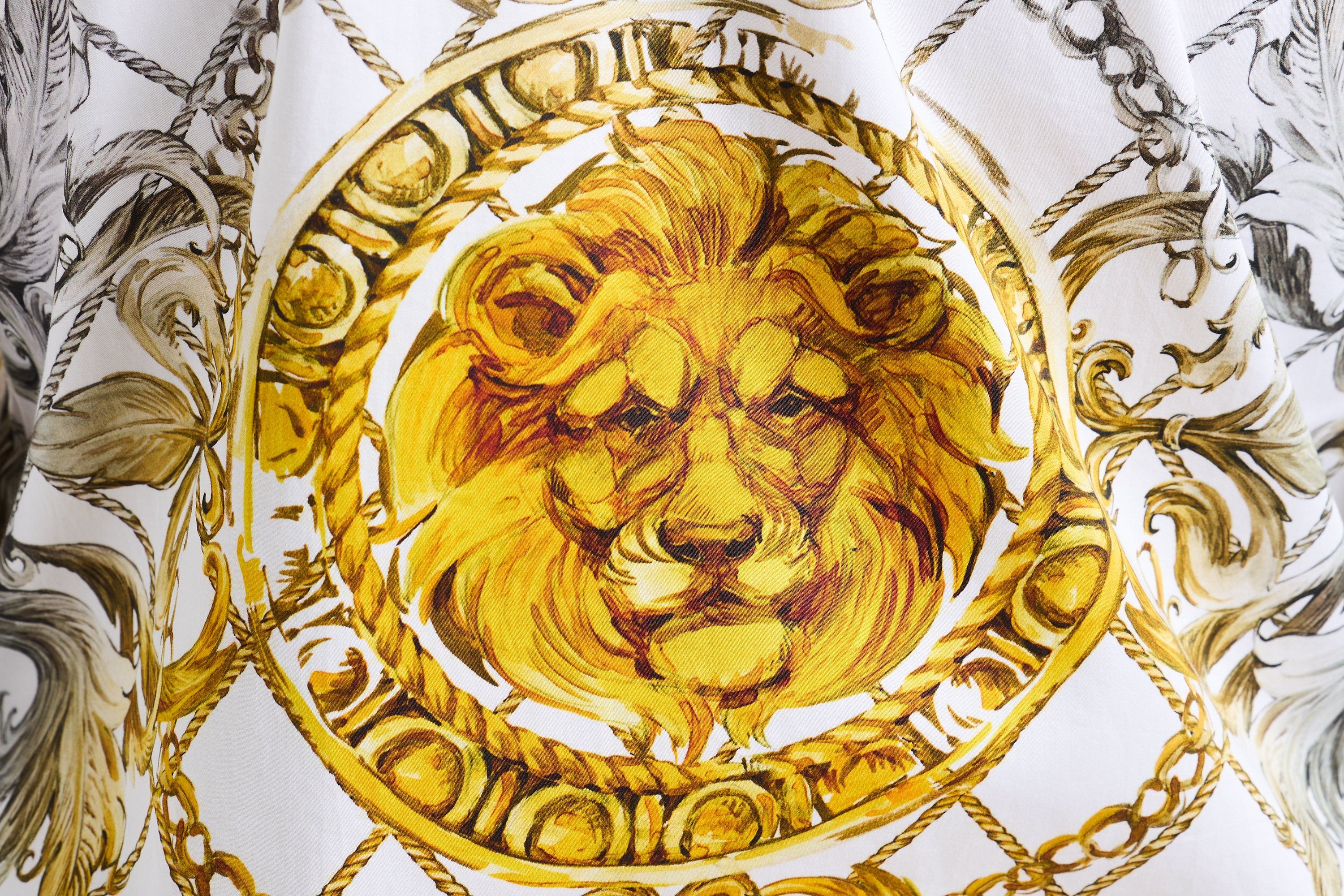 The Dionysian embodies the spirit of the Greek god of wine, with a design that evokes grandeur and decadence. The shirt features a marble statue kicking off the debauchery by pouring red wine into a glass. Set against a luxurious golden scroll pattern, this style boasts silver and golden metallic embroidery that enhances the intricate details. At the back a striking golden lion head commands attention. A bold, sophisticated piece that brings mythological elegance to modern style.