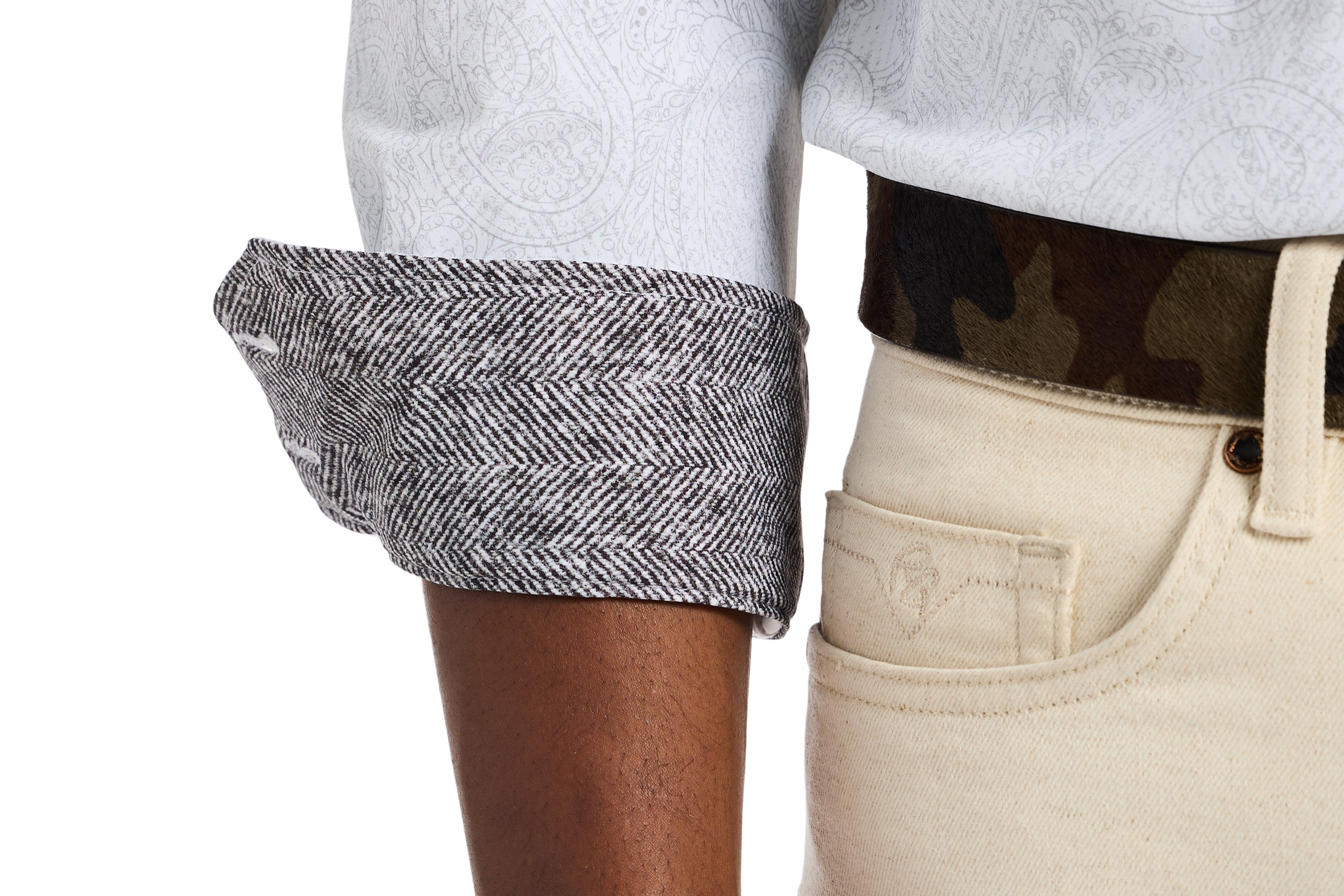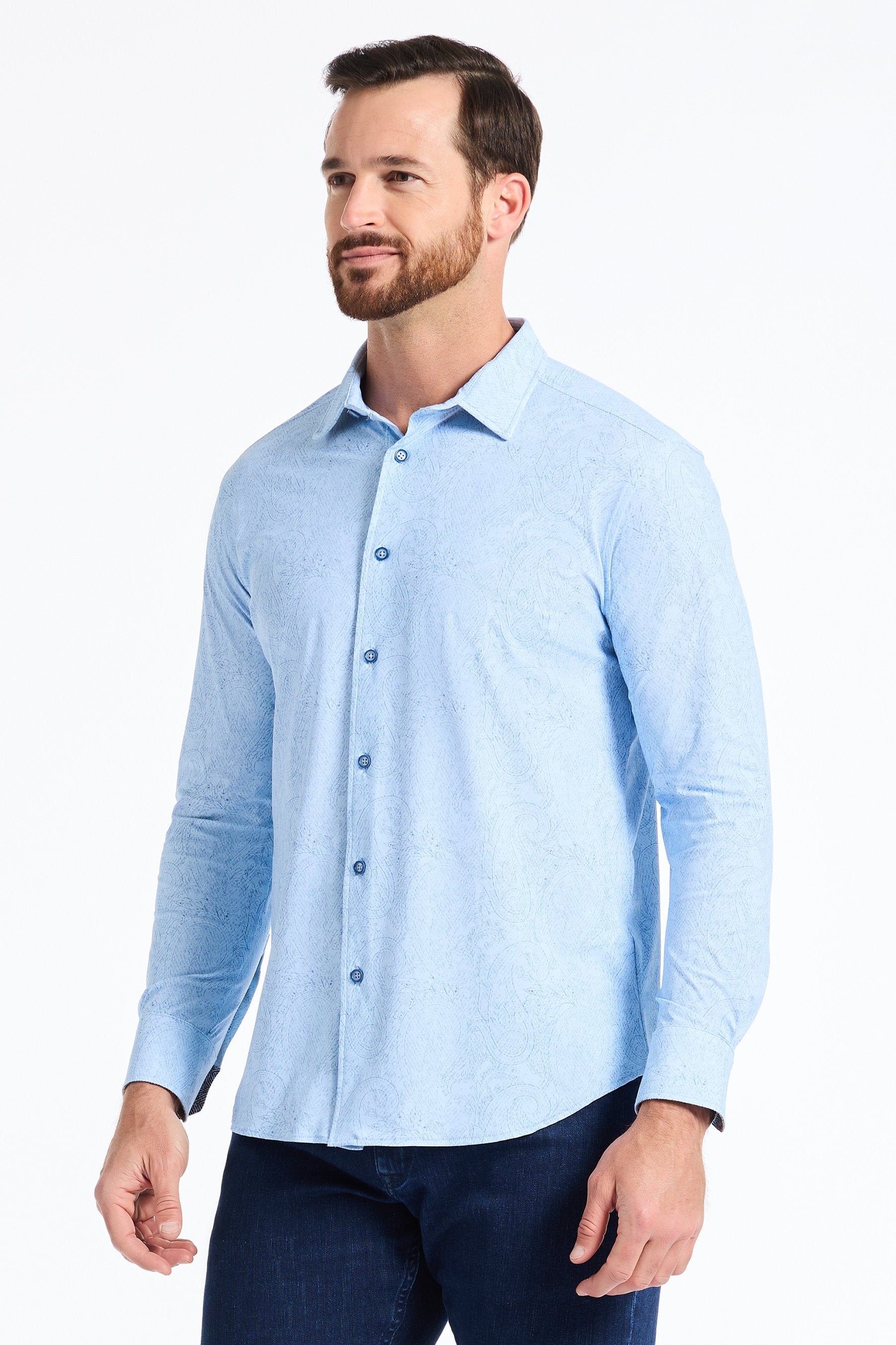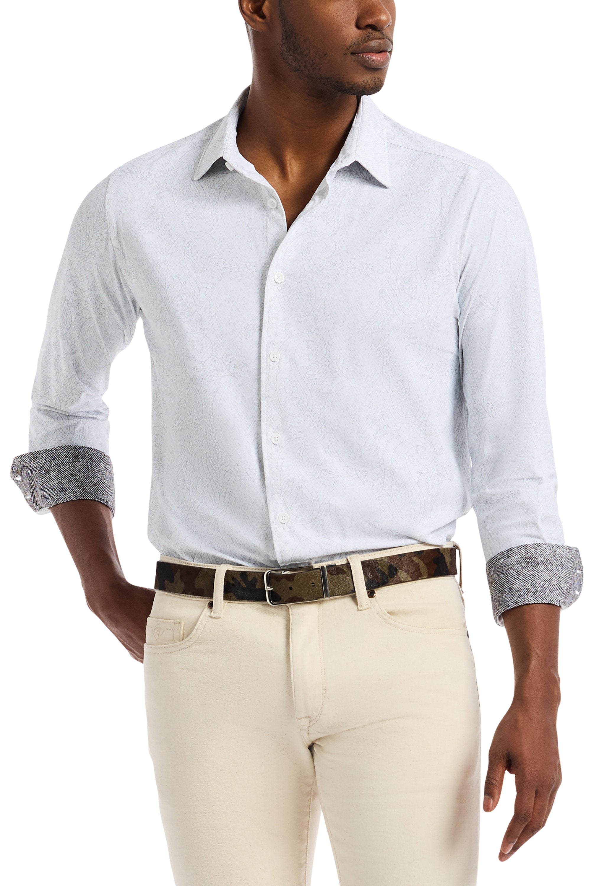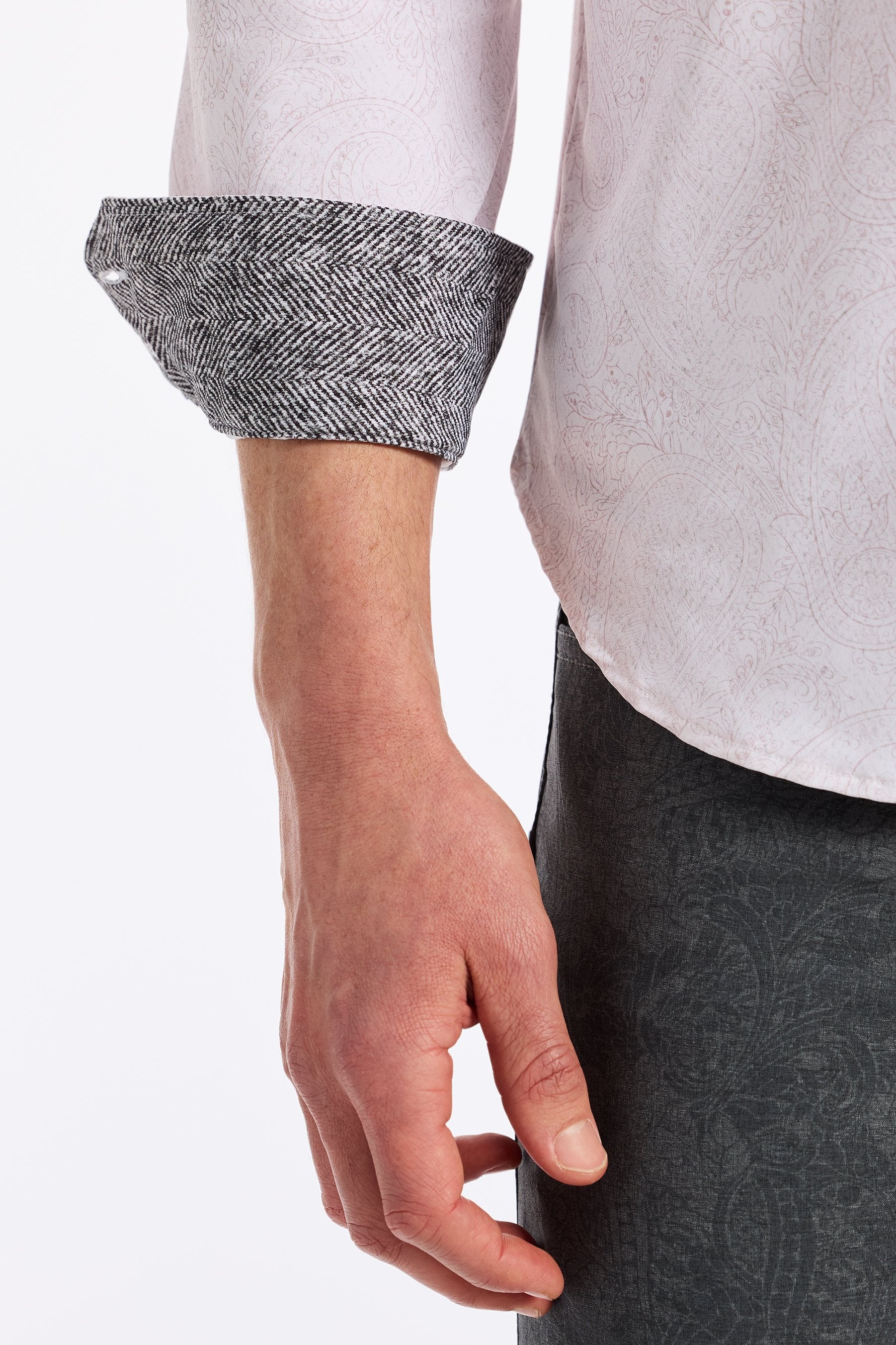 Elevate your wardrobe with the perfect blend of classic sophistication and contemporary style. This button down shirt is crafted from our popular motion fabric, giving it a hint of stretch for a comfortable fit that makes it ideal for both workdays and weekends. The subtle paisley print adds a touch of timeless elegance, while the true style comes to life when you pop the collar or roll the cuffs, revealing a unique herringbone-inspired pattern that adds that RG finishing touch.