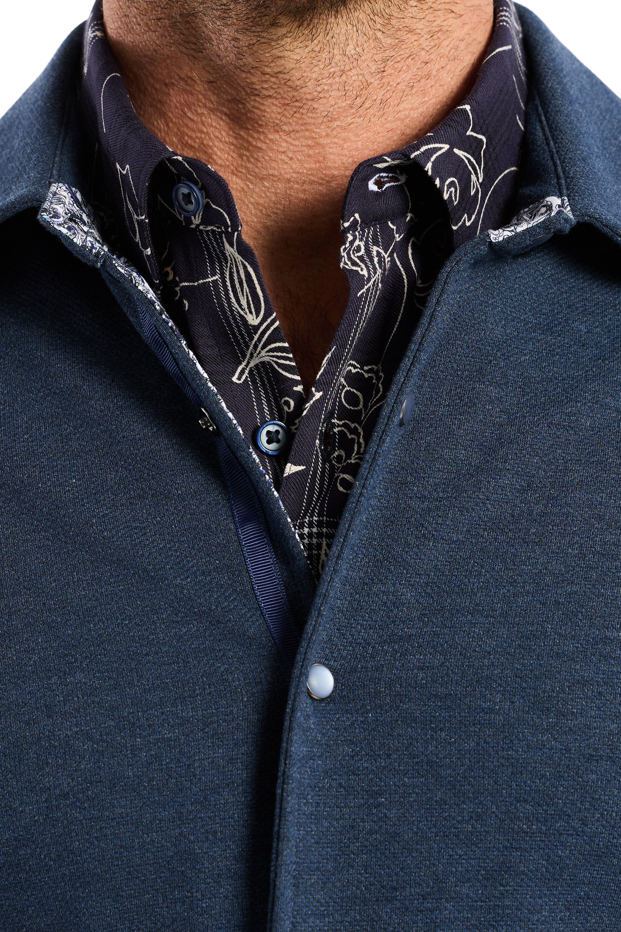 This textured jacquard knit shirt will easily become one of your favorite pieces this season. You'll love the heavyweight feel of the fabric and the sleek snap button front. Notice the half-moon pattern and the ribbon detail at the placket and cuff for just-there finishing touches.
