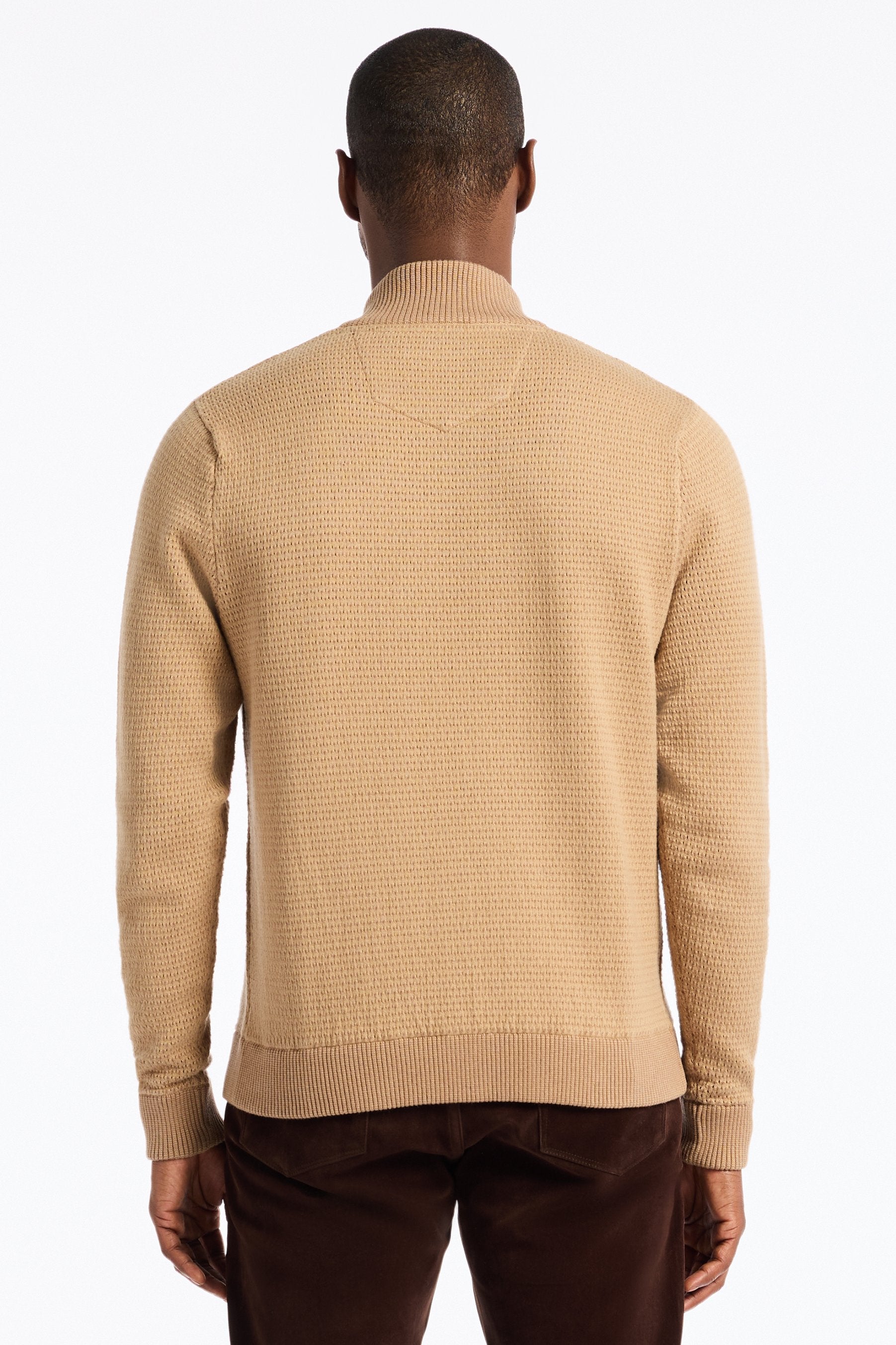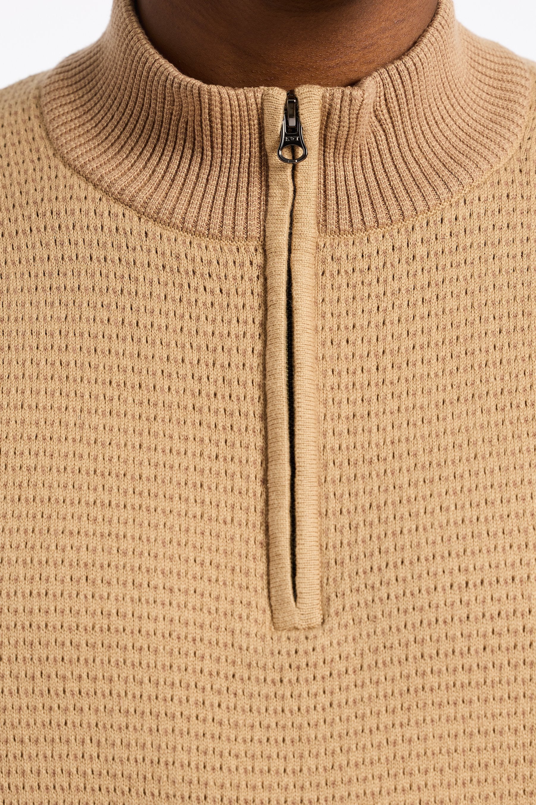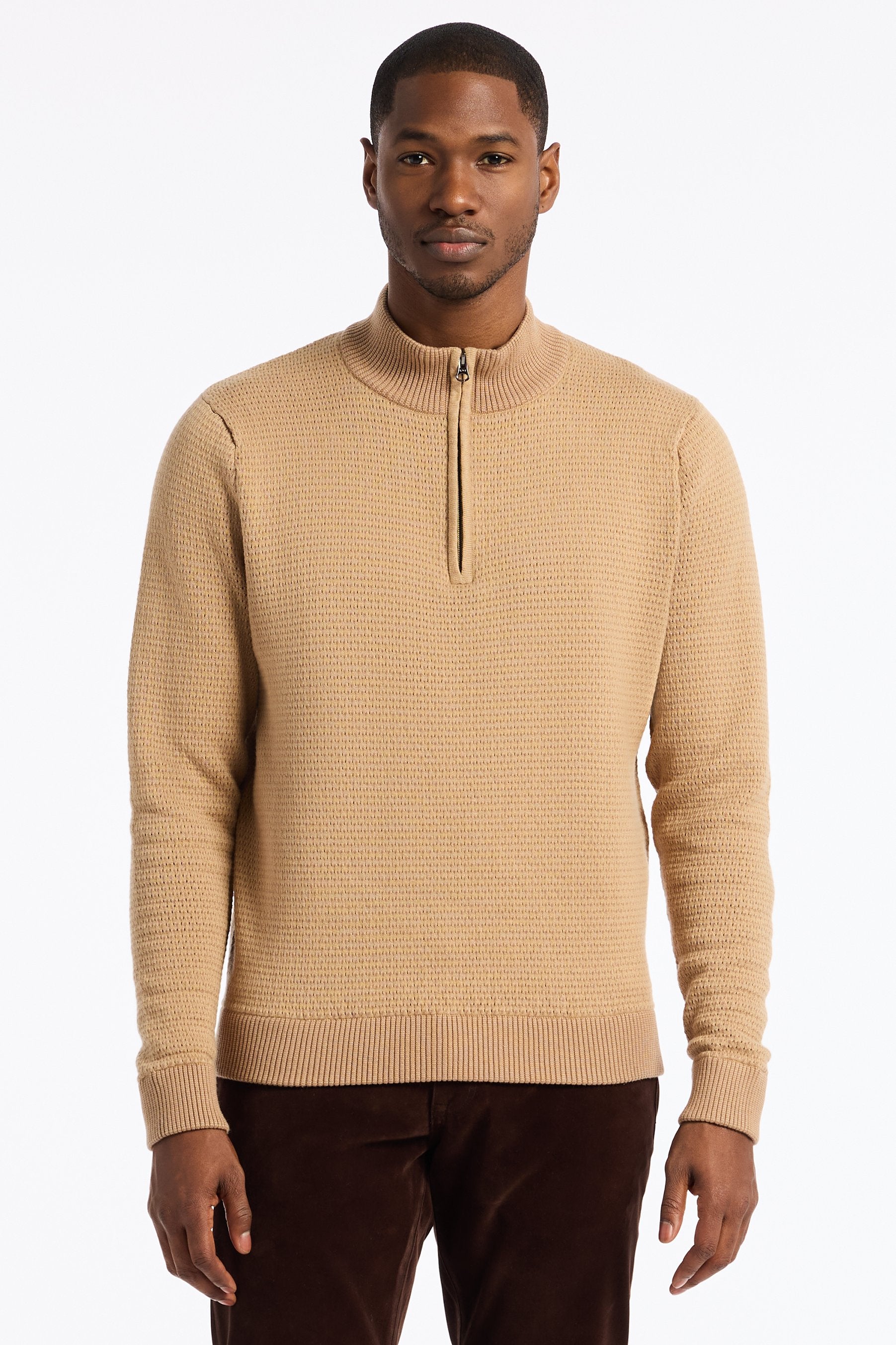 This quarter zip sweater combines simplicity with subtle sophistication. The ultra-soft style is enhanced by a slight textured finish, giving the piece a refined yet relaxed feel. Ribbed details at the collar, cuffs, and hem add a touch of structure, making it a versatile and comfortable choice for layering or wearing on its own.
